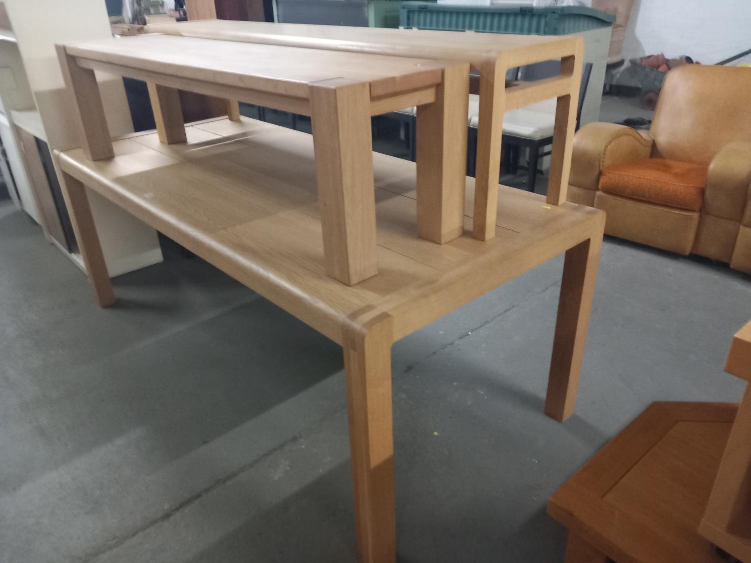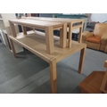 A pine dining table and two pine benches