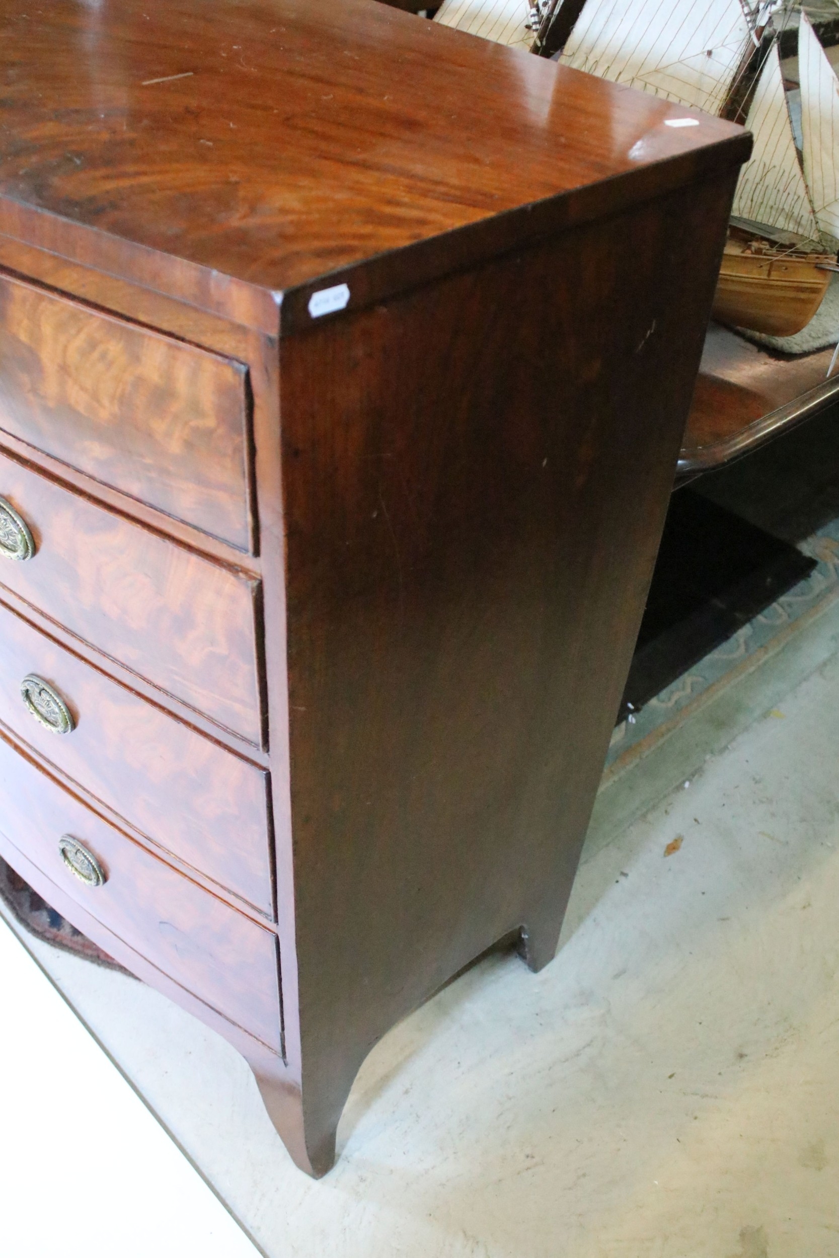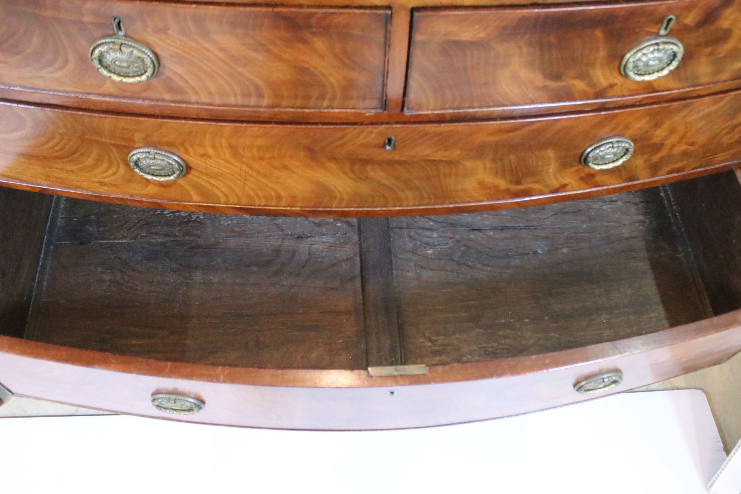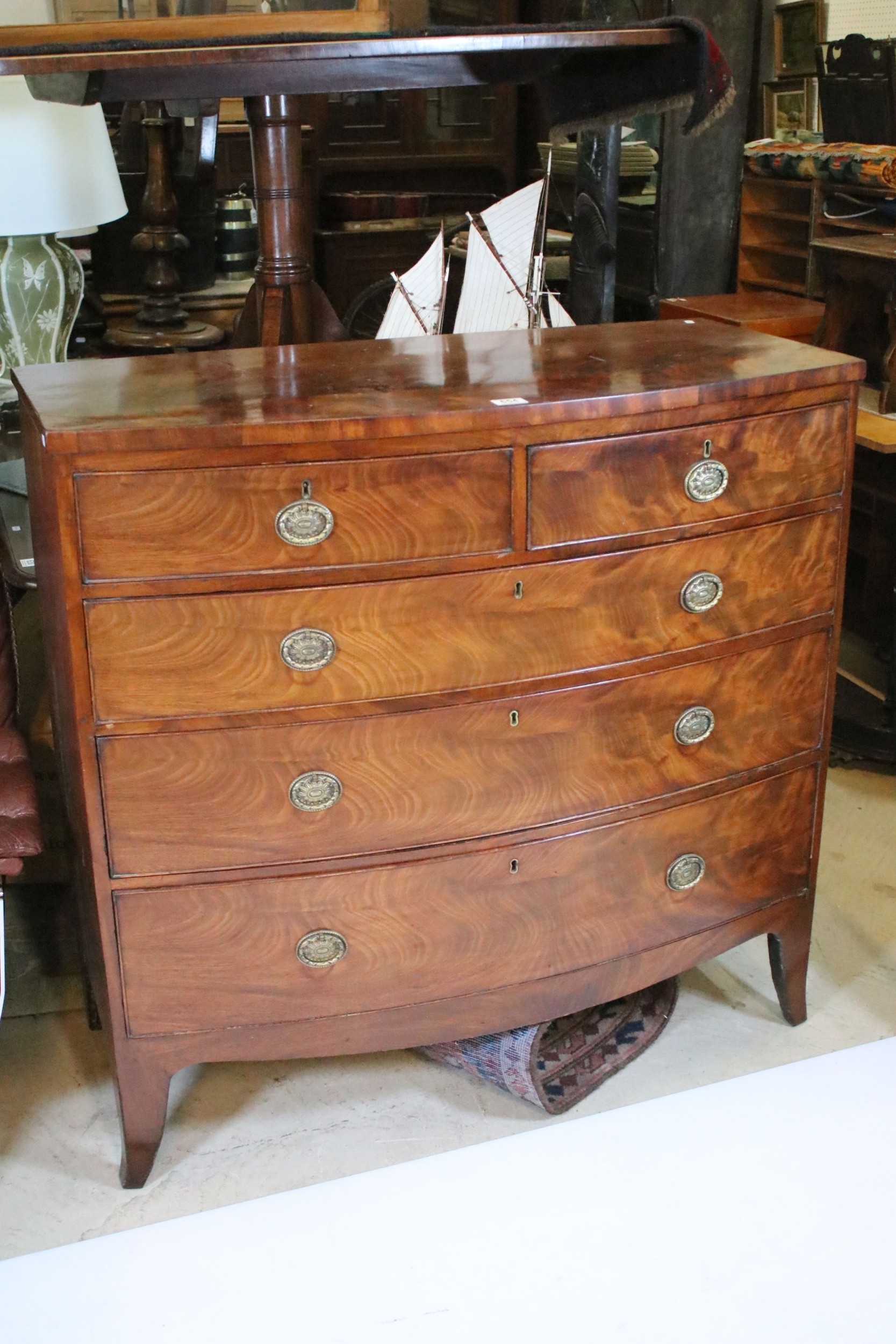 Georgian mahogany bow fronted chest of drawers, having two short on three long drawers with figured veneer, raised on shaped apron and splayed legs, W 106cm x D 51cm x H 104cm