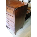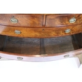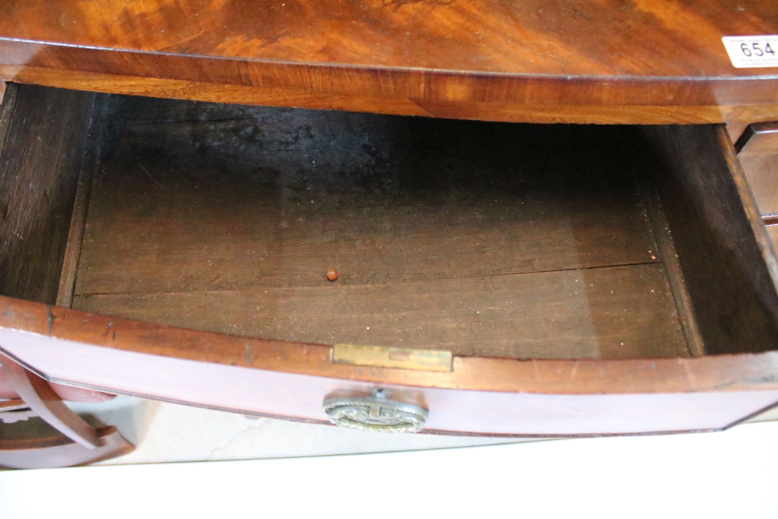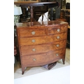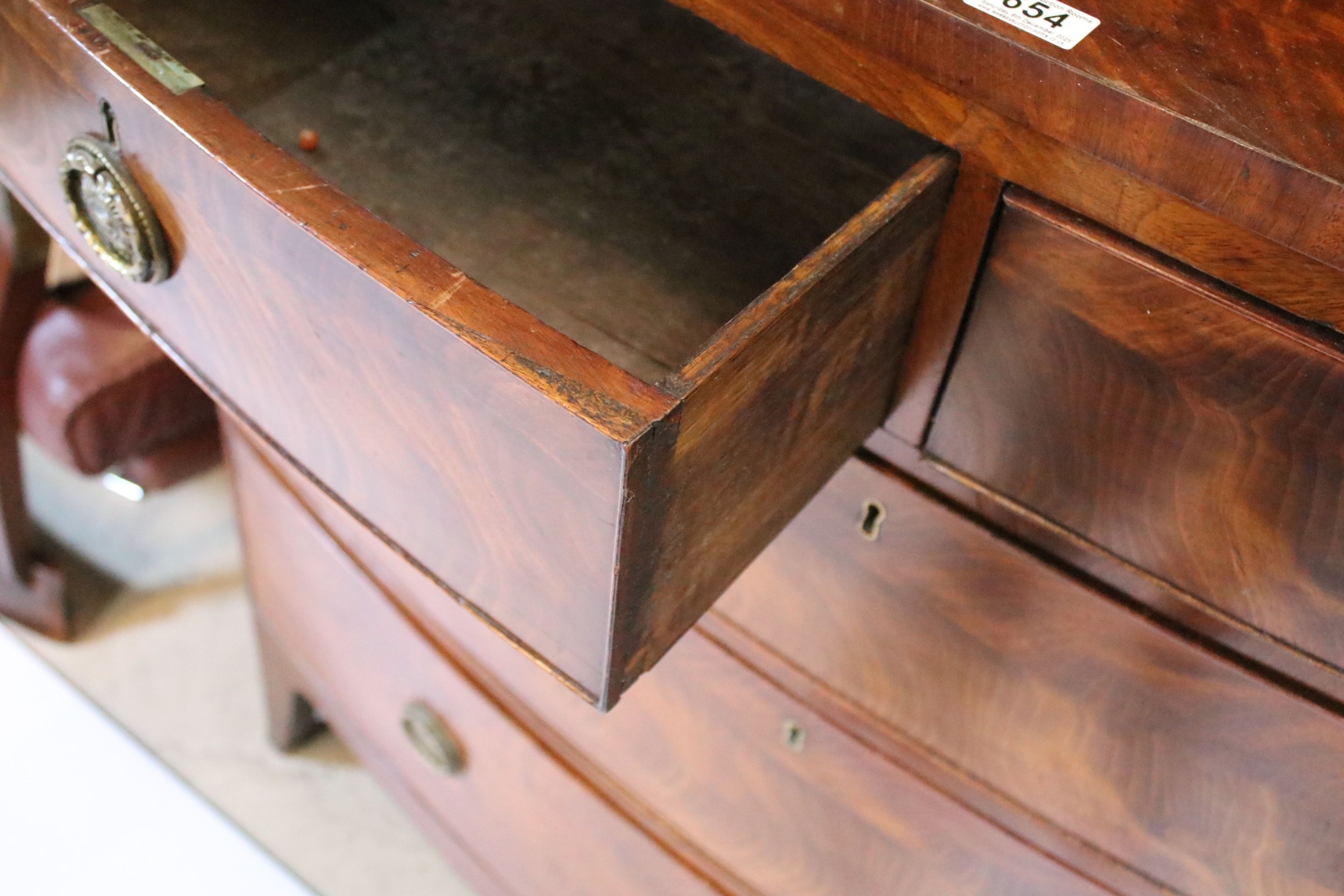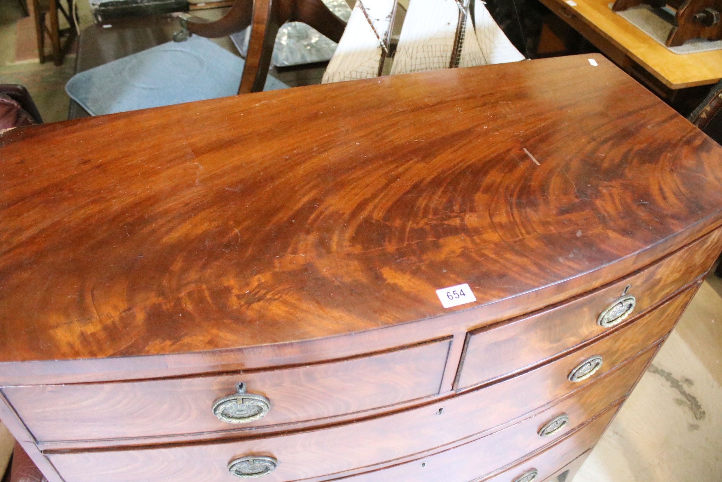 Georgian mahogany bow fronted chest of drawers, having two short on three long drawers with figured veneer, raised on shaped apron and splayed legs, W 106cm x D 51cm x H 104cm