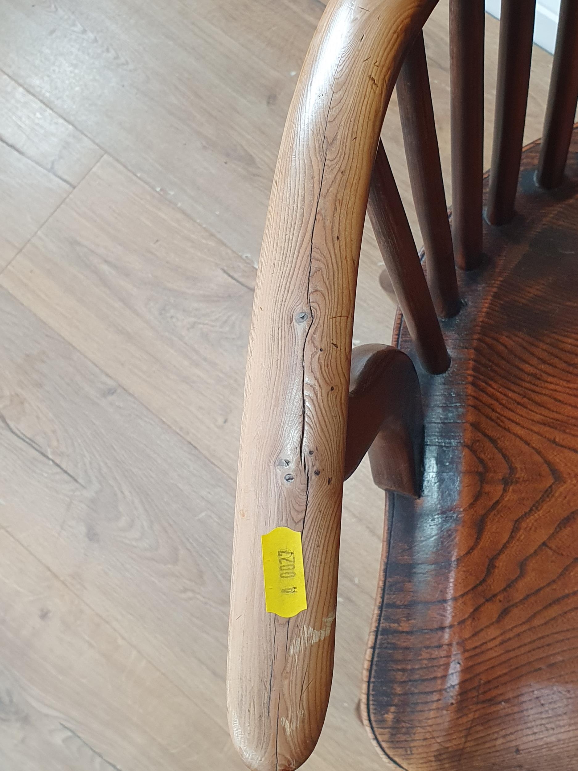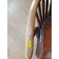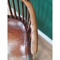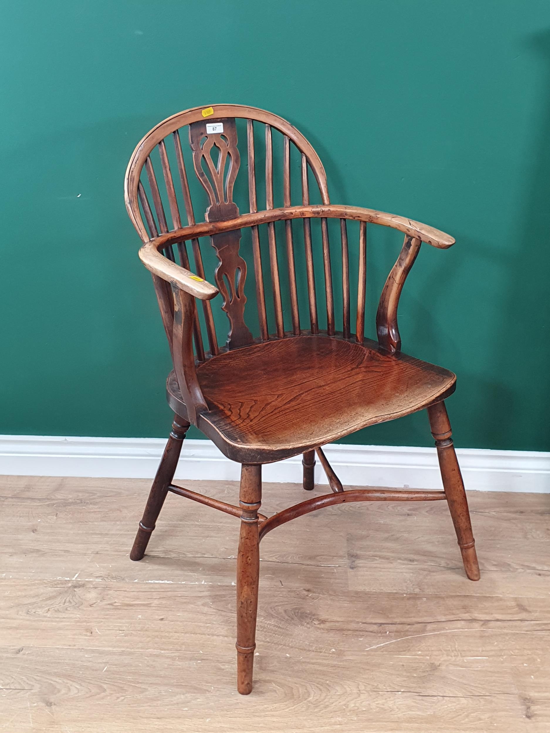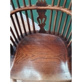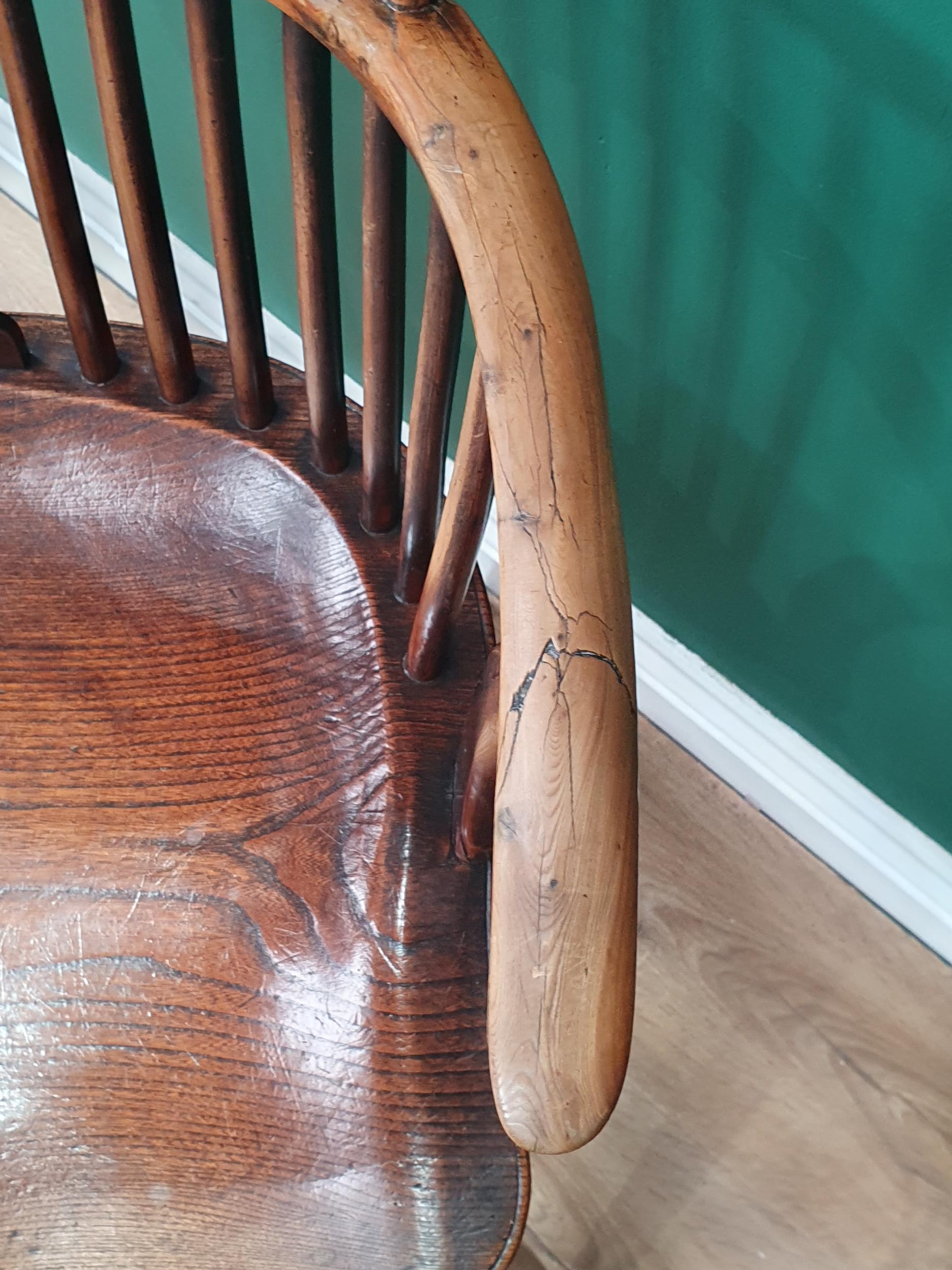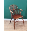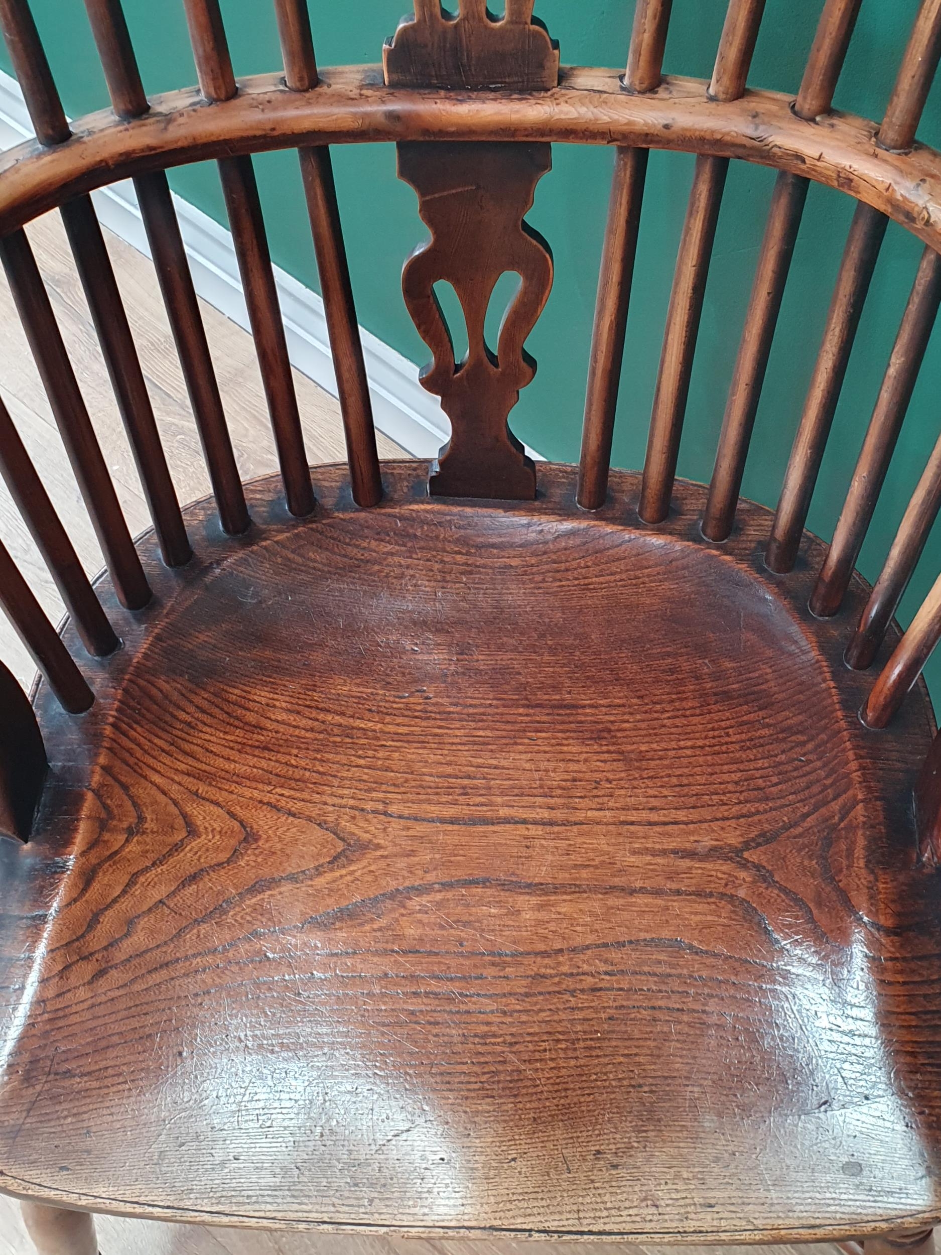An antique yew and elm Windsor Elbow Chair with shaped pierced splat, raised on turned supports united crinoline stretcher. (R4).