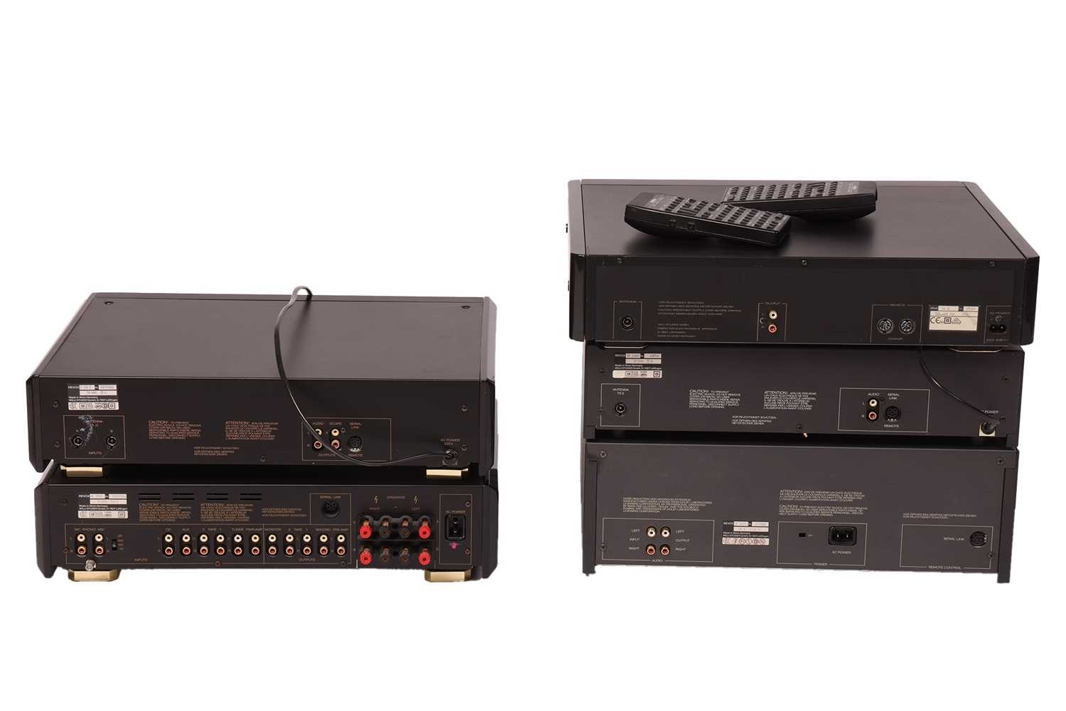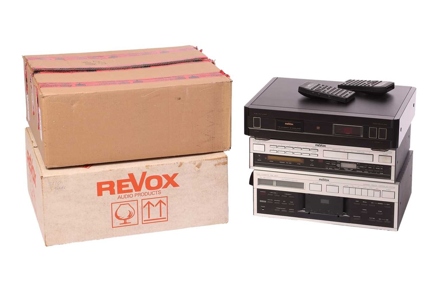 A collection of Revox Hi-Fi equipment, comprising: two B160 Tuners (one in original box), an H6 FM Tuner (unboxed), a B250-S Amplifier (boxed), and a B215 Cassette Deck. Private collection, deceased estate. Not tested as working. Good overall cosmetic condition, no further cables present. Two remotes are here, but possibly for different Revox products.