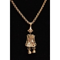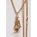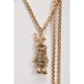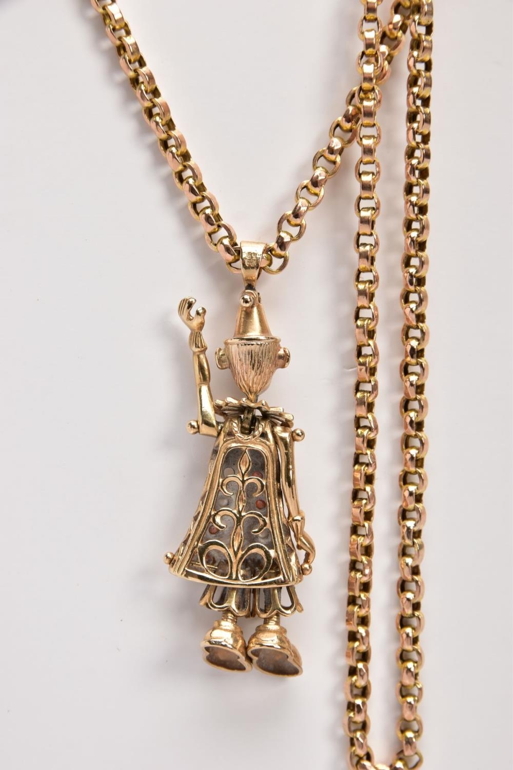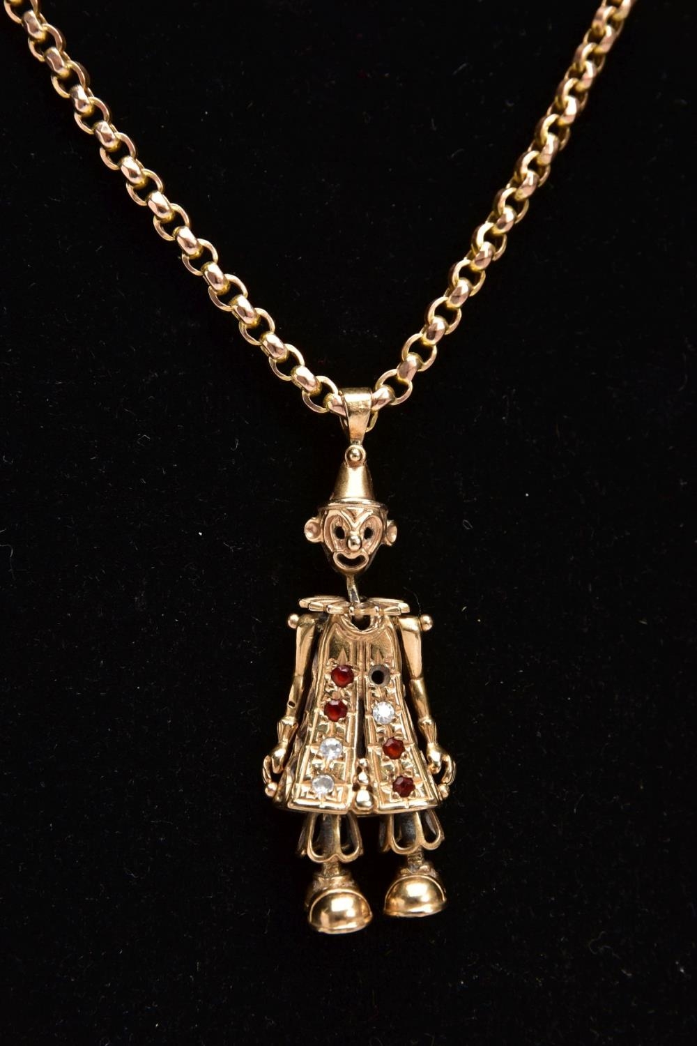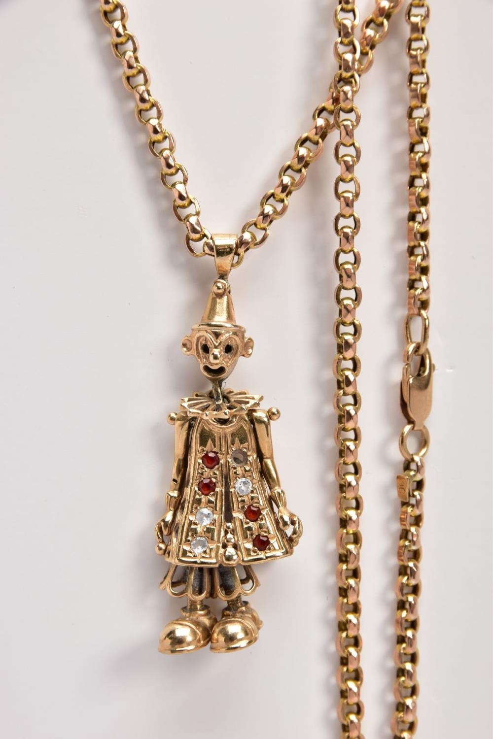 A 9CT GOLD, GEM SET CLOWN PENDANT AND CHAIN, the articulated clown pendant set with red and colourless paste to the body (one stone is missing), fitted with a tapered bail, hallmarked 9ct gold Birmingham, suspended from a belcher chain fitted with a lobster claw clasp, stamped '9ct', length 520mm, approximate gross weight 16.9 grams (condition report: general light wear, clasp in working condition, one stone is missing, overall condition good)