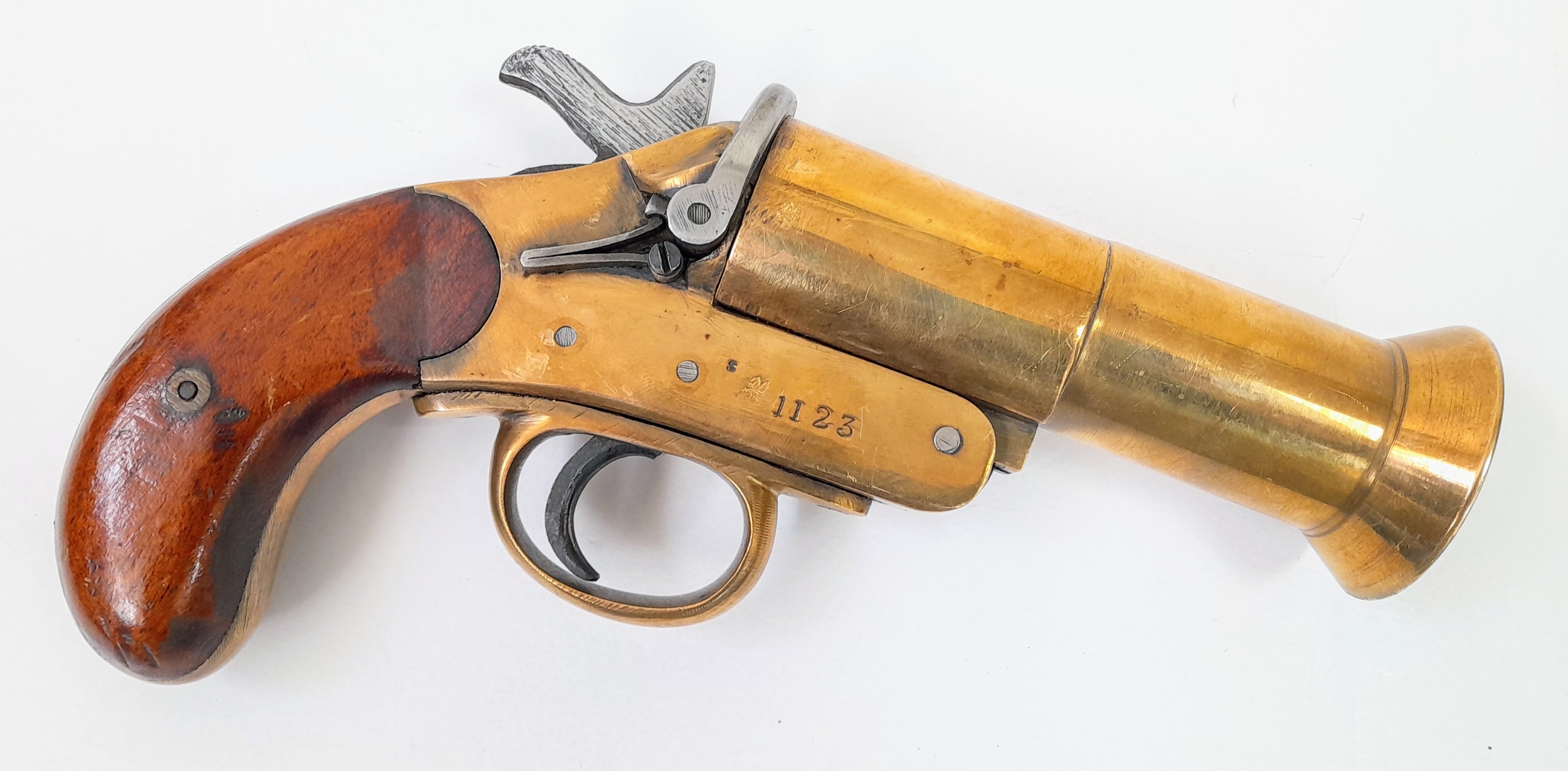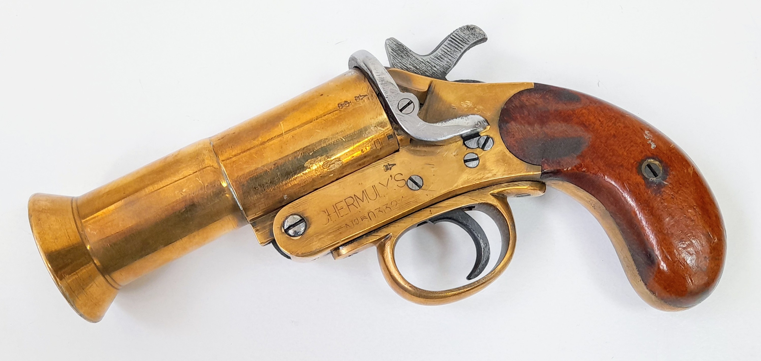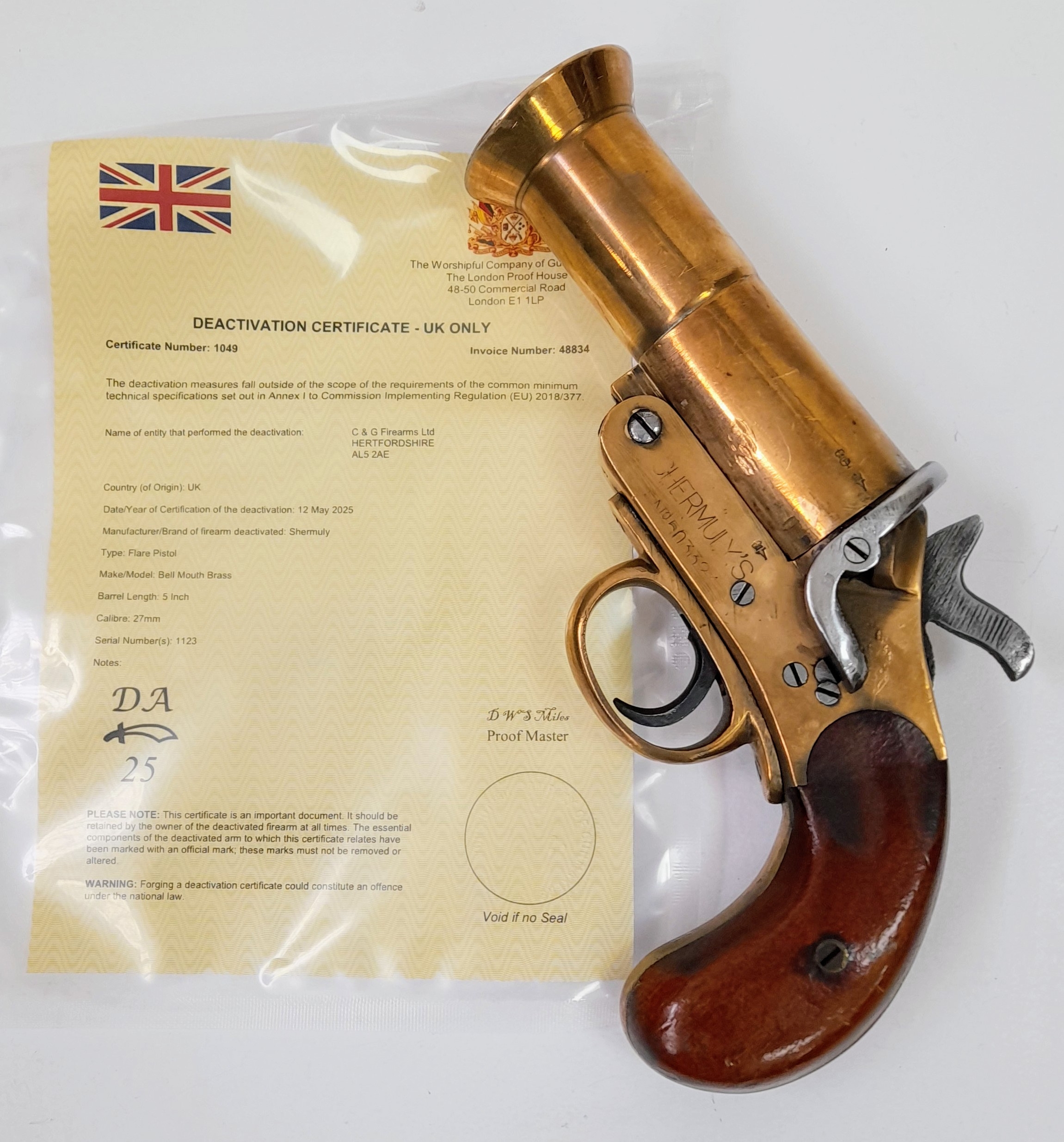 A deactivated Shermuly bell mouth brass single shot flare pistol, 5 inch barrel length, 27mm calibre. UK/EU sales only - Not Holland. Comes with an EU deactivation certificate.