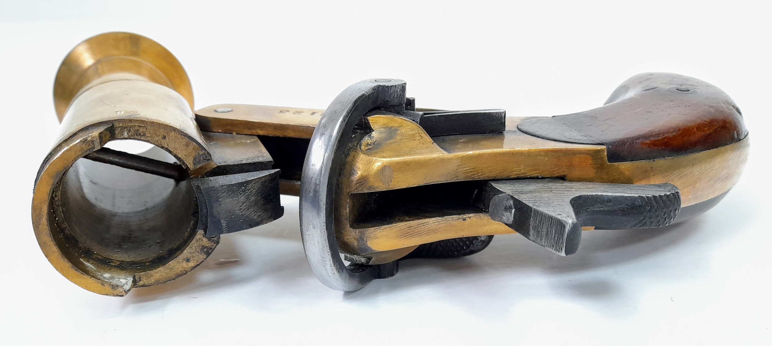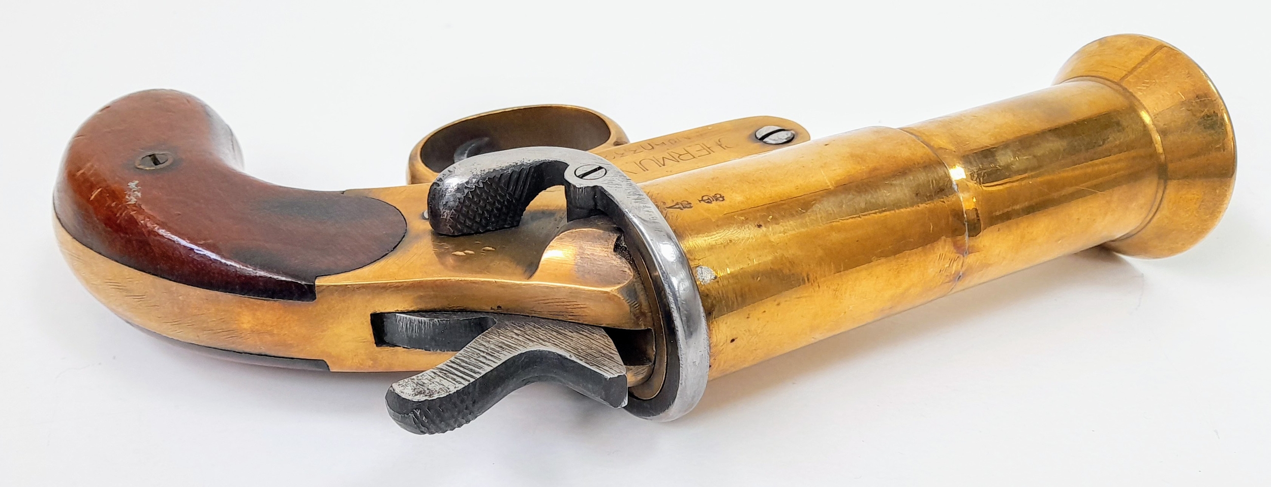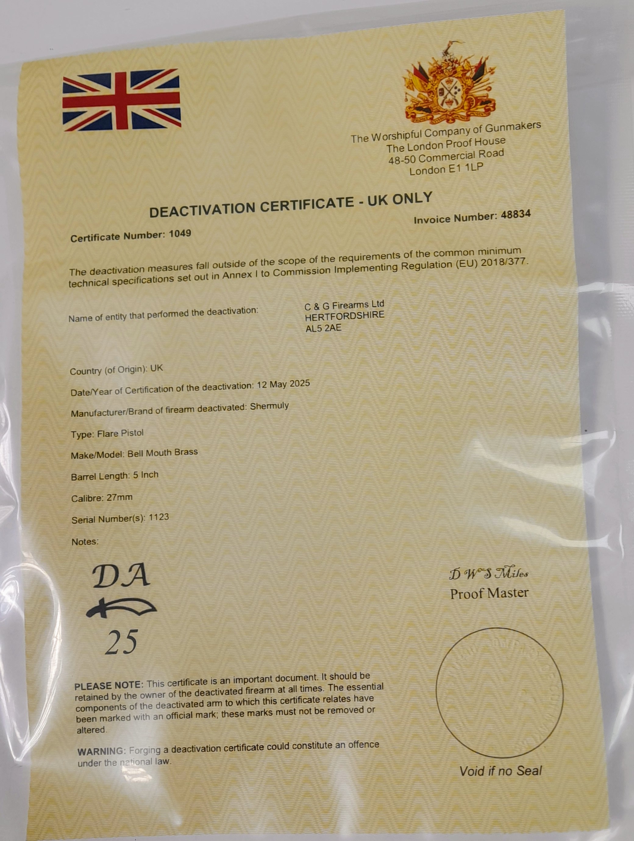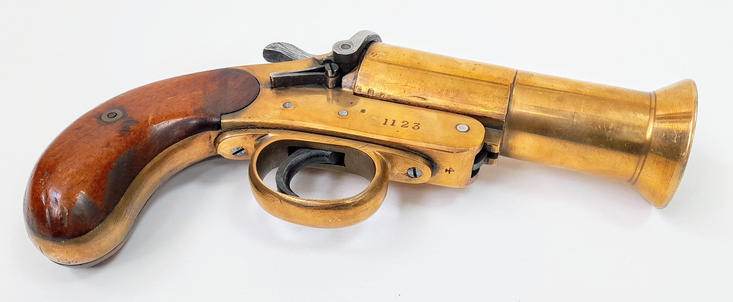 A deactivated Shermuly bell mouth brass single shot flare pistol, 5 inch barrel length, 27mm calibre. UK/EU sales only - Not Holland. Comes with an EU deactivation certificate.