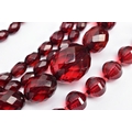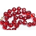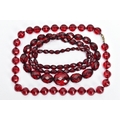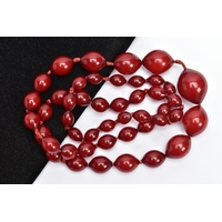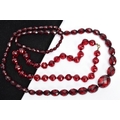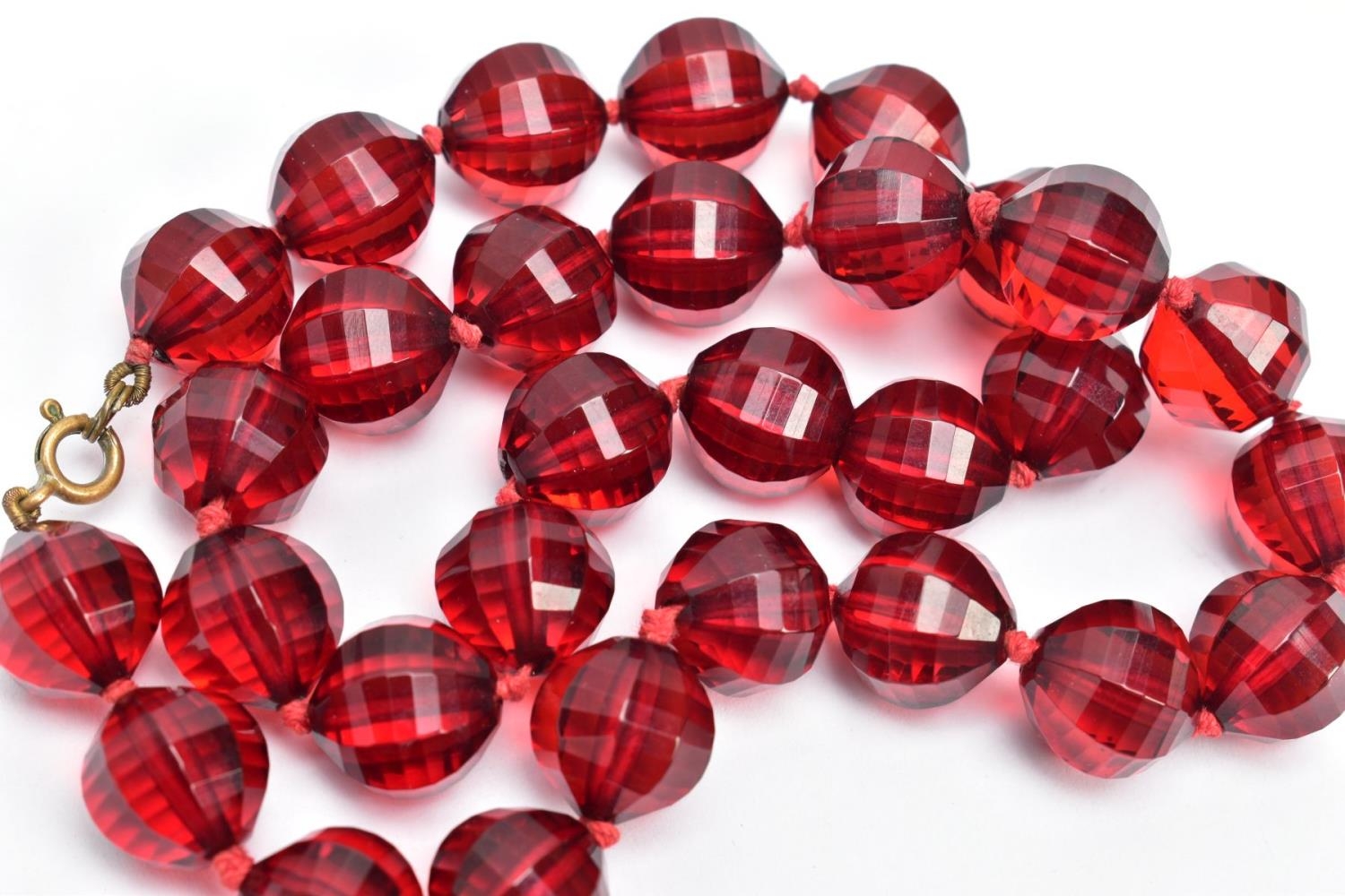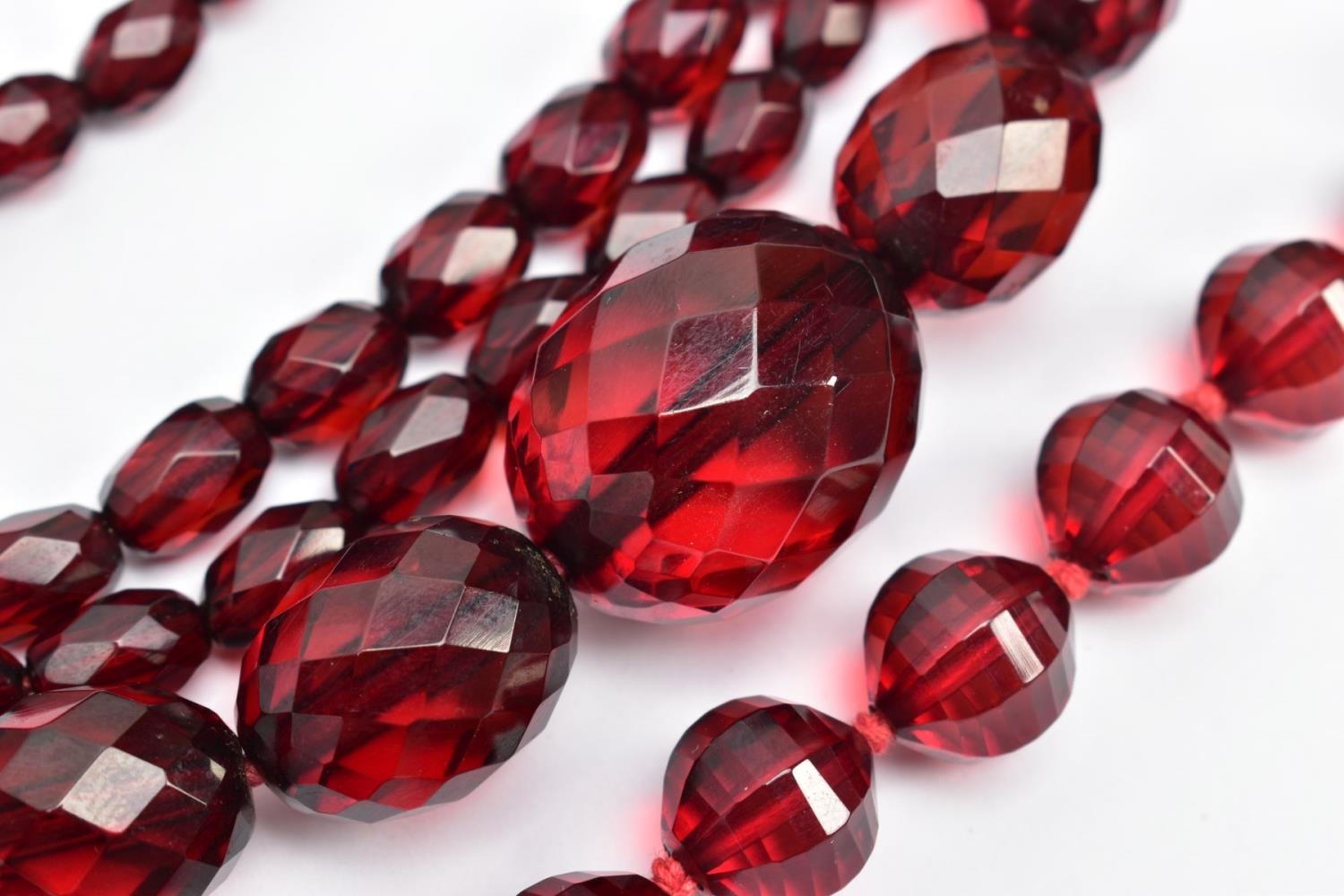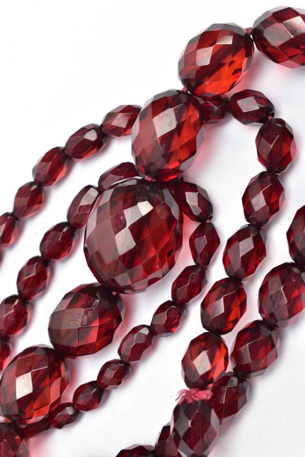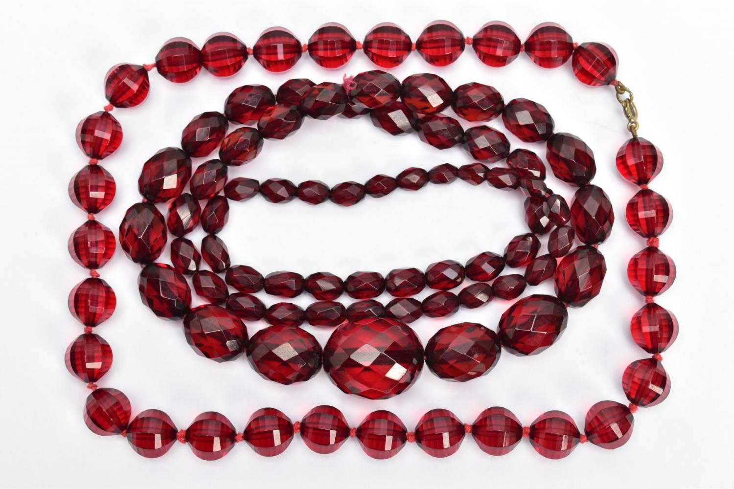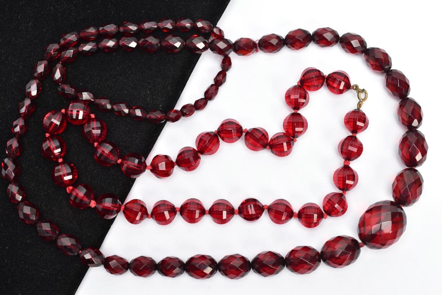 TWO SETS OF FACETED CHERRY AMBER PLASTIC BEAD NECKLACES, the first designed with circular faceted beads individually knotted onto a red cord, fitted with a base metal spring clasp, length 470mm, together with a graduated row of faceted oval beads, length 780mm