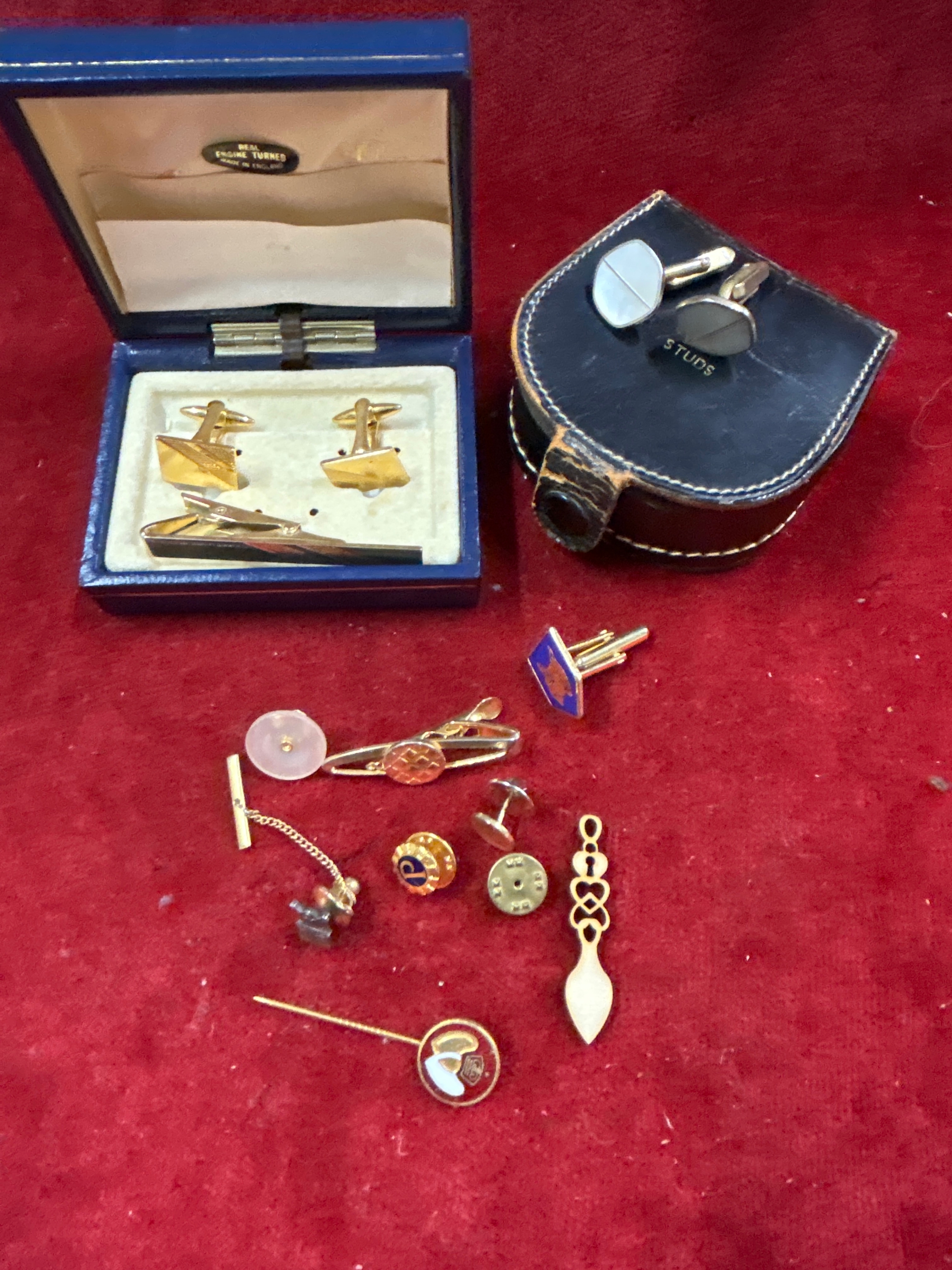 Cufflinks, tie clip, studs and pins including a sterling silver USAF lapel pin