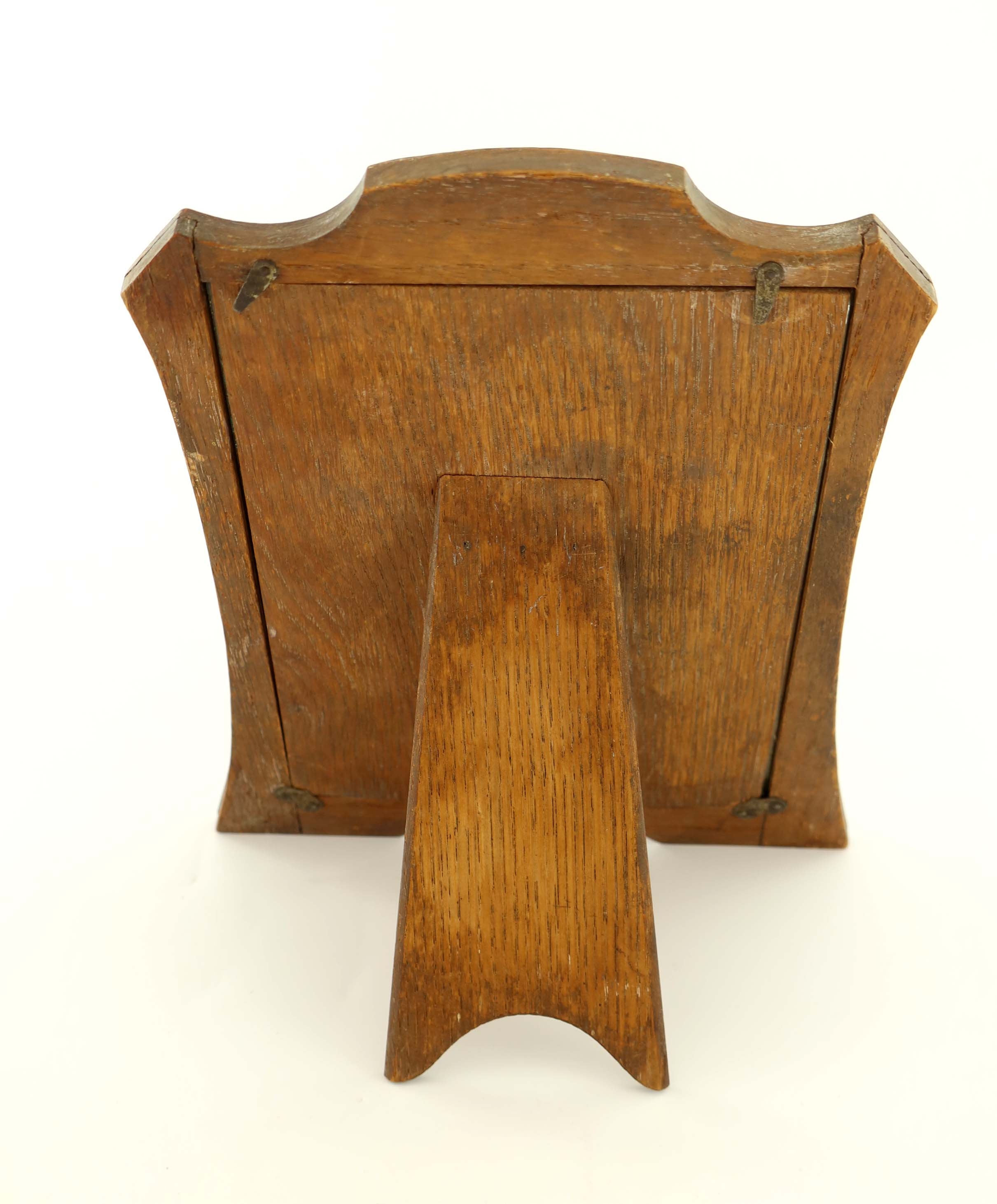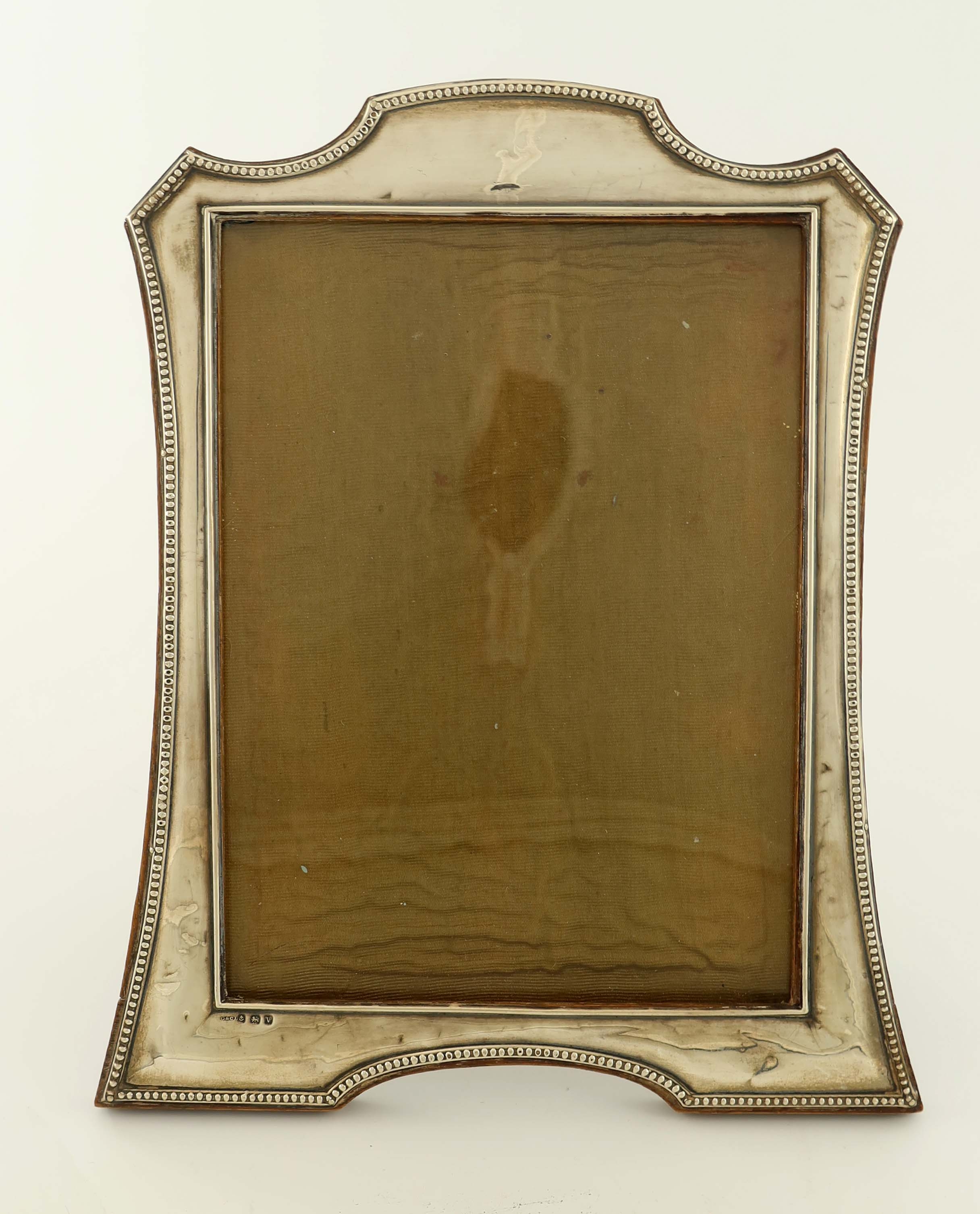 A George V silver photo frame, Green and Cadbury Ltd., Birmingham 1920, splayed bracket form with ogee top, beaded border, oak back and easel support, opening 19cm x 14cm, overall 25.5cm x 21cm