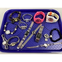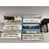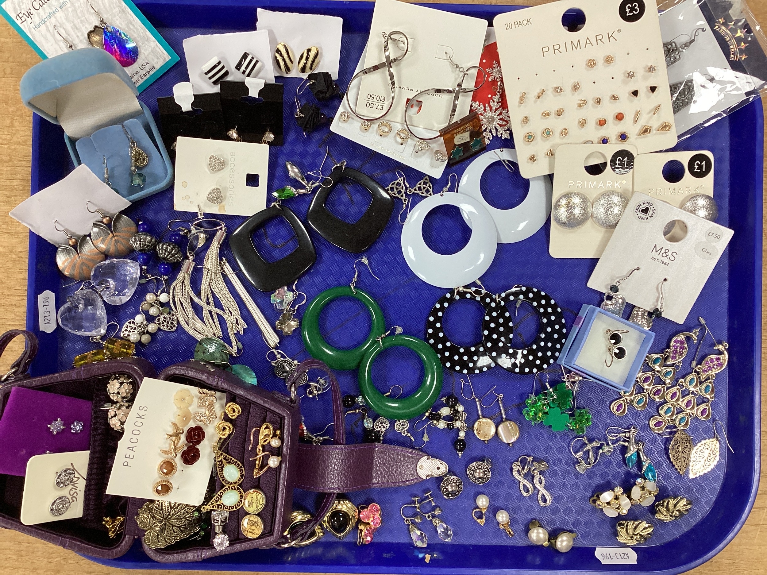 A Collection of Modern Earrings, to include statement drop earrings with polka dot decoration, fringed drops, imitation pearl bead clip ons, diamanté heart-shape stud earrings etc, together with a trinket box in the style of a handbag :- One Tray
