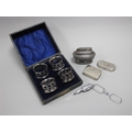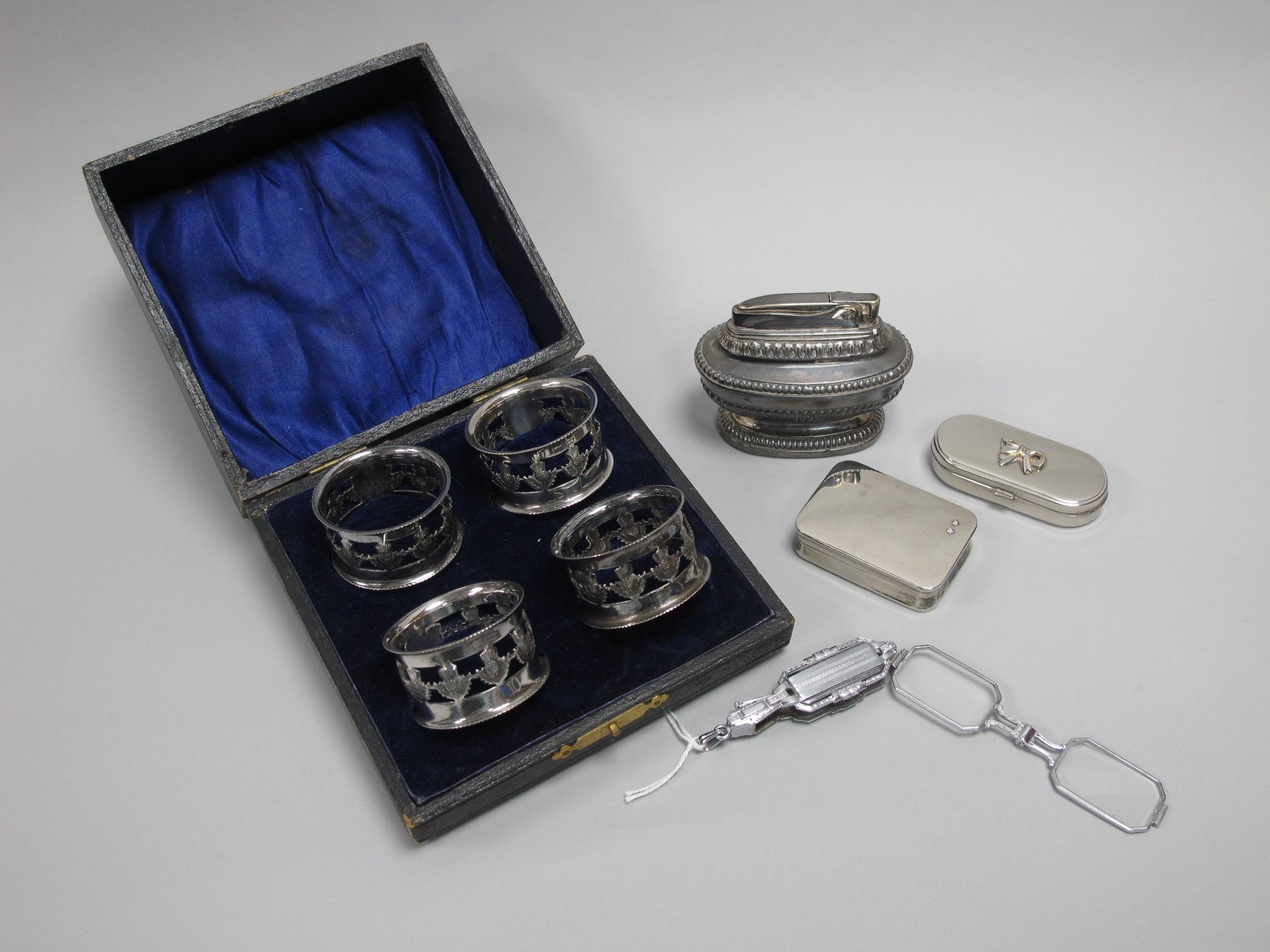 Art Deco Style Lorgnettes, together with a cased set of four thistle design plated napkin rings, modern pill boxes, Ronson table lighter.
