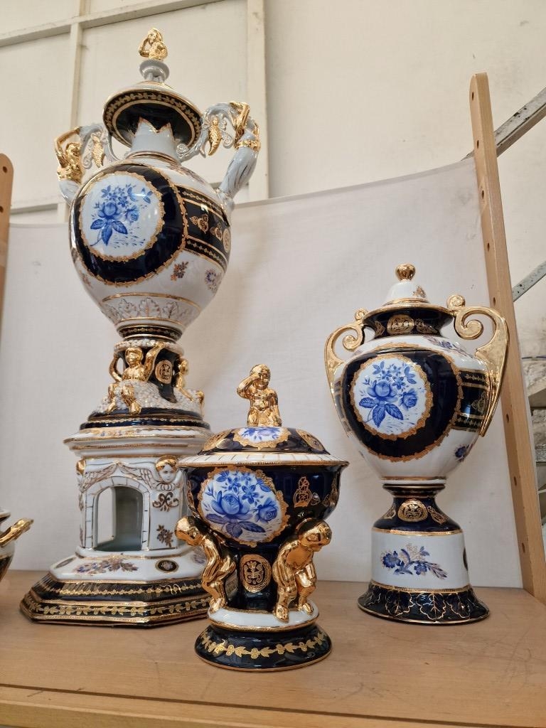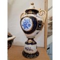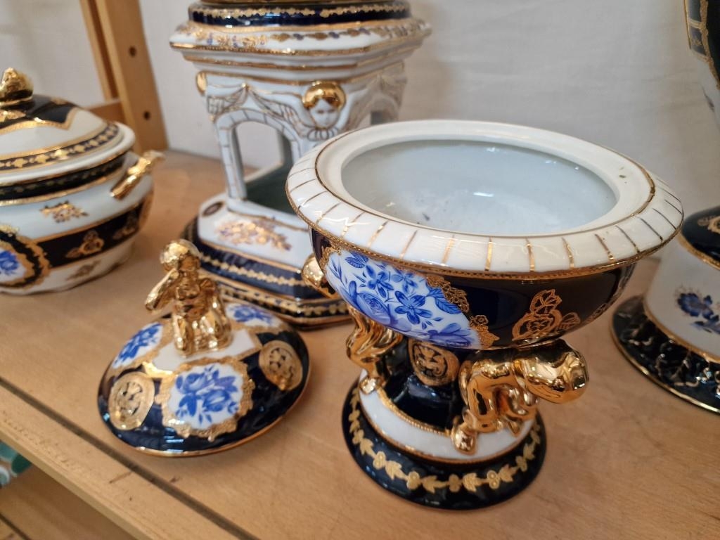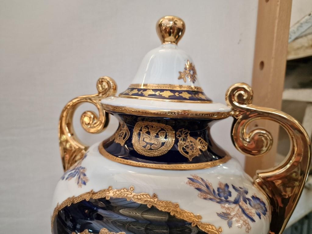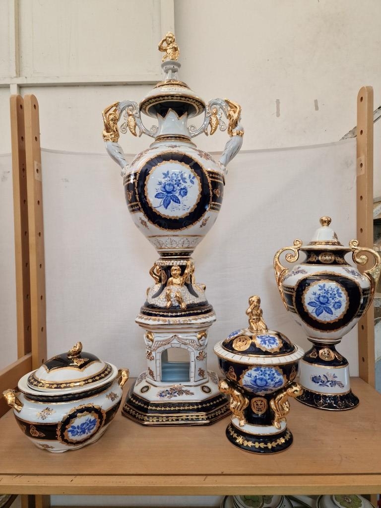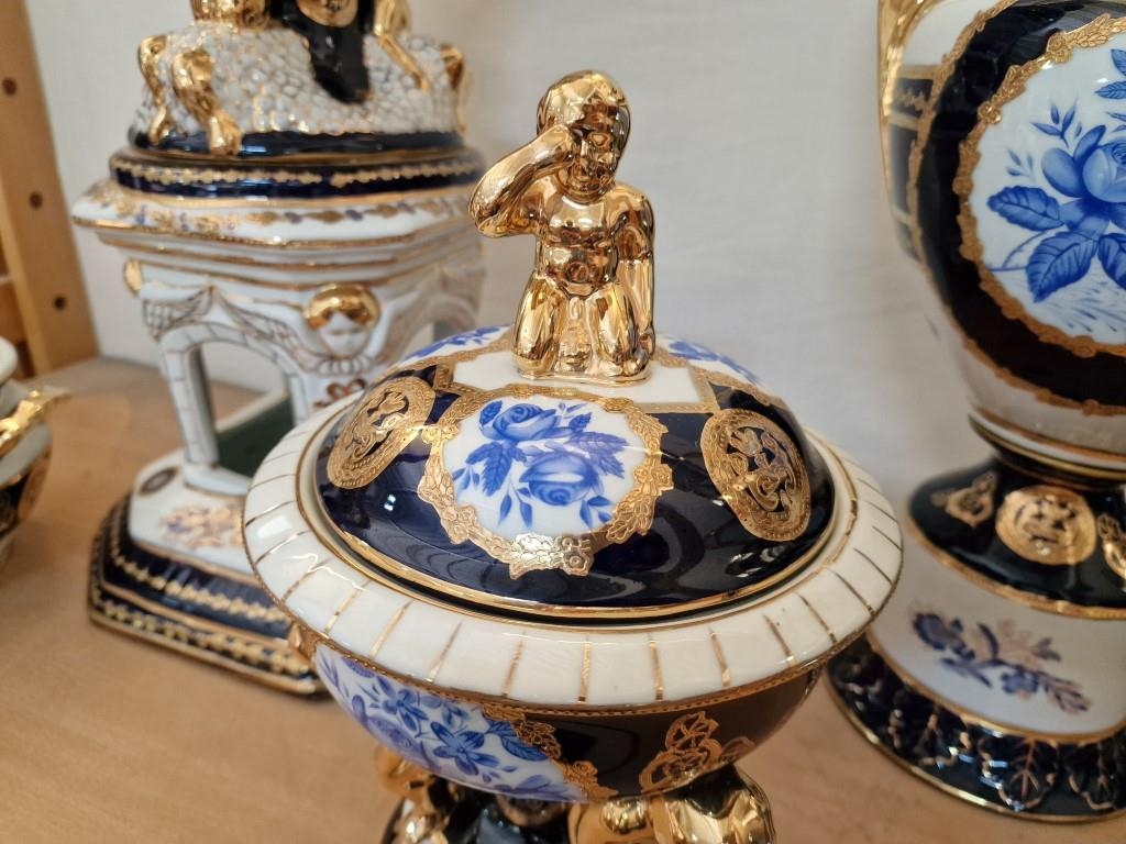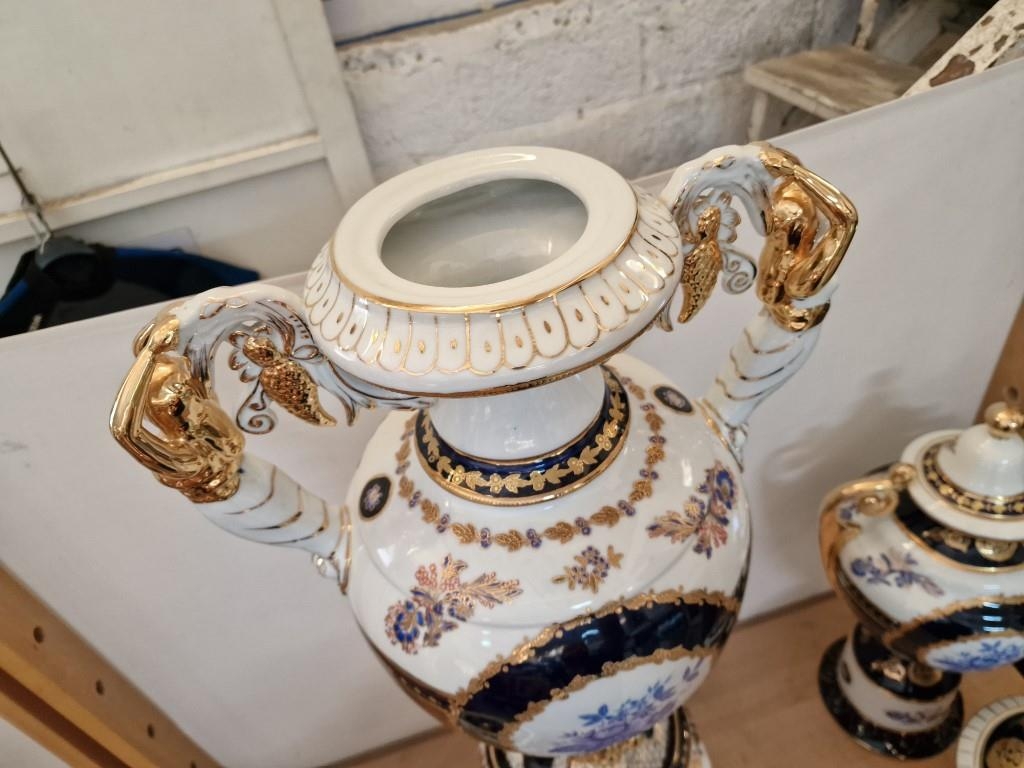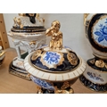 Baroque Style Porcelain 4-Piece Vase Set, Italian Style Ceramics Decorated with Cobalt Blue, Gold Tone Figures & Detailing and Floral Patterns; The Stunning Main Piece Stands Approx. 98cm Tall, Together with Twin Handled Lidded Urn, Lidded Pedestal Bowl and Other Lidded Bowl, (4)