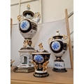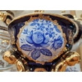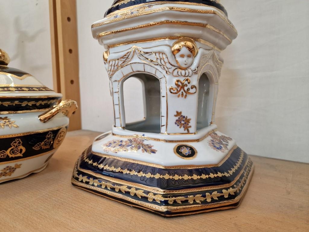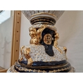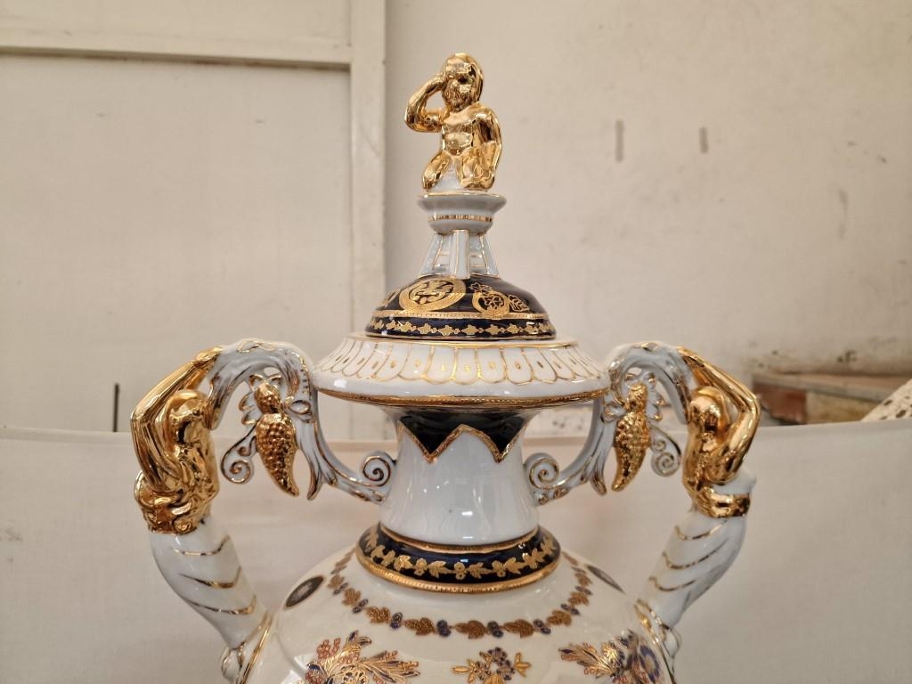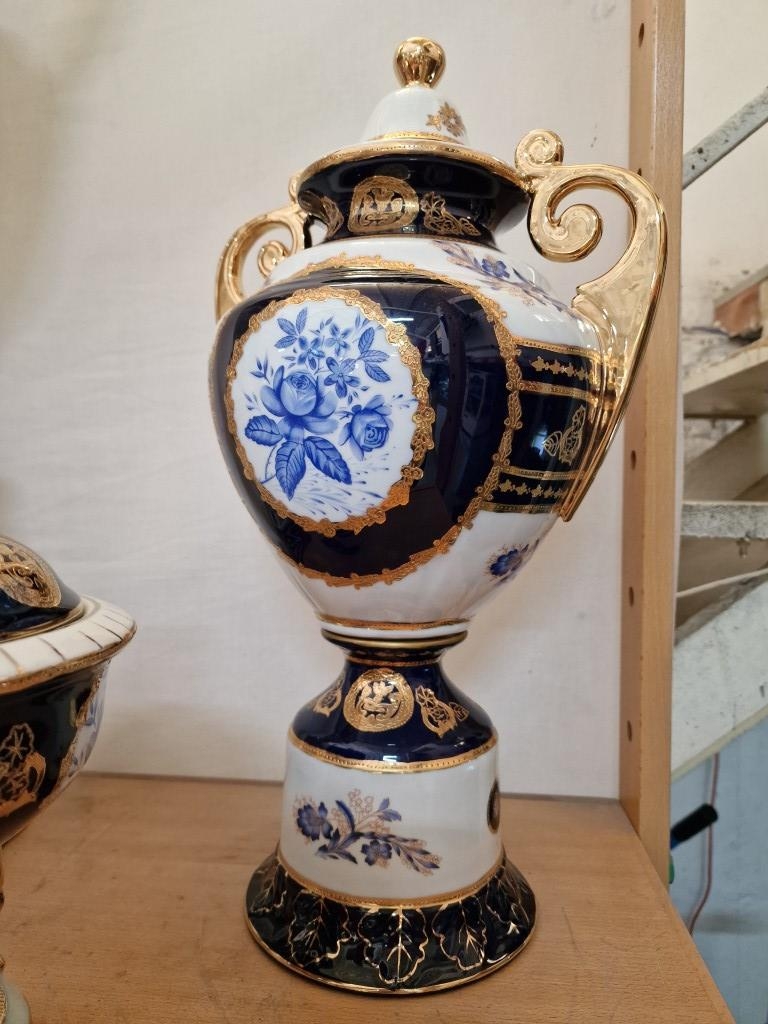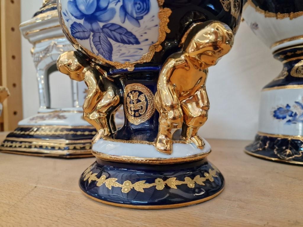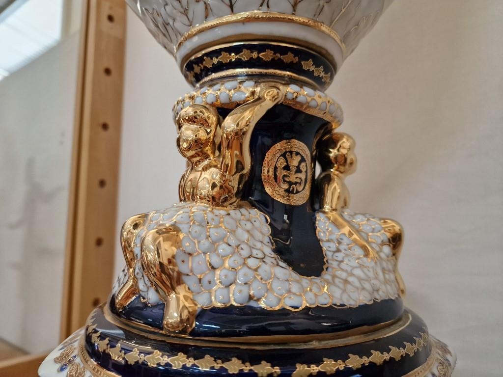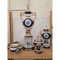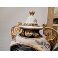 Baroque Style Porcelain 4-Piece Vase Set, Italian Style Ceramics Decorated with Cobalt Blue, Gold Tone Figures & Detailing and Floral Patterns; The Stunning Main Piece Stands Approx. 98cm Tall, Together with Twin Handled Lidded Urn, Lidded Pedestal Bowl and Other Lidded Bowl, (4)