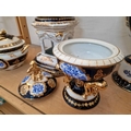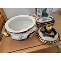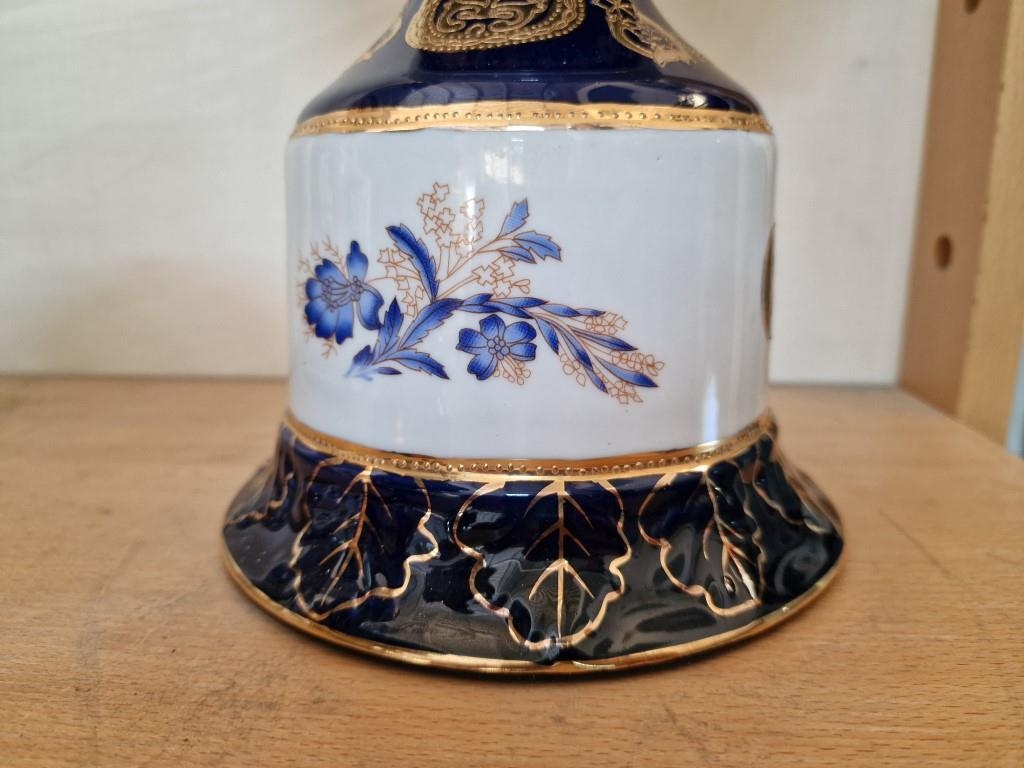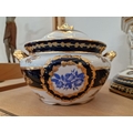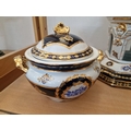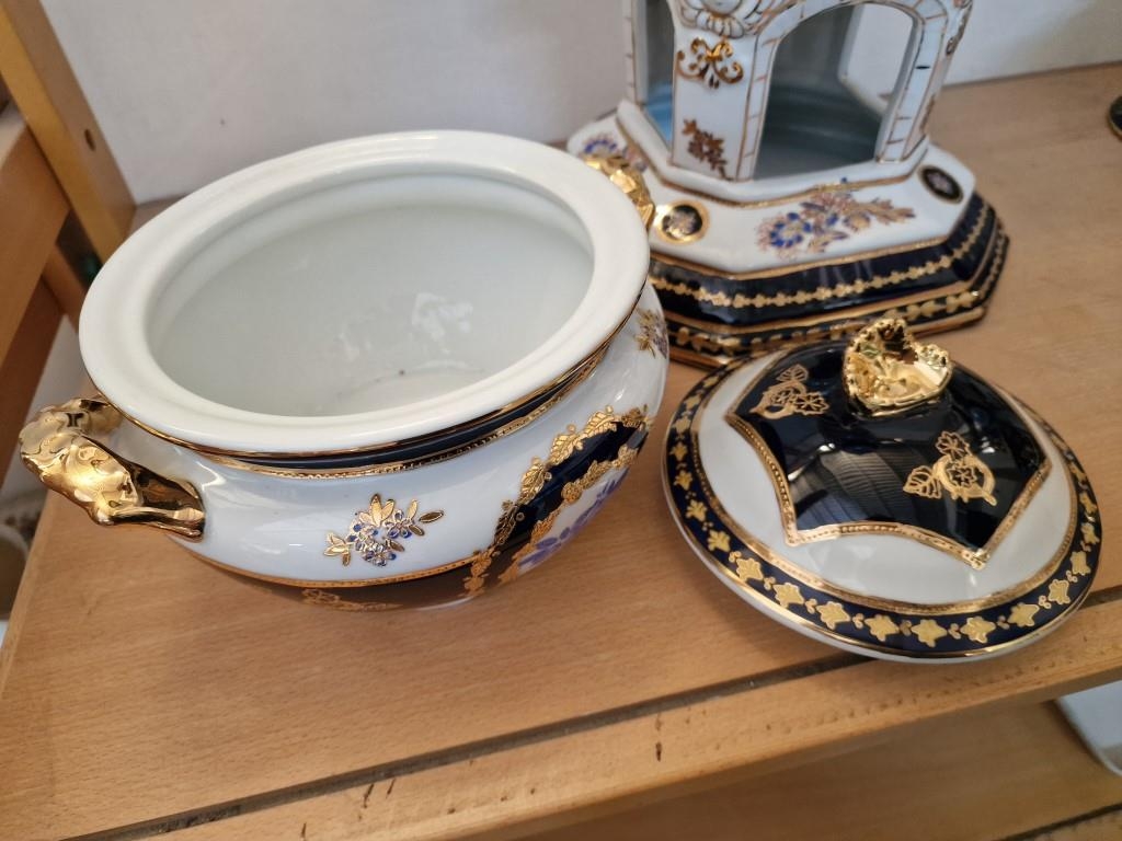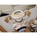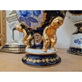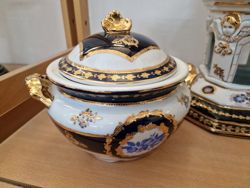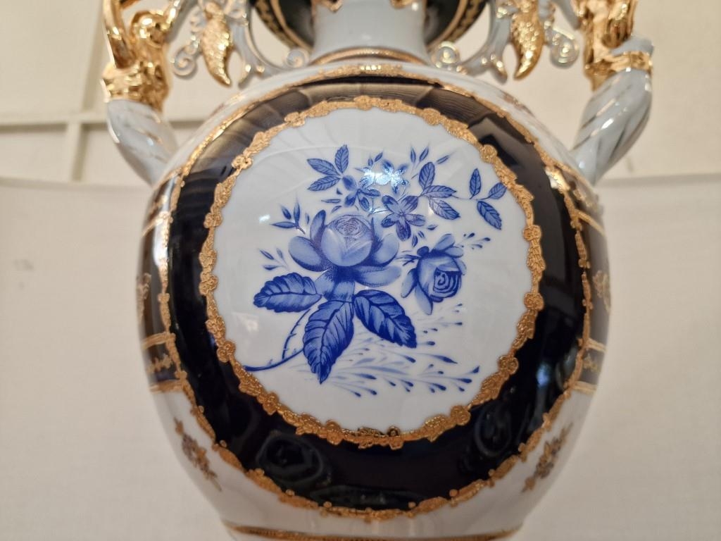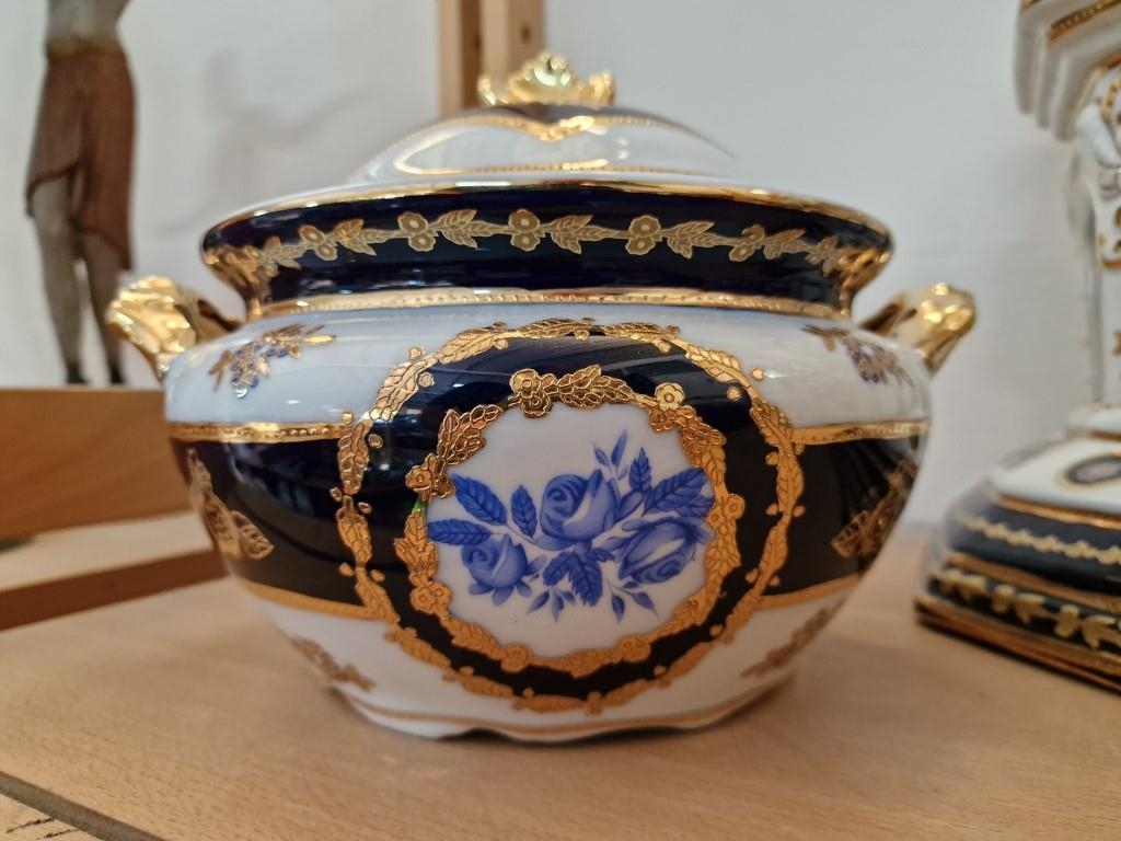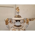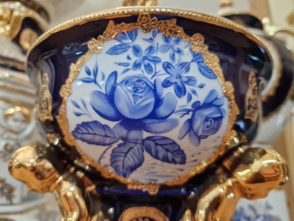 Baroque Style Porcelain 4-Piece Vase Set, Italian Style Ceramics Decorated with Cobalt Blue, Gold Tone Figures & Detailing and Floral Patterns; The Stunning Main Piece Stands Approx. 98cm Tall, Together with Twin Handled Lidded Urn, Lidded Pedestal Bowl and Other Lidded Bowl, (4)