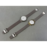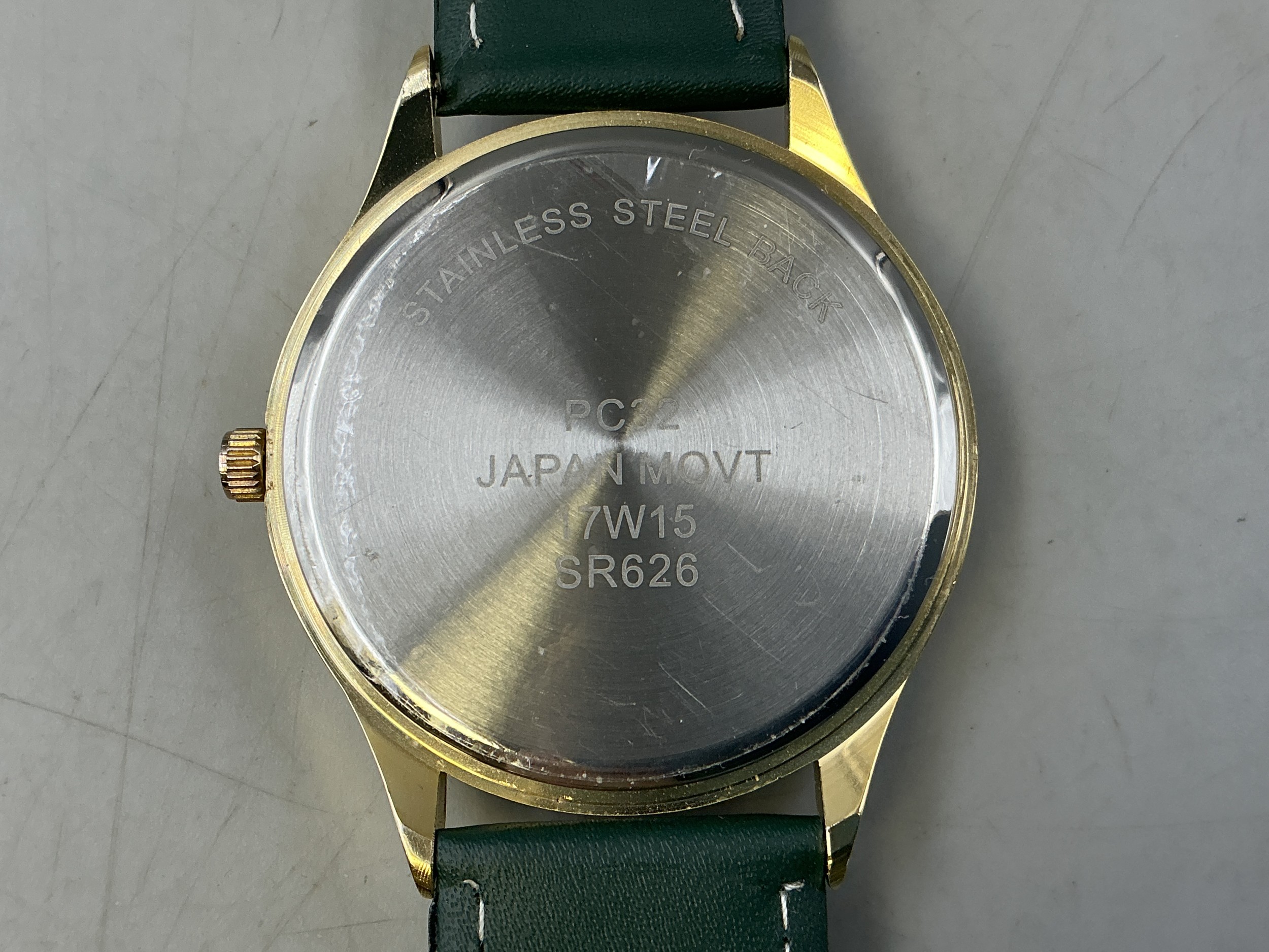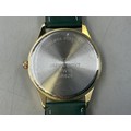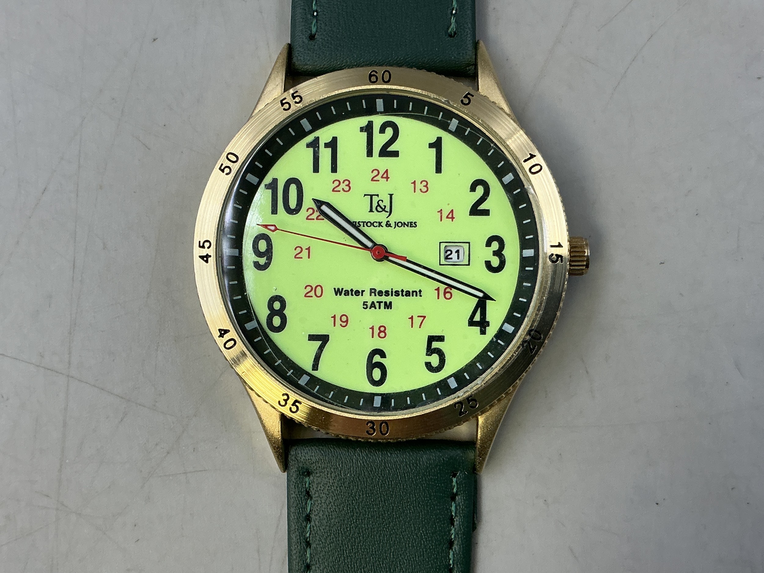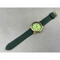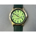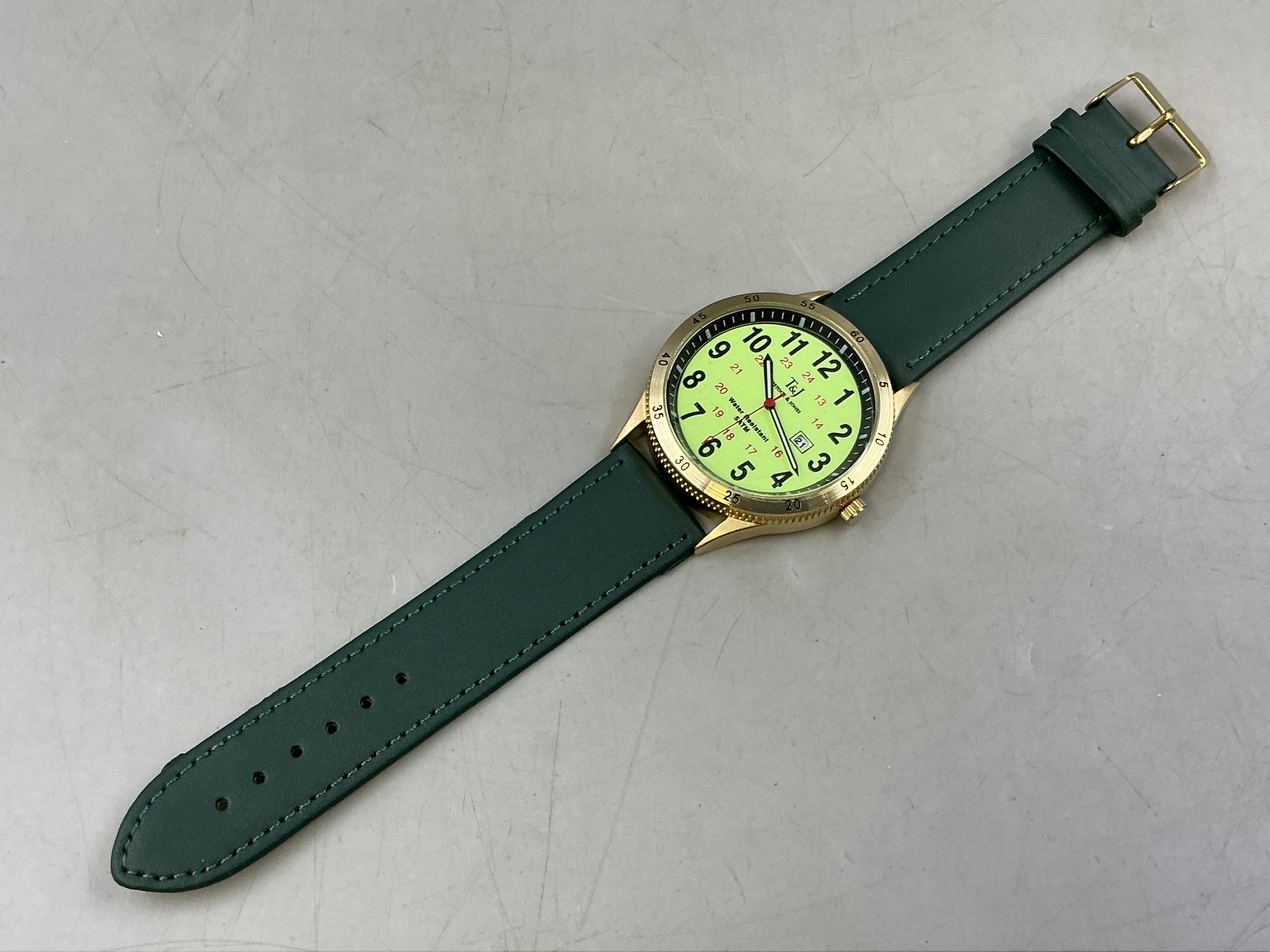A Gents Tavistock & Jones Quartz Day/Time Watch - Luminous 24 Hr Dial, Brushed Gold Tone Case, And Green Leather Strap. Working