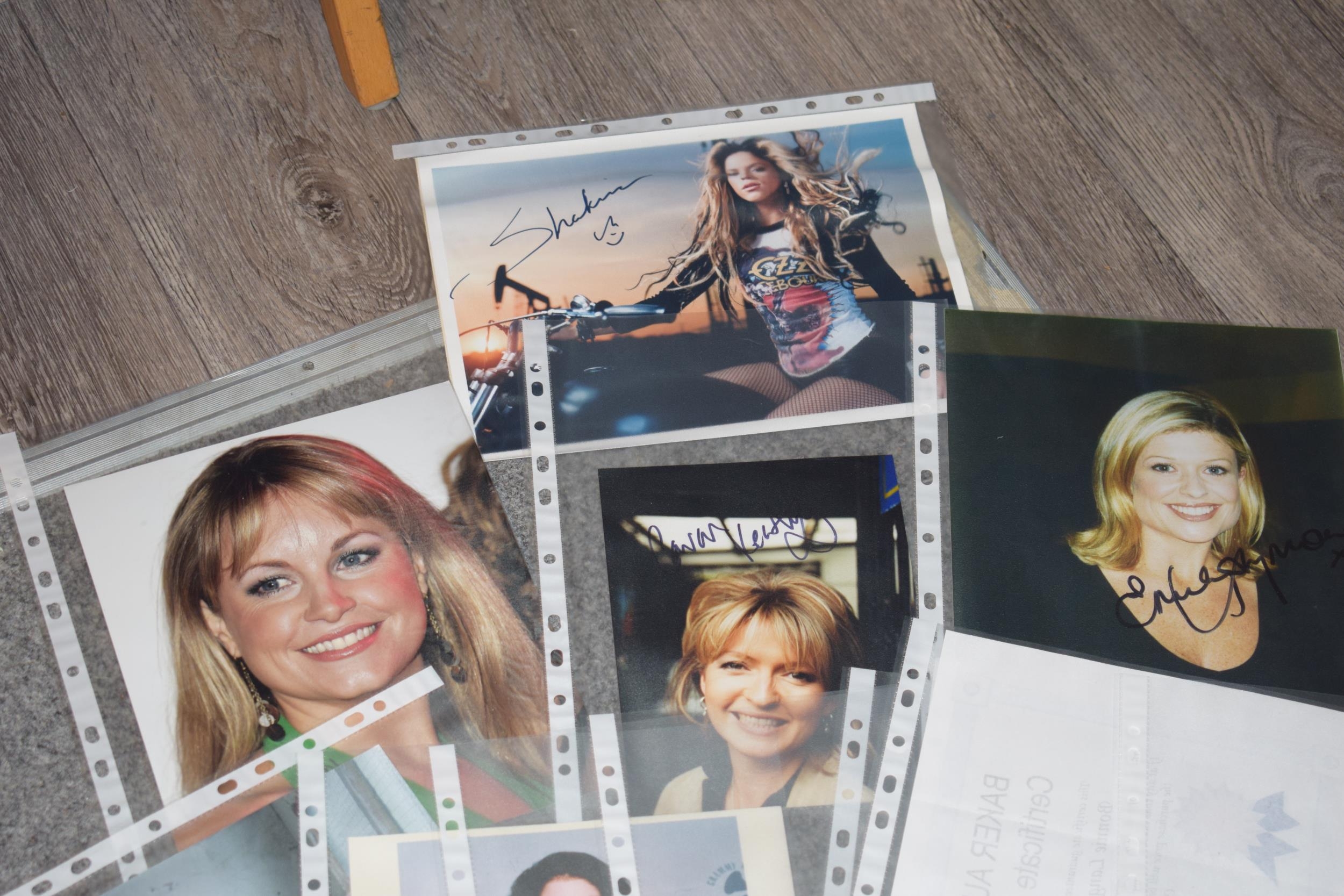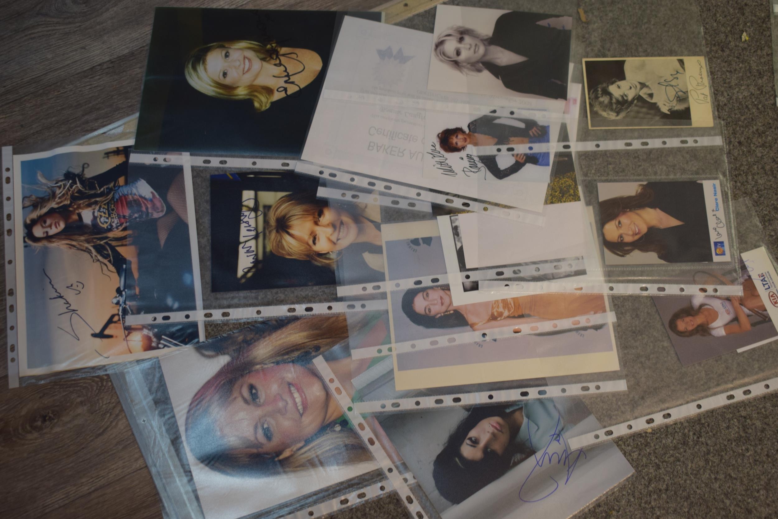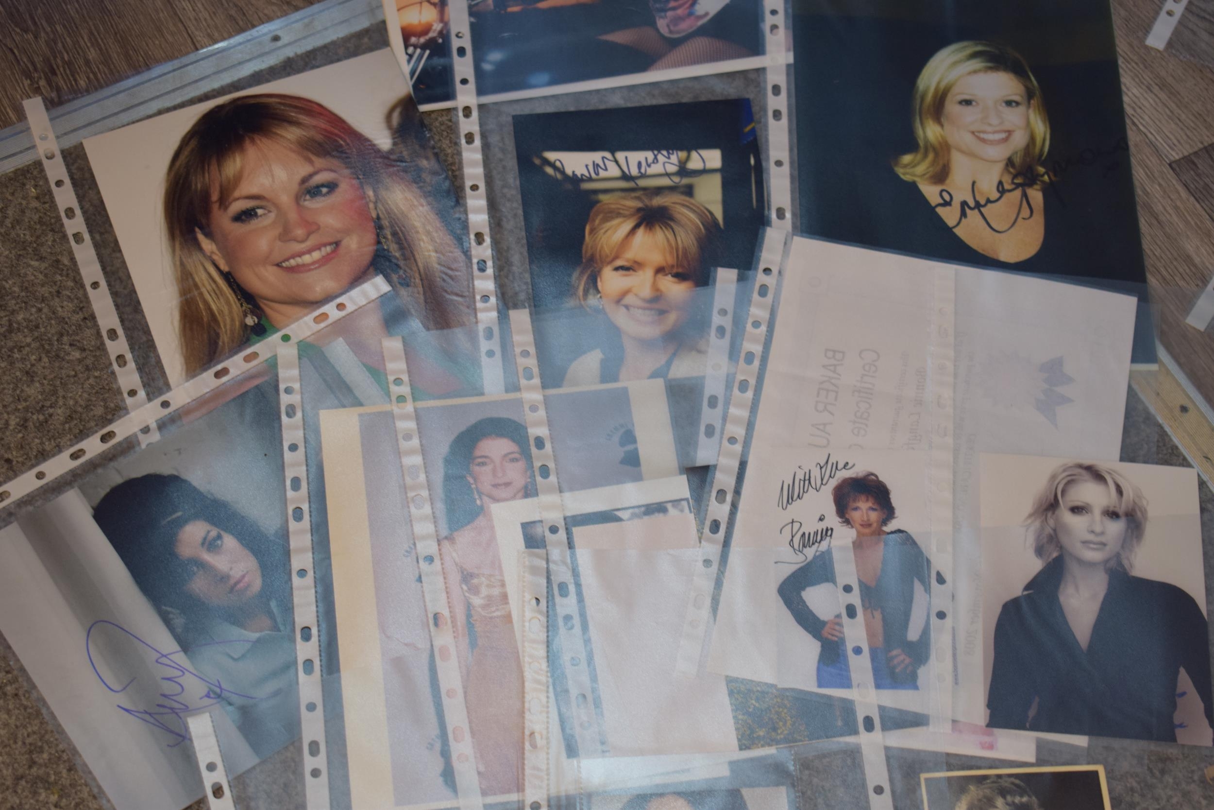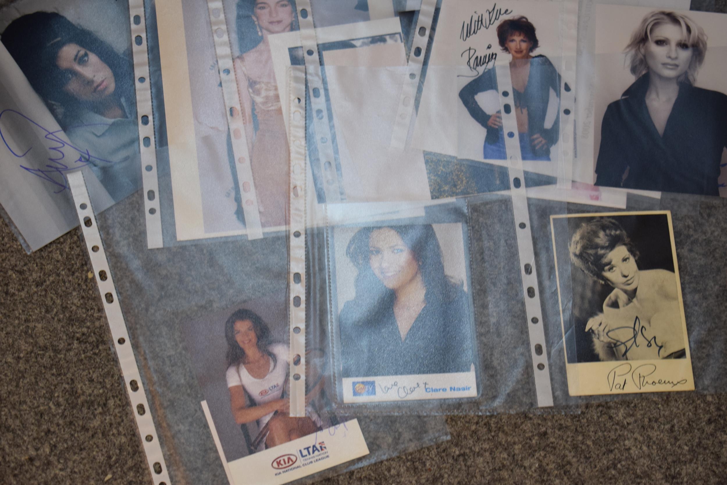 A collection of autographs and facsimiles on studio photographs, some with printed certificates, to include famous names such as, Amy Whinehouse, Dani Bear, Pat Phoenix, Annabel Croft, Kim Medcalf. (15)