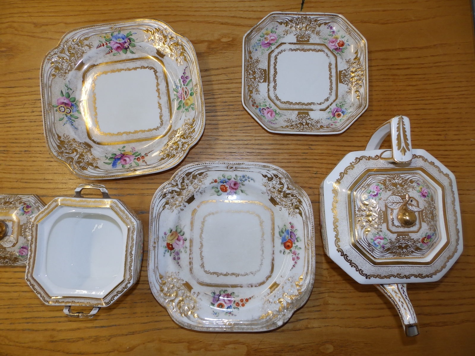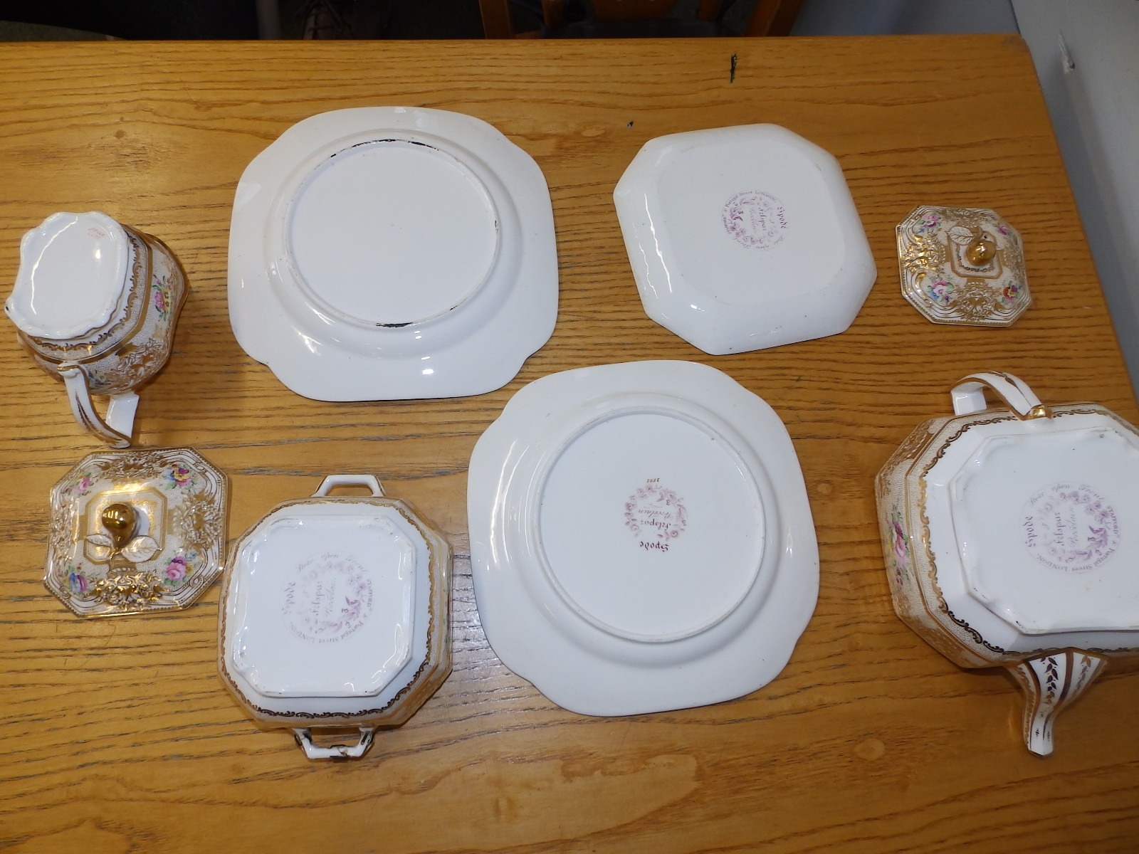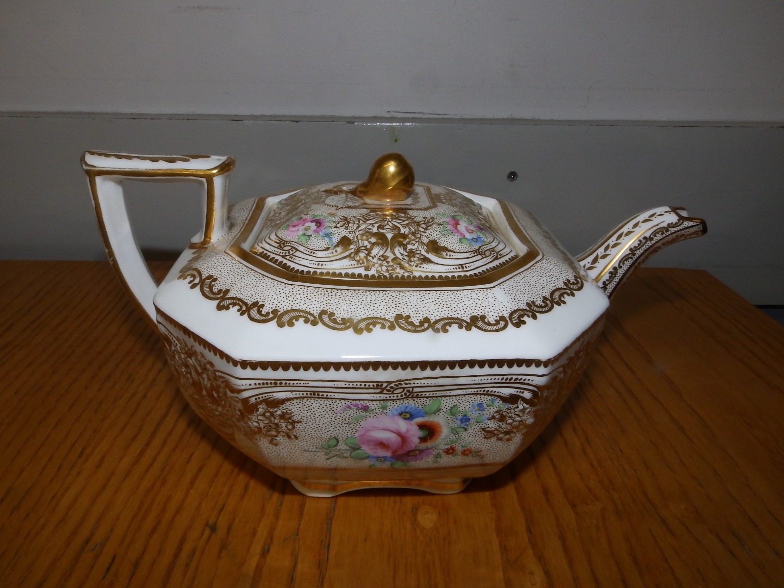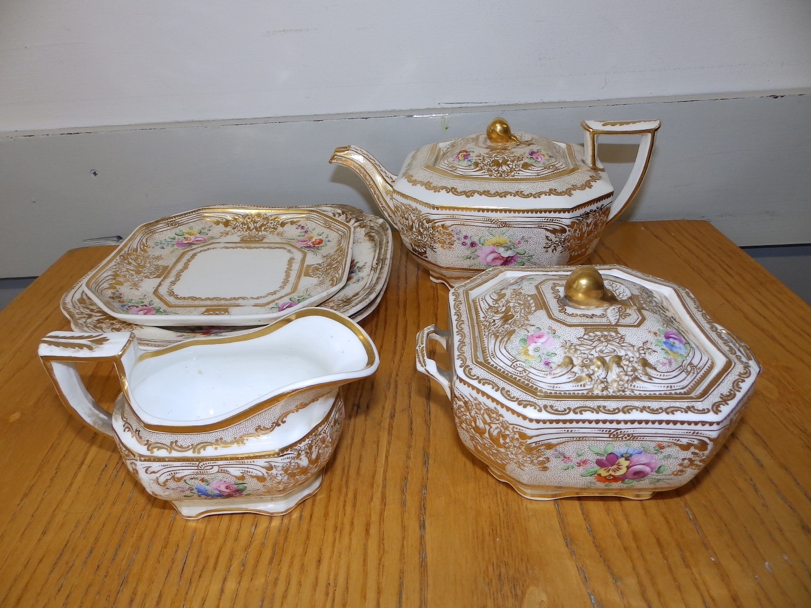 Six pieces of 19thC Spode Felspar tea china including a teapot - bowl with repaired handle, slight rubbing.