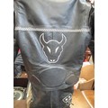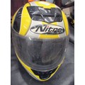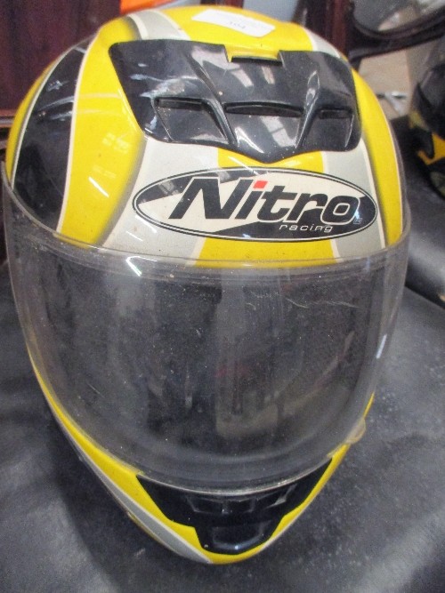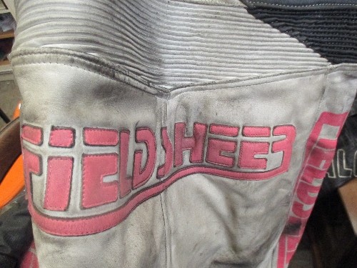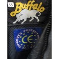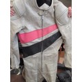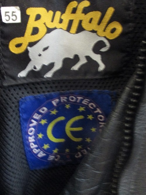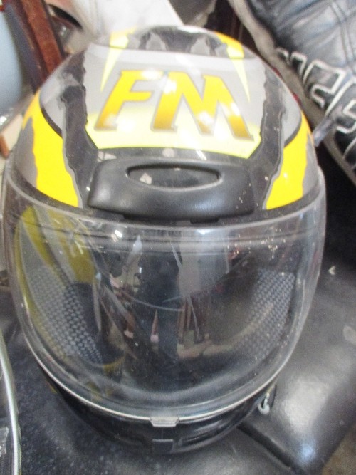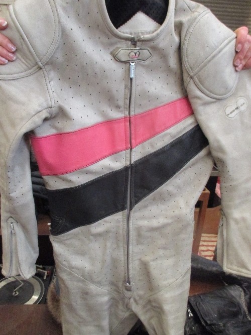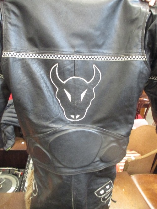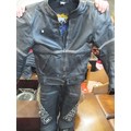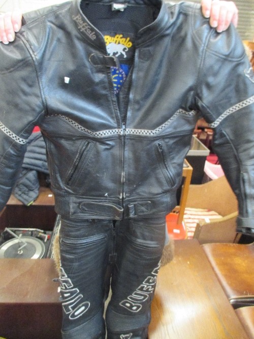 TWO MOTORCYCLE HELMETS AND TWO BIKERS LEATHERS, ONE SUIT BY BUFFALO - SIZE 12 (EUR 38) IN BLACK AND THE OTHER BY FIELDSHEER SIZE 40