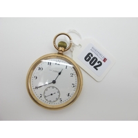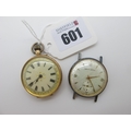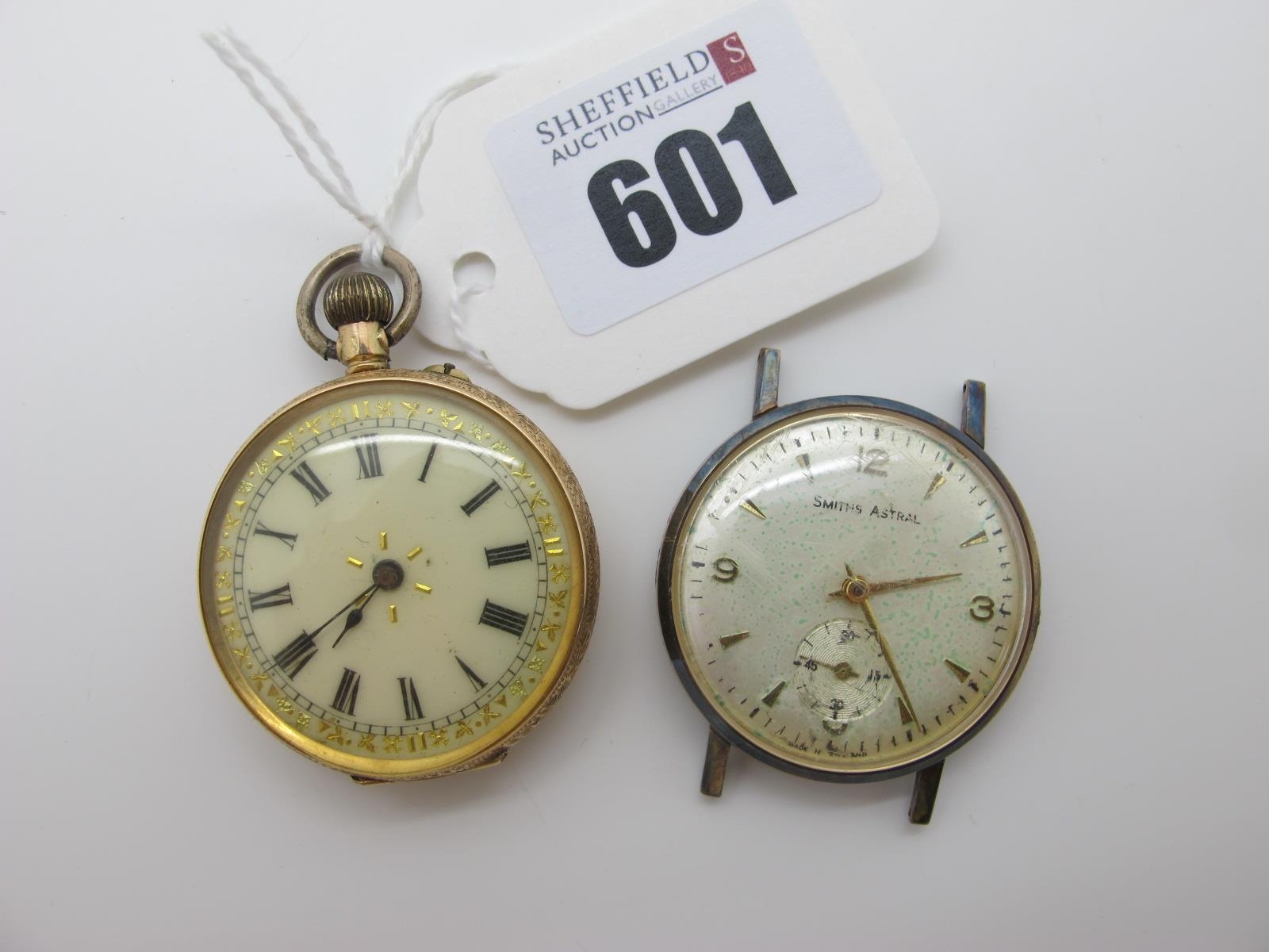A Ladies Fob Watch, the gilt highlighted dial with black Roman numerals, within foliate engraved case, stamped "14C"; a gent's wristwatch head (no strap / damages / lacking winder), bearing presentation inscription. (2)