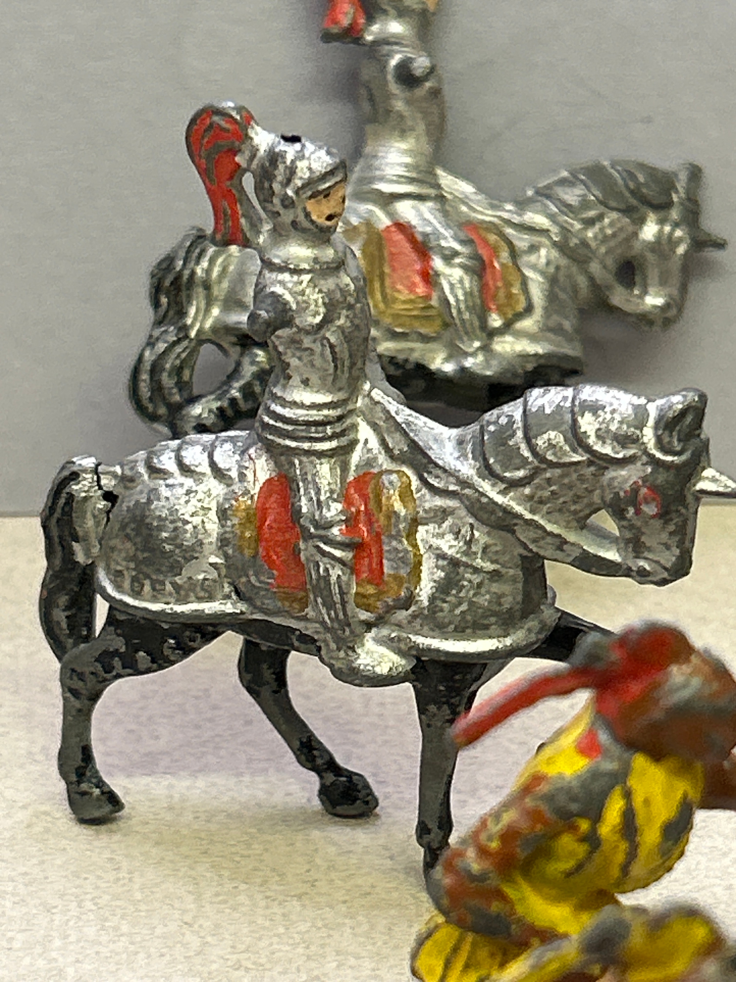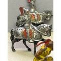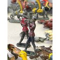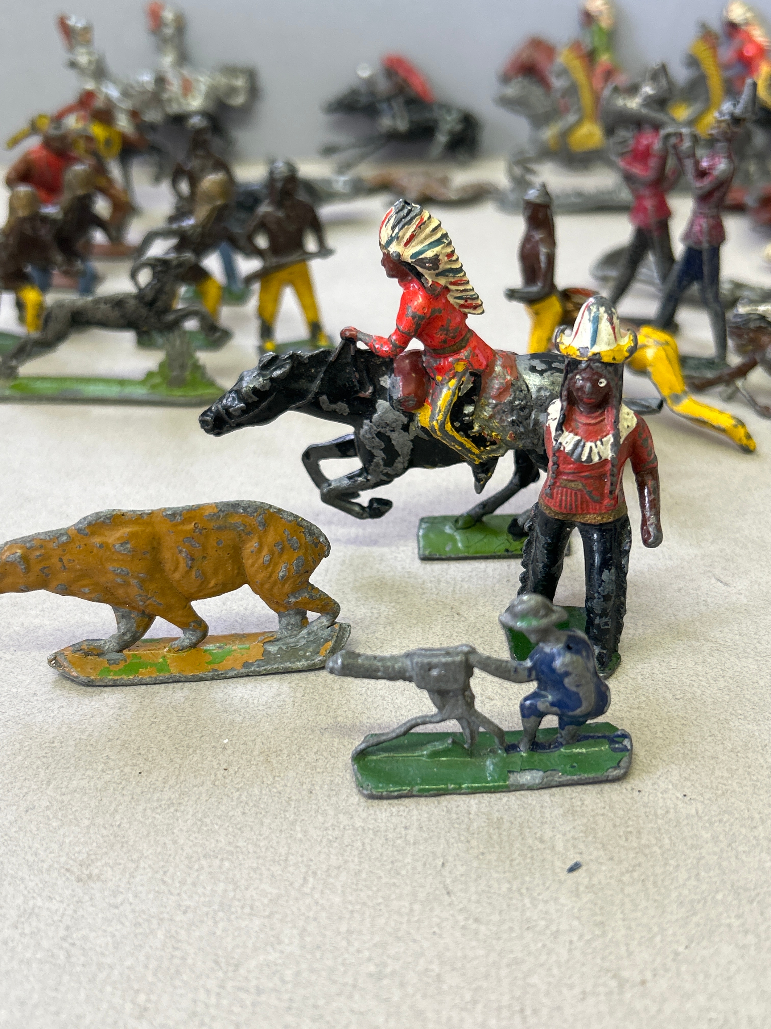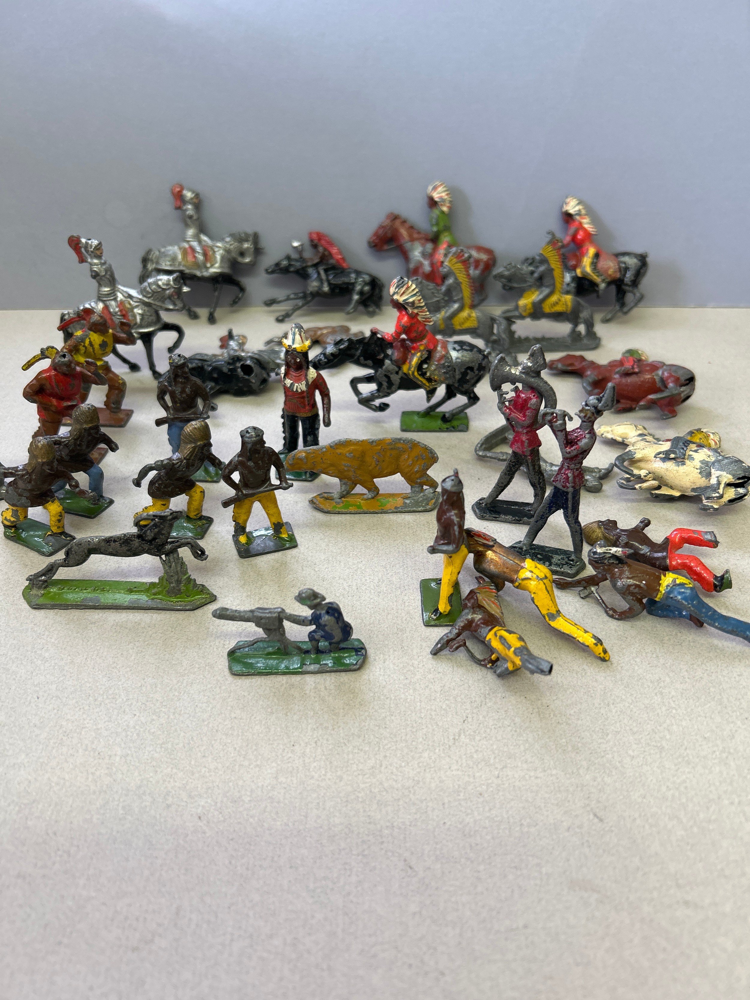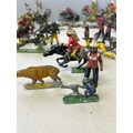 Vintage lead toy figures in play worn condition including Britains American Indians, Hill & Co Knights on horseback etc
