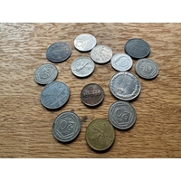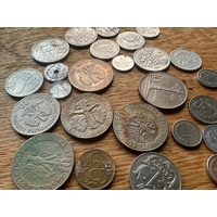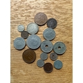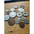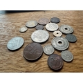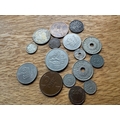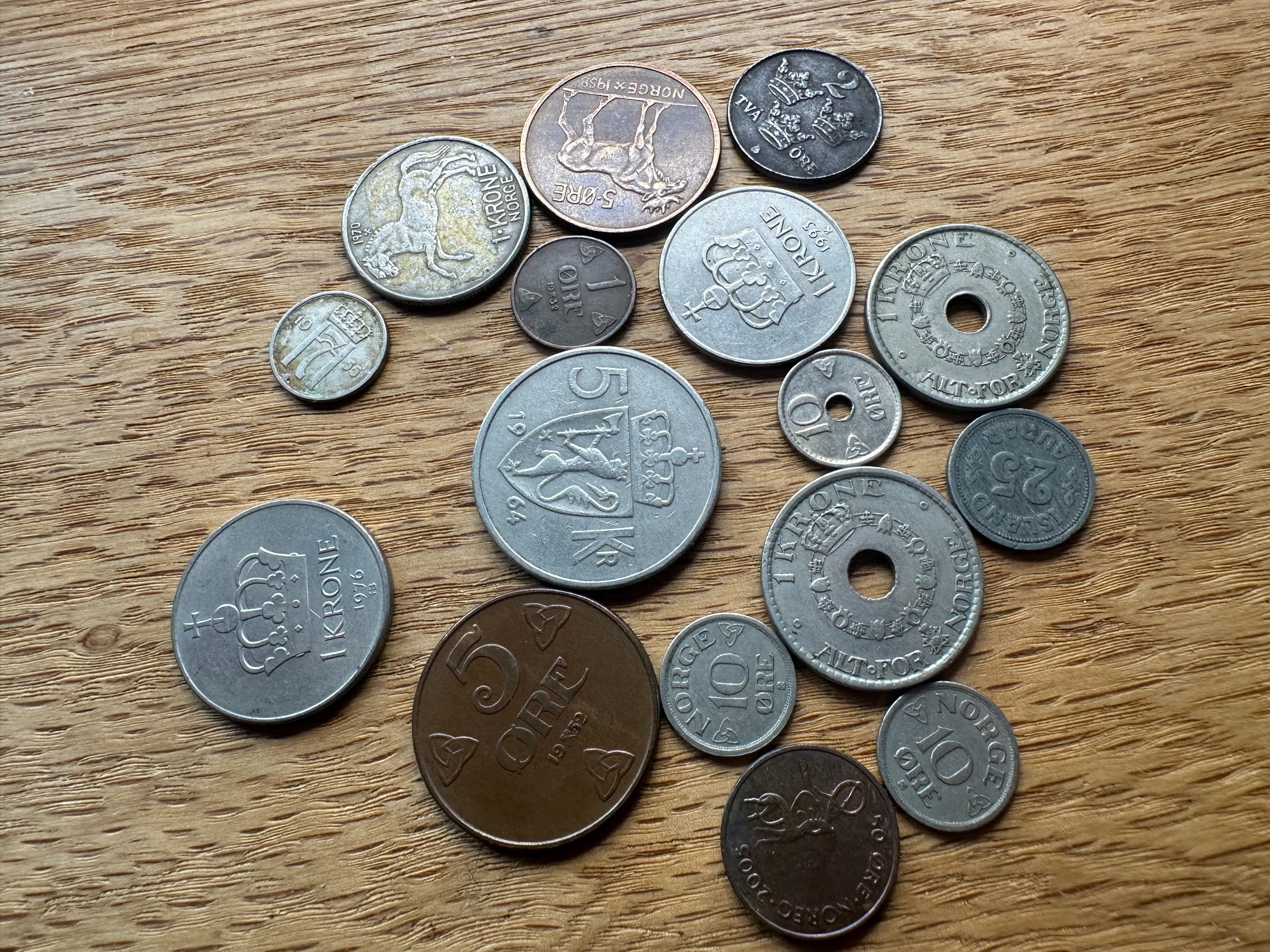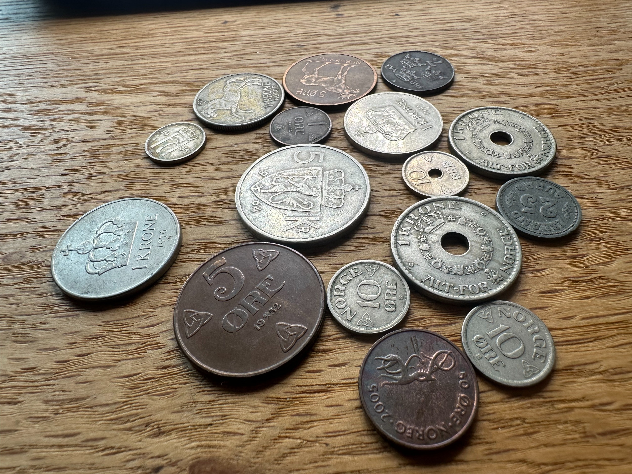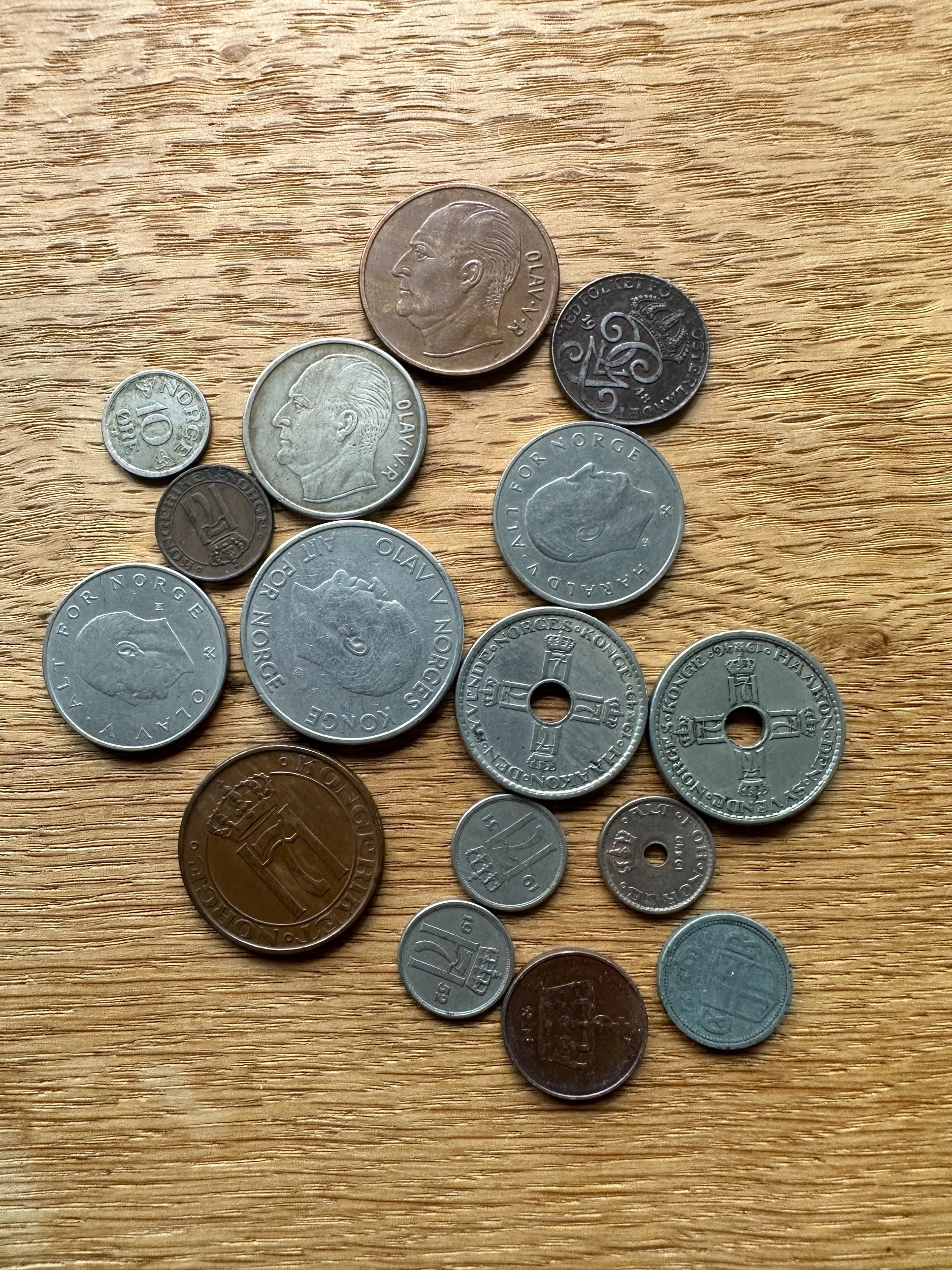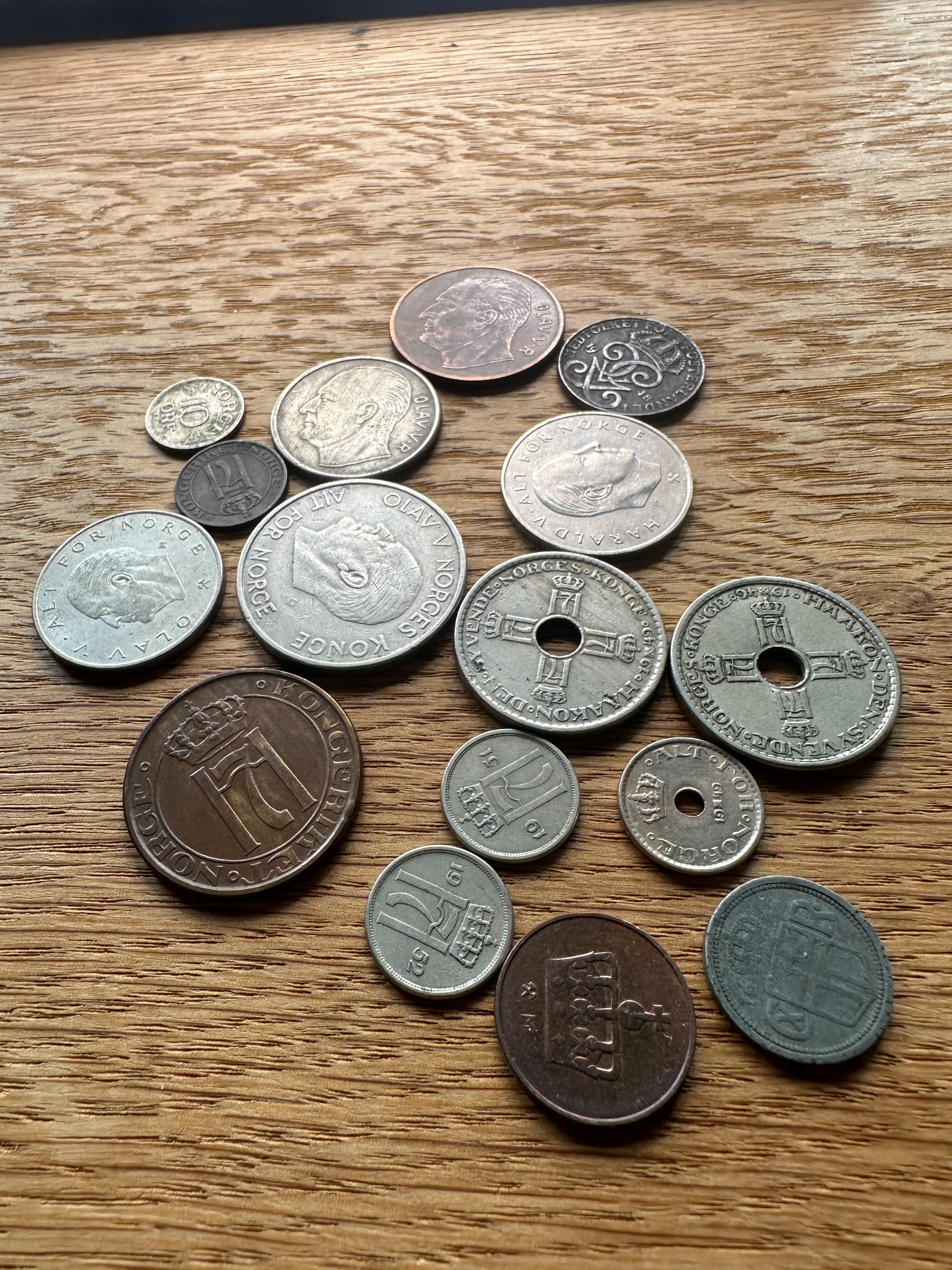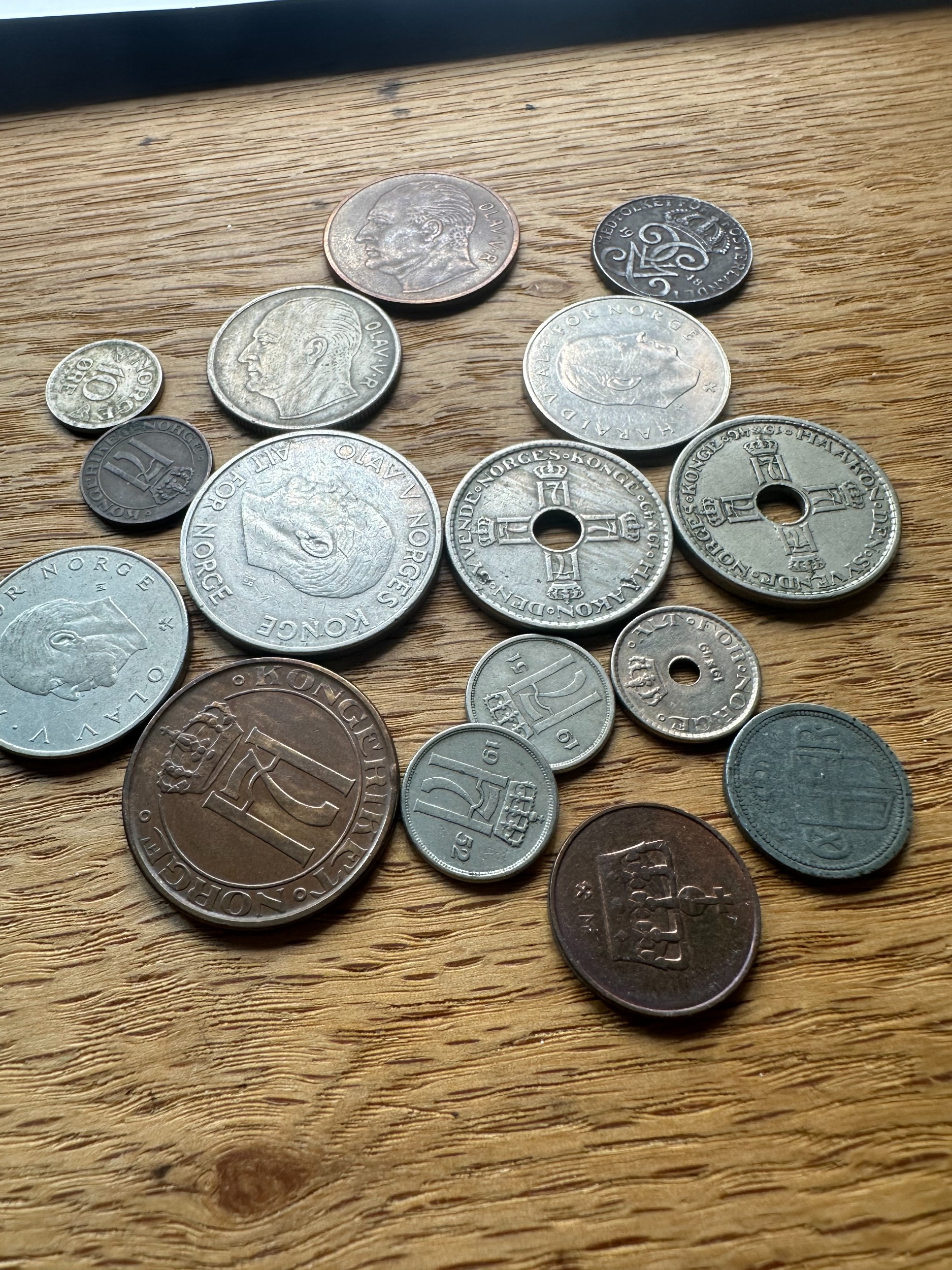 A collection of approximately 25 assorted Norwegian coins, as indicated by the prominent "NORGE" (Norway) marking and denominations such as "KRONE" and "ÃRE". The style varies, featuring portraits of monarchs including Olav V and Haakon VII, alongside heraldic designs such as the Norwegian lion with an axe, and numerical denominations. Visible dates range from the early 20th century (e.g., 1932, 1950) to the early 21st century (e.g., 1976, 2005). Materials appear to be a mix of silver-toned, copper/bronze, and darker alloys.