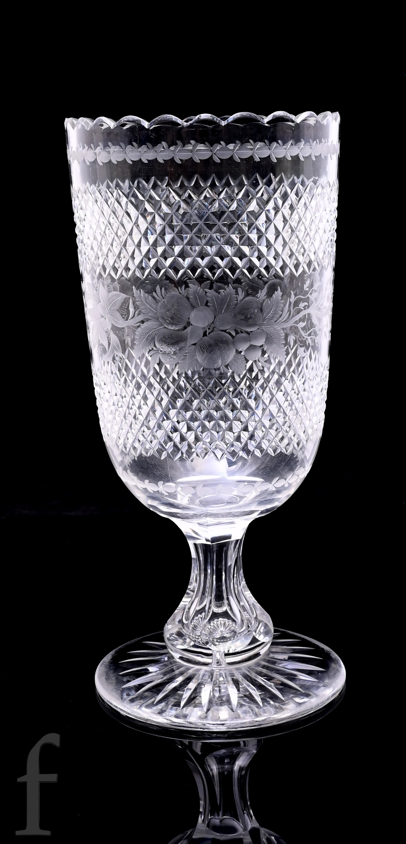 A 19th Century Stourbridge clear crystal glass celery vase, the body engraved with a central band of fruit and foliage between strawberry diamond bands above a hollow blown slice cut stem and circular spread foot with radial star cut base, height 25.5cm.