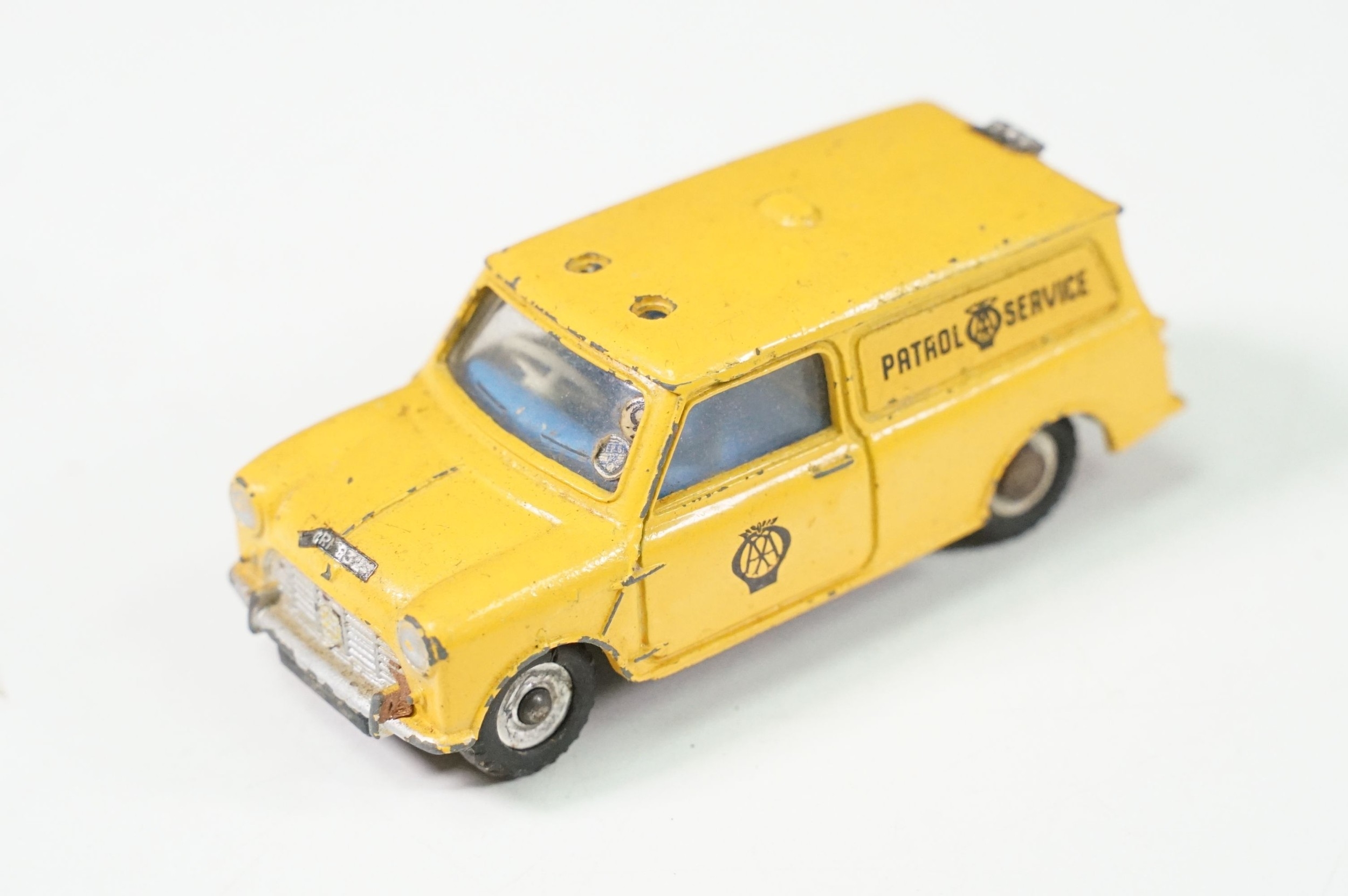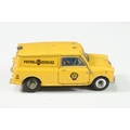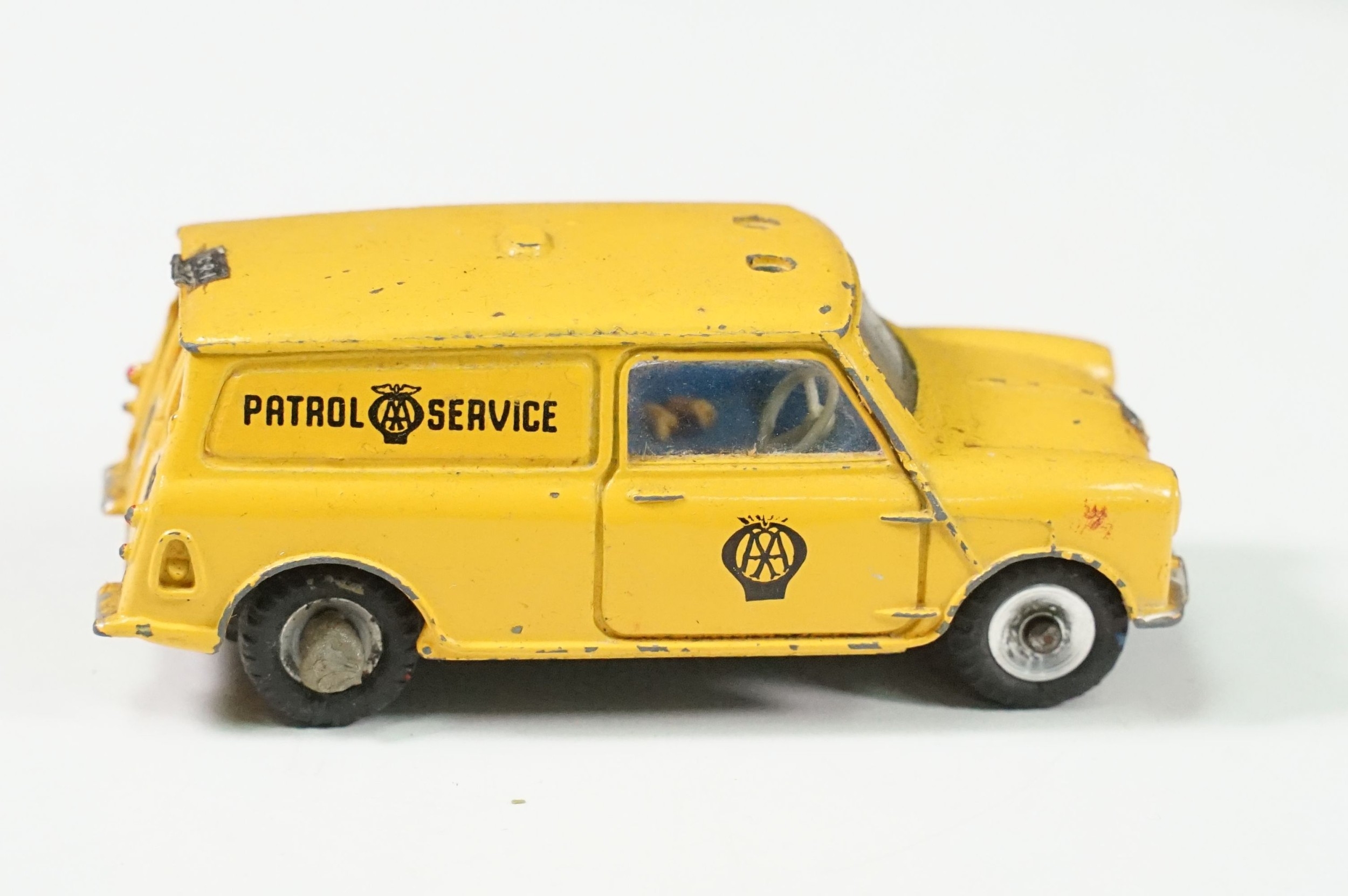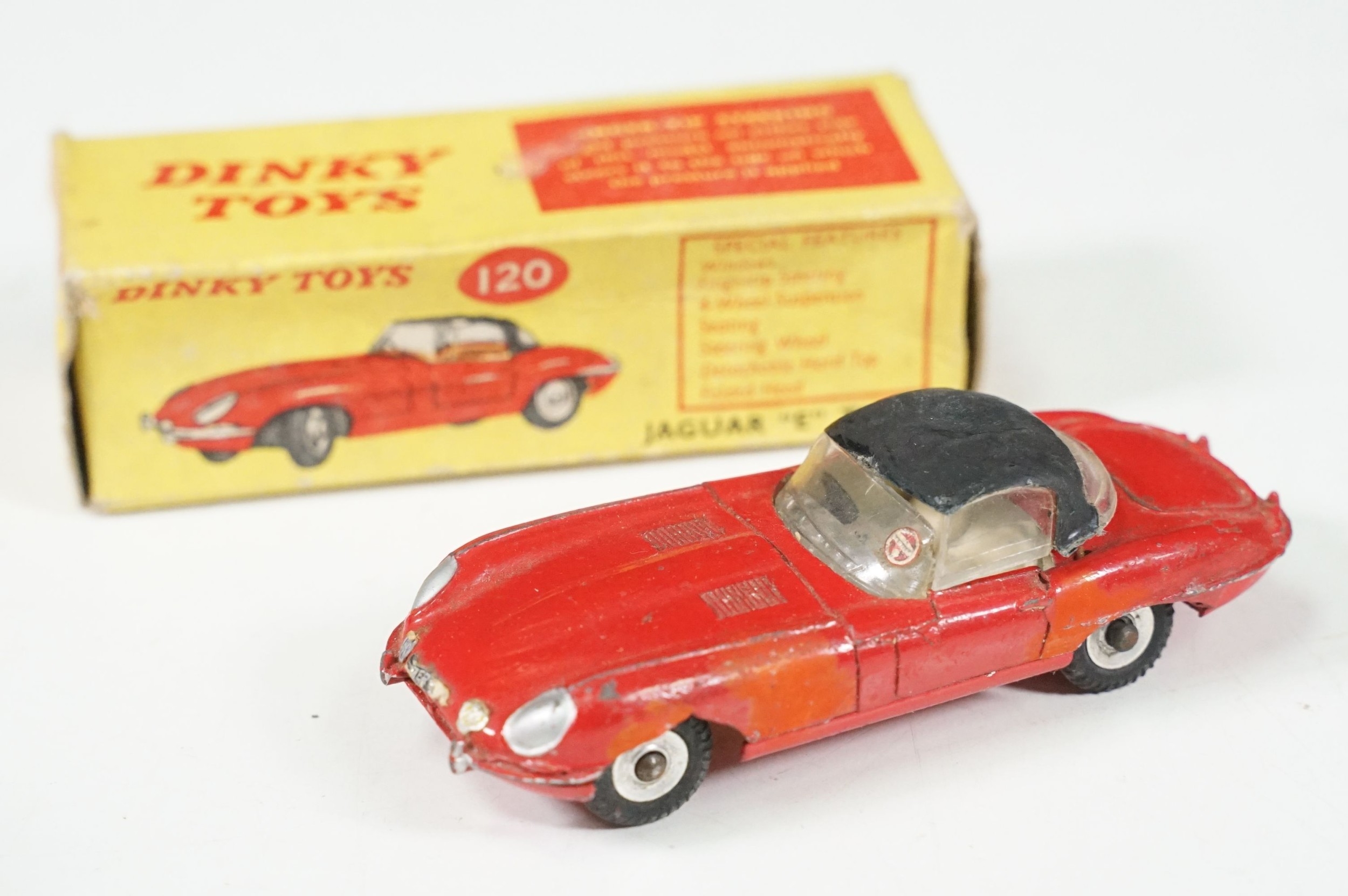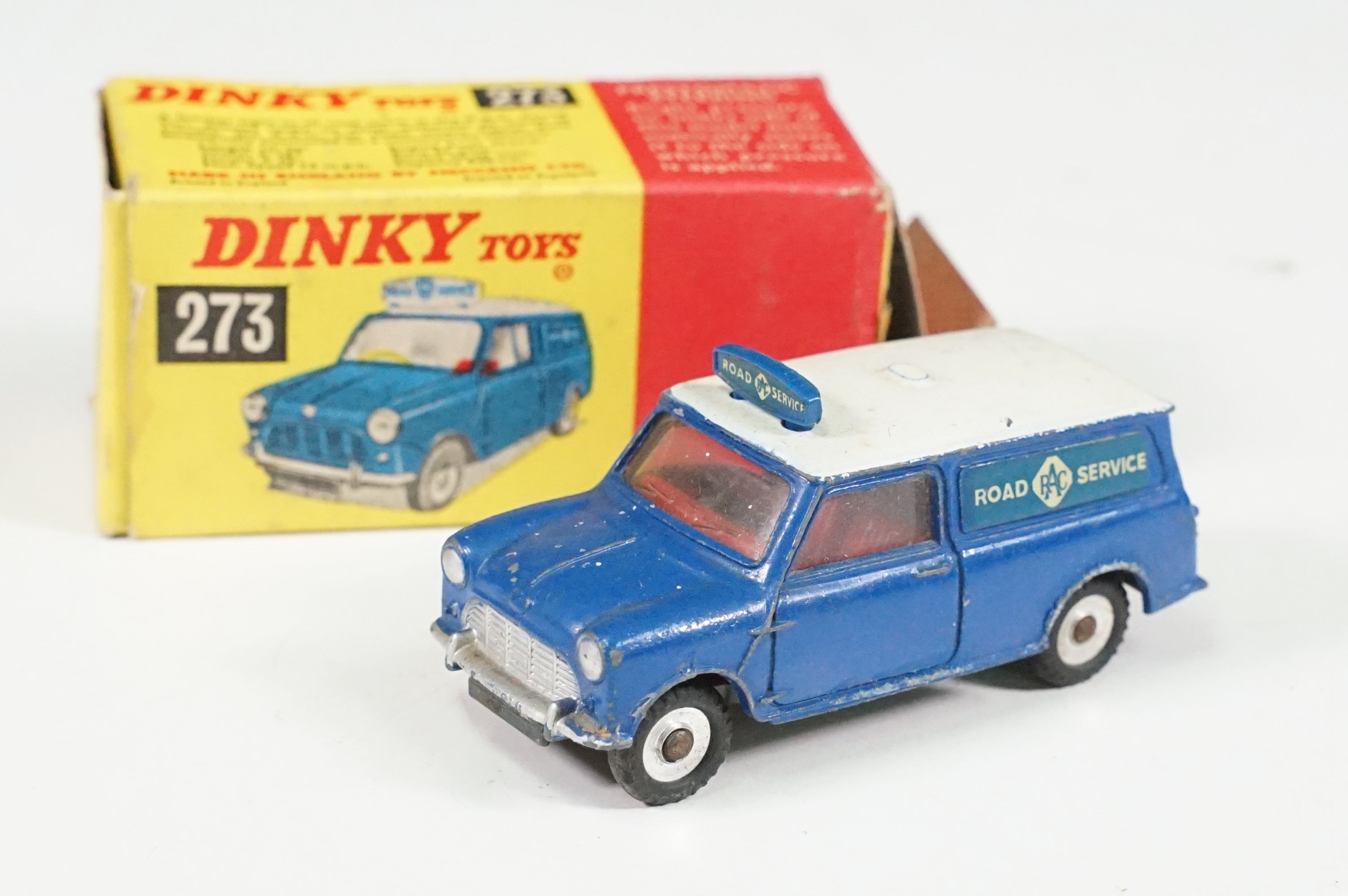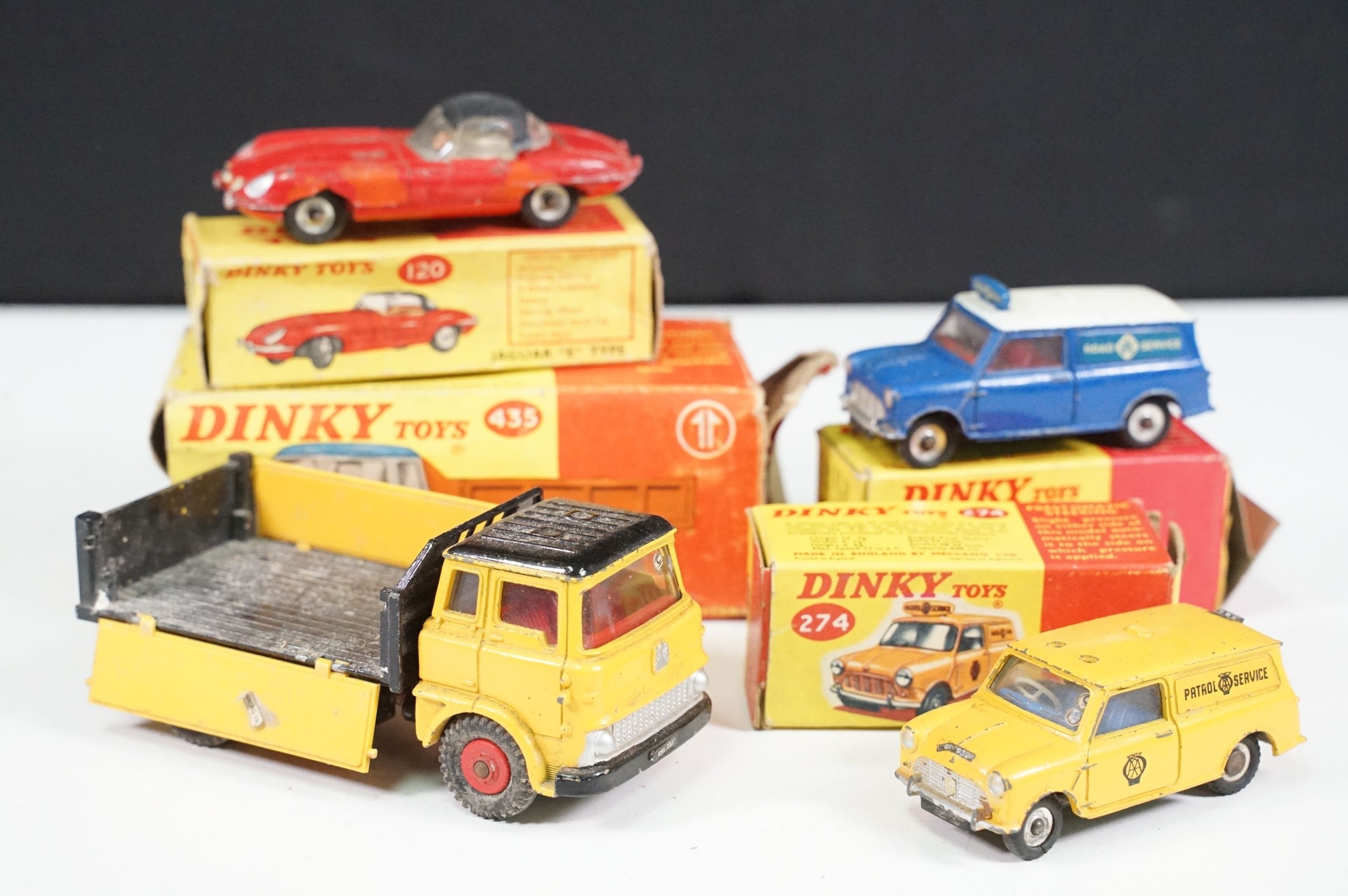 Four boxed play worn Dinky diecast models to include 273 RAC Patrol Mini Van, 274 AA Mini Van, 120 Jaguar E Type and 435 Bedford TK Tipper, all showing paint and play wear, boxes with missing end flaps and wear