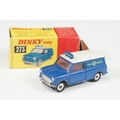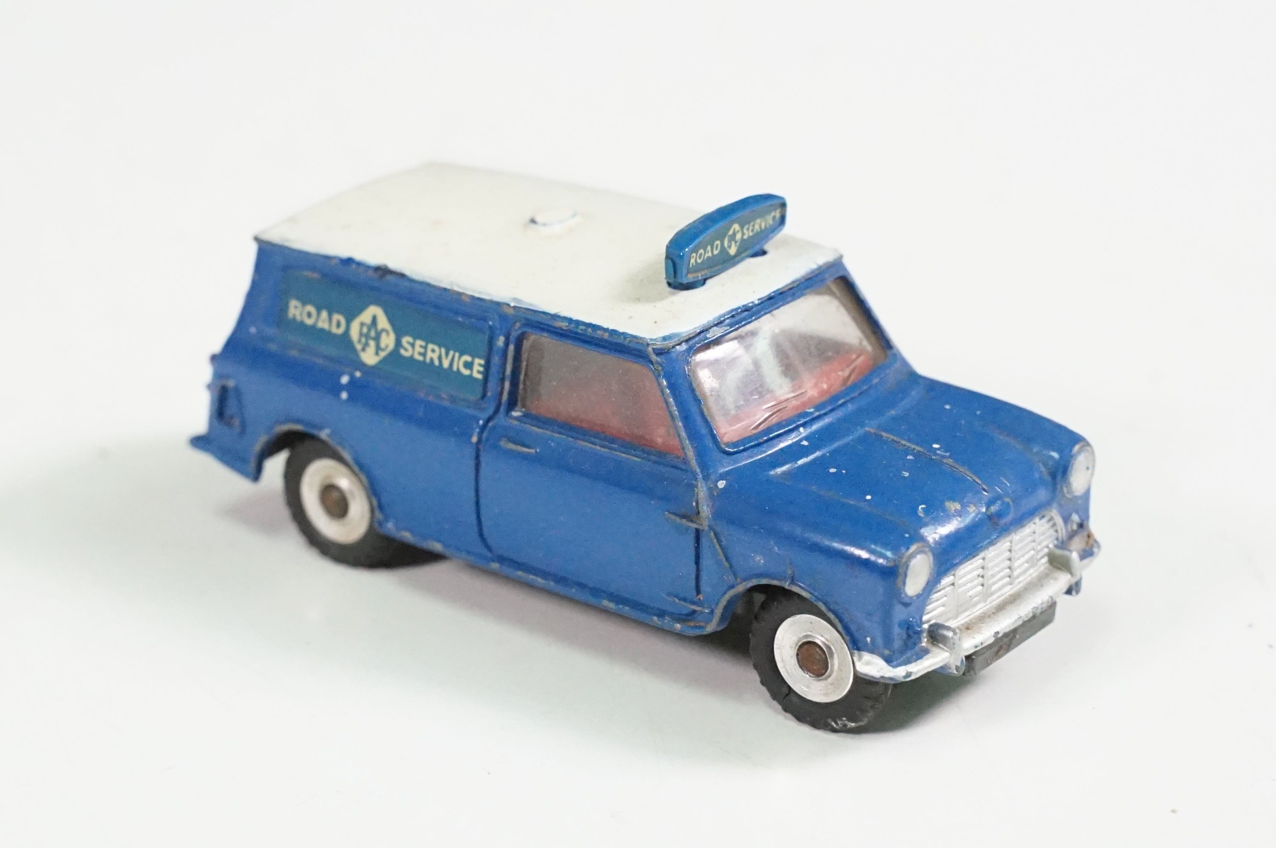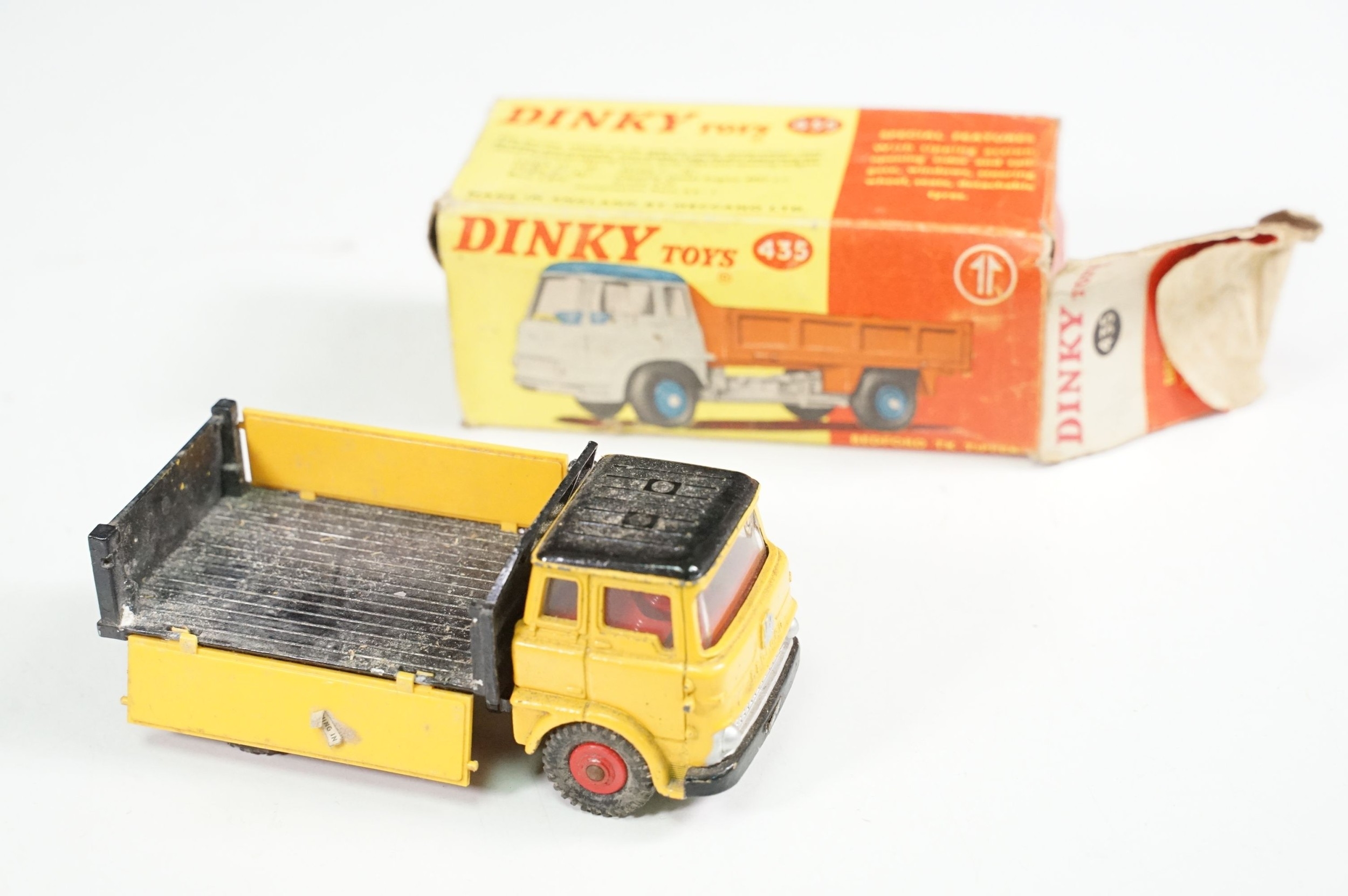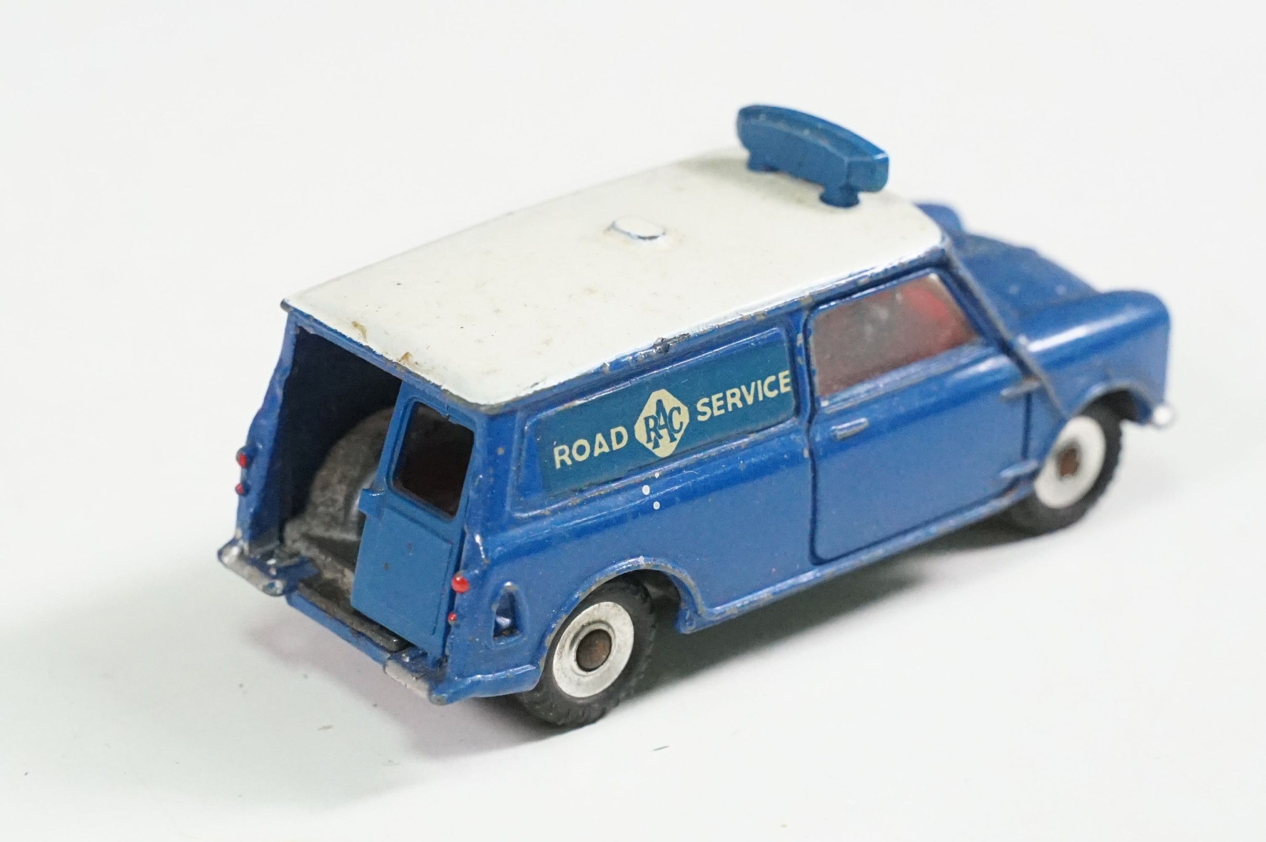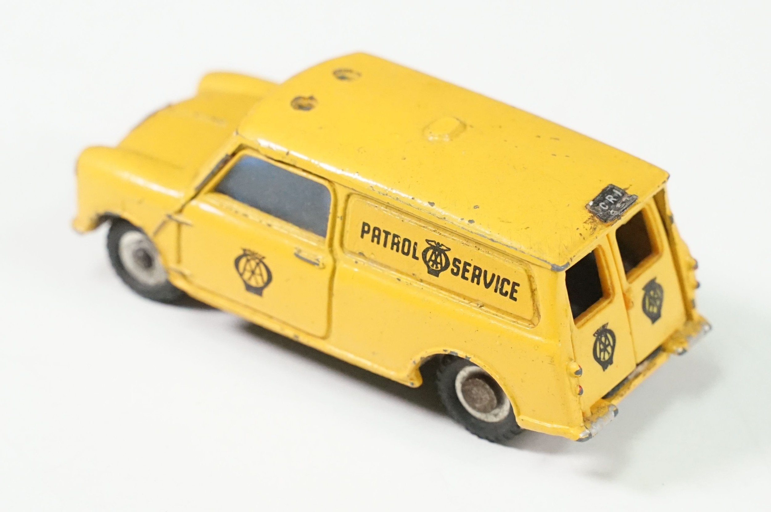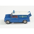 Four boxed play worn Dinky diecast models to include 273 RAC Patrol Mini Van, 274 AA Mini Van, 120 Jaguar E Type and 435 Bedford TK Tipper, all showing paint and play wear, boxes with missing end flaps and wear