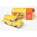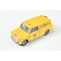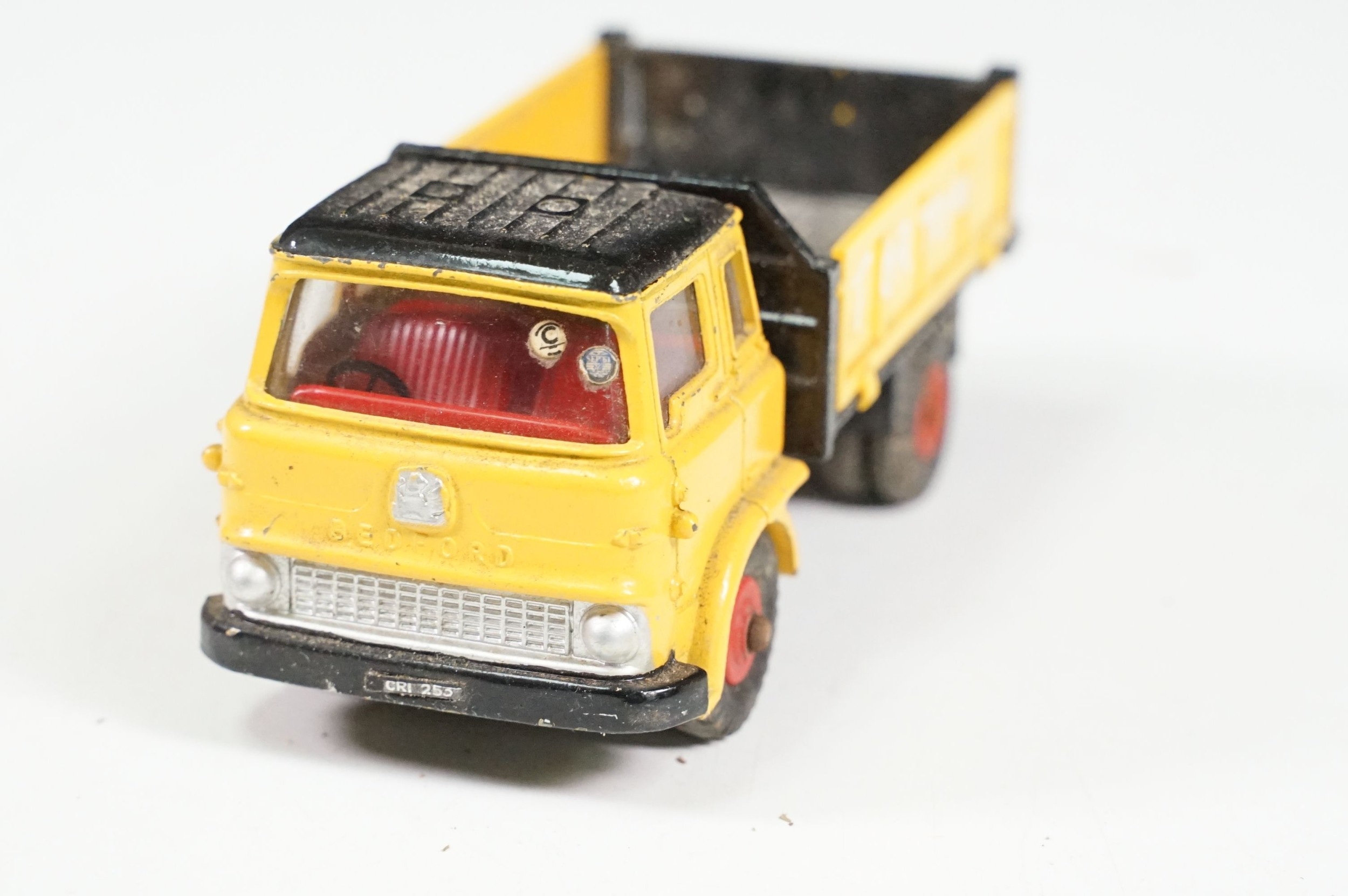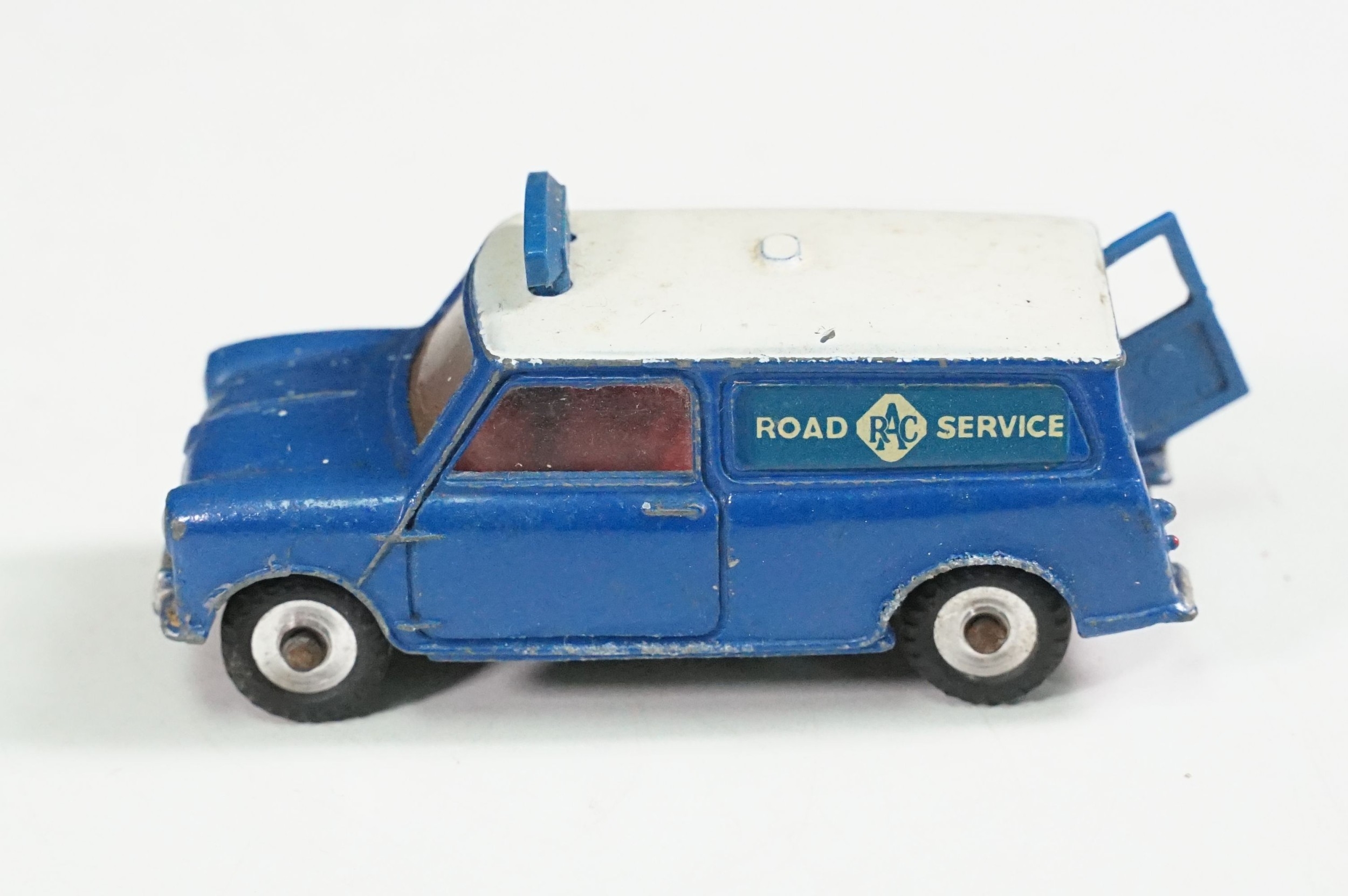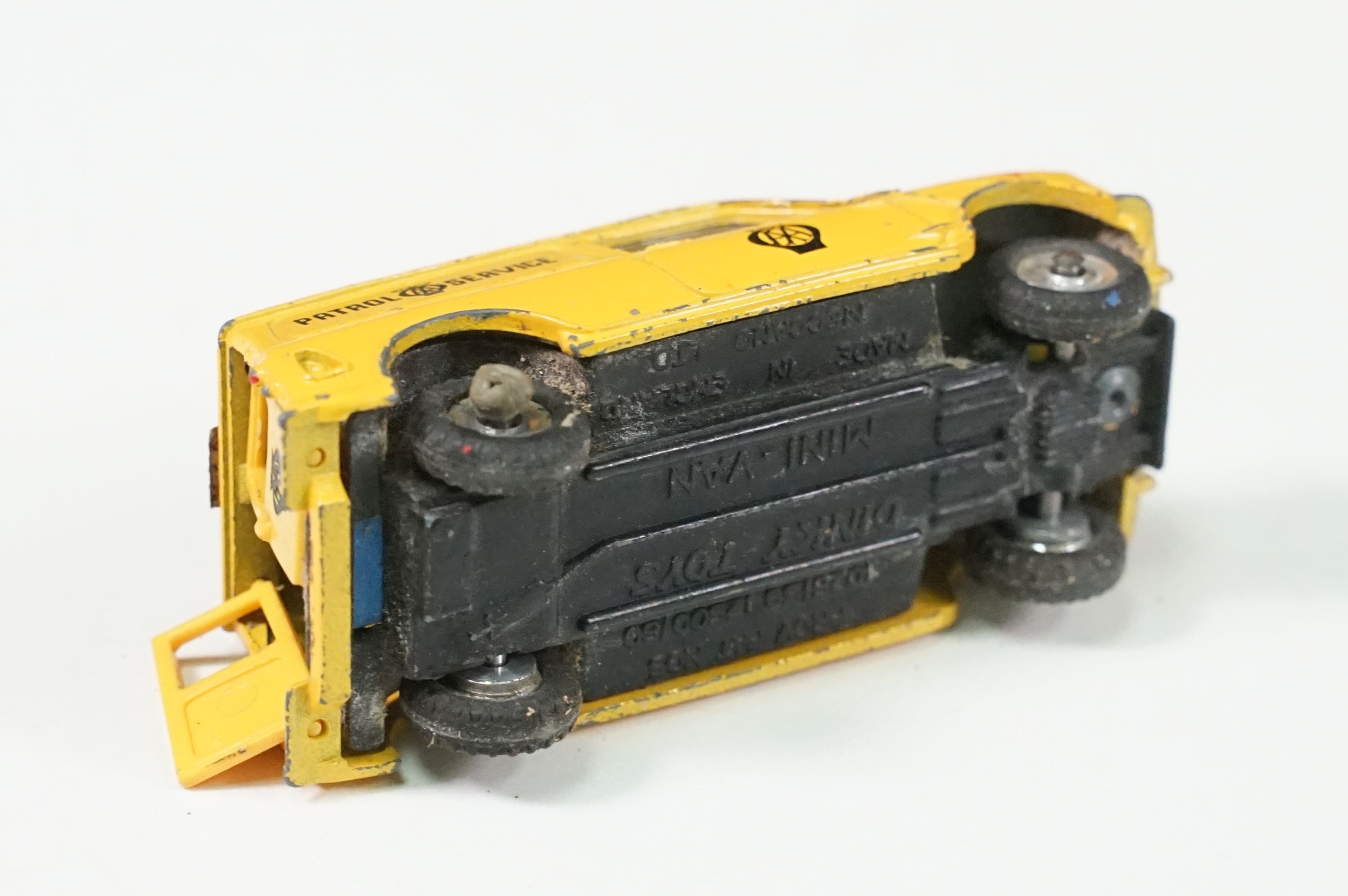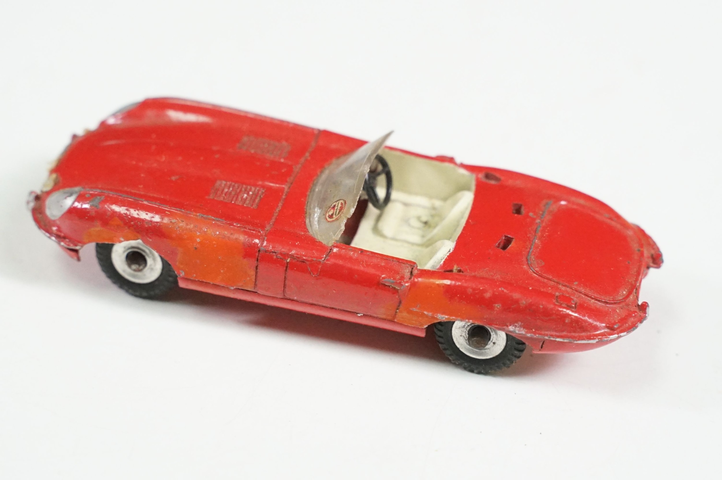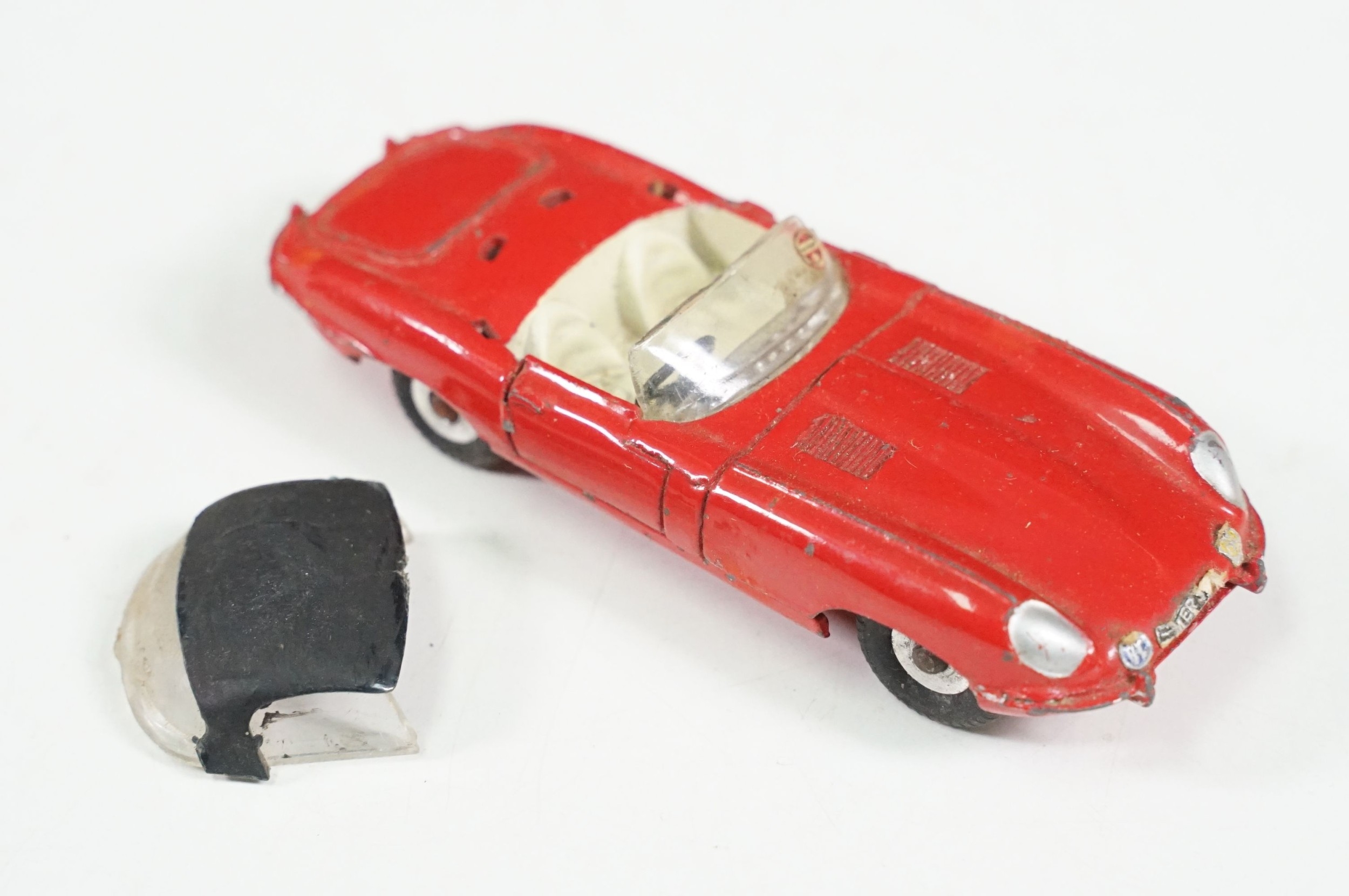 Four boxed play worn Dinky diecast models to include 273 RAC Patrol Mini Van, 274 AA Mini Van, 120 Jaguar E Type and 435 Bedford TK Tipper, all showing paint and play wear, boxes with missing end flaps and wear