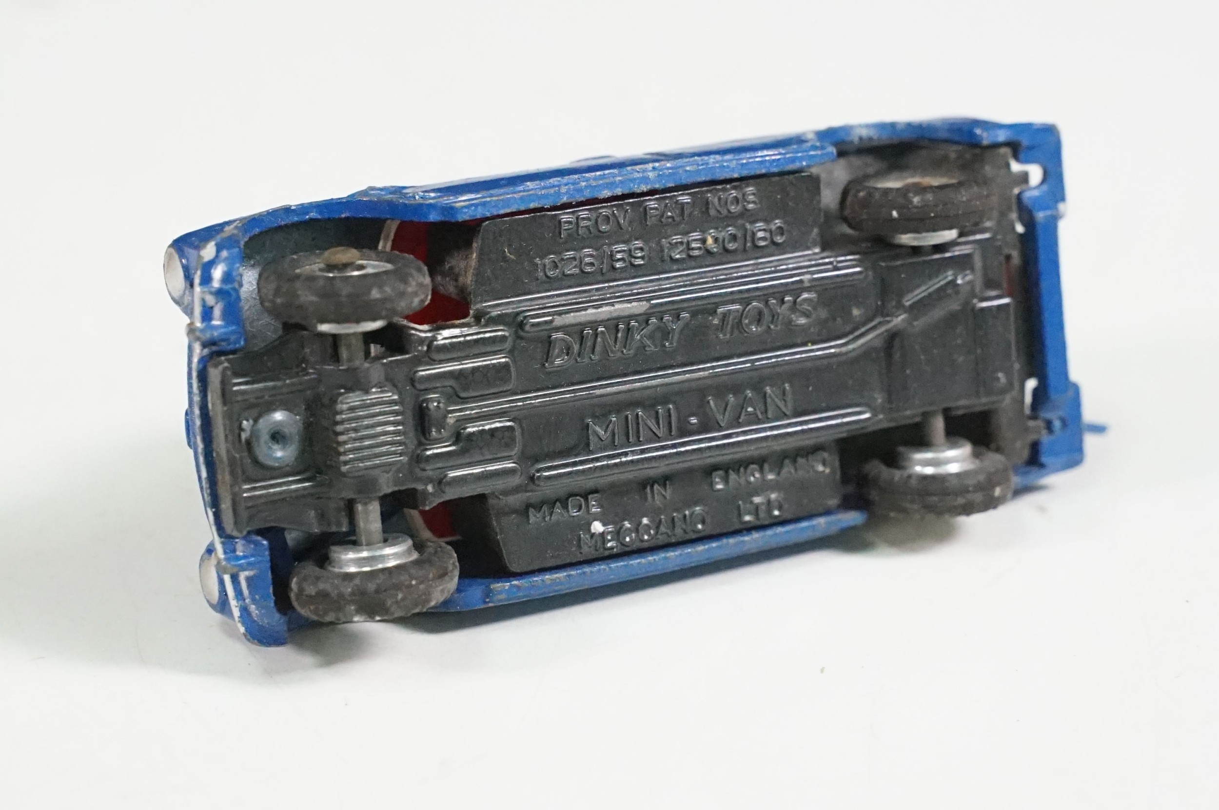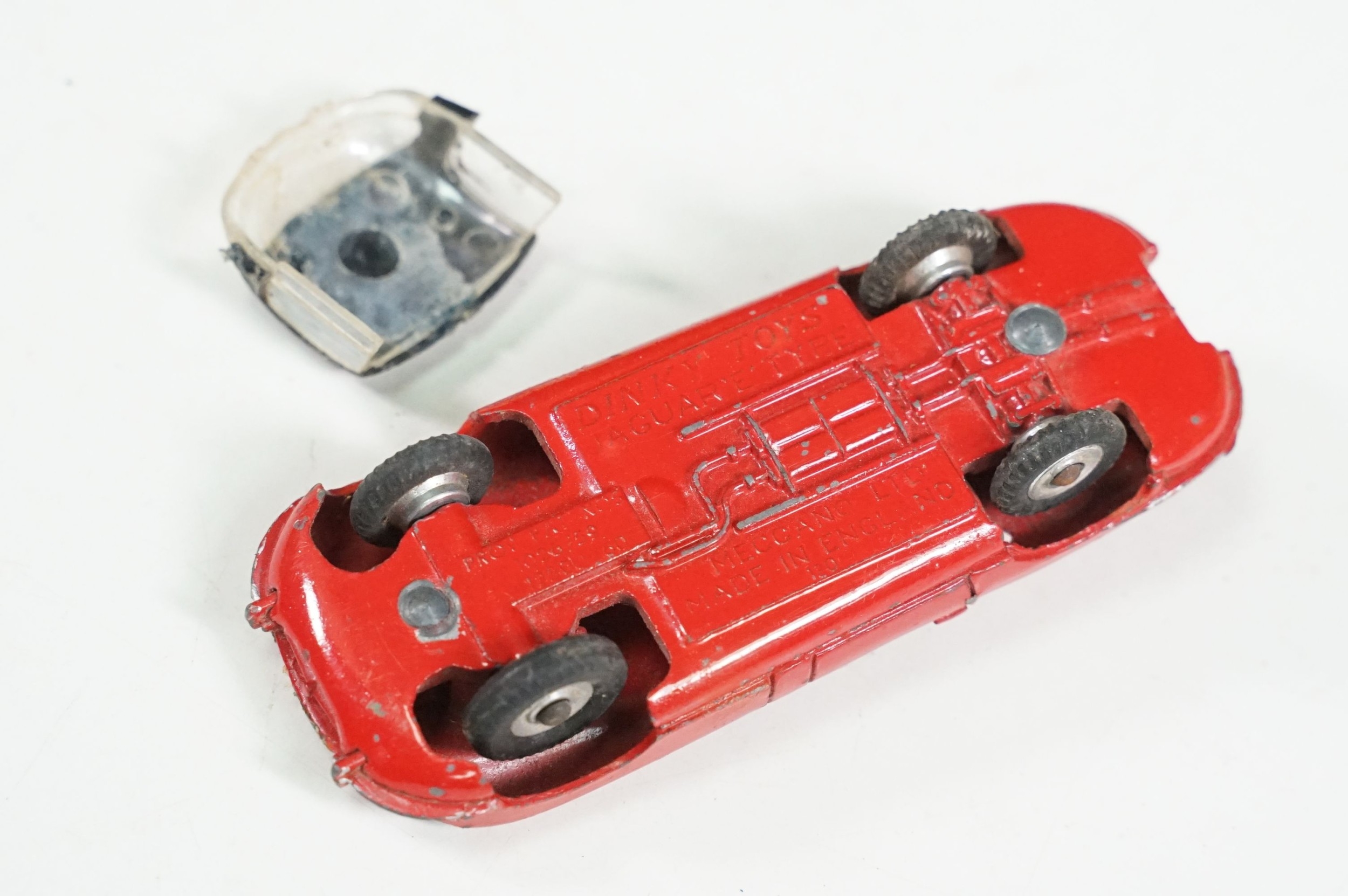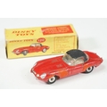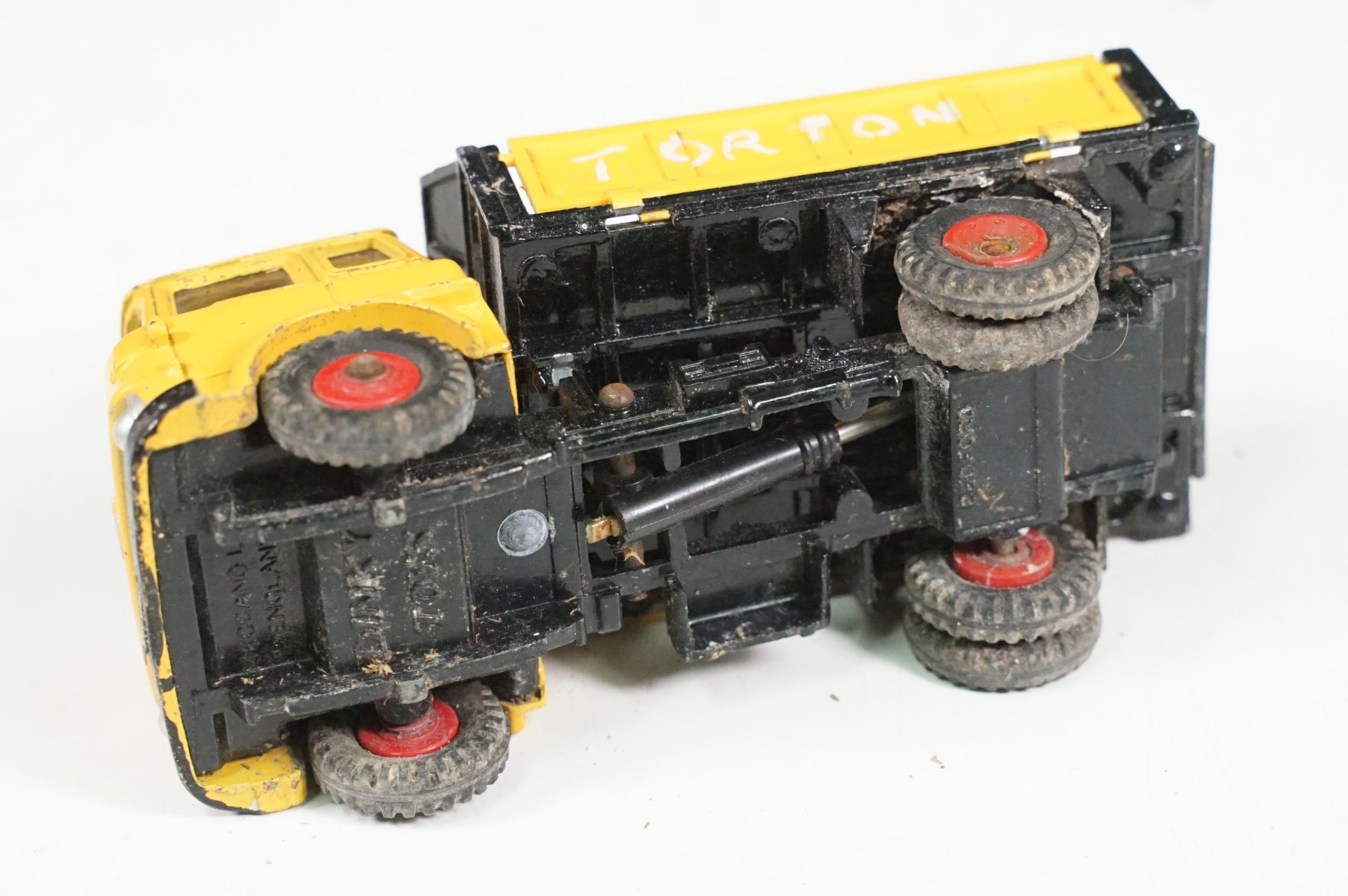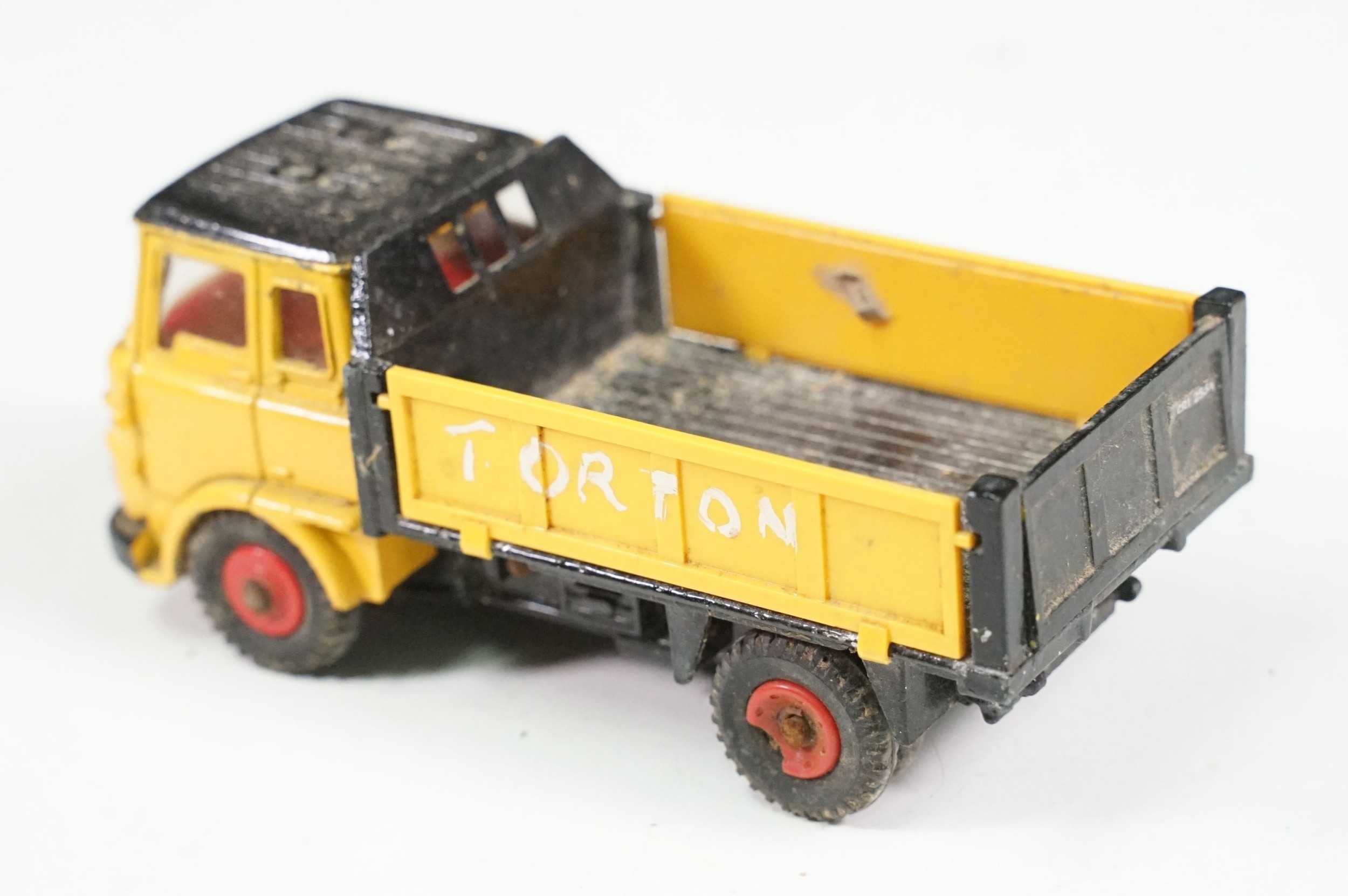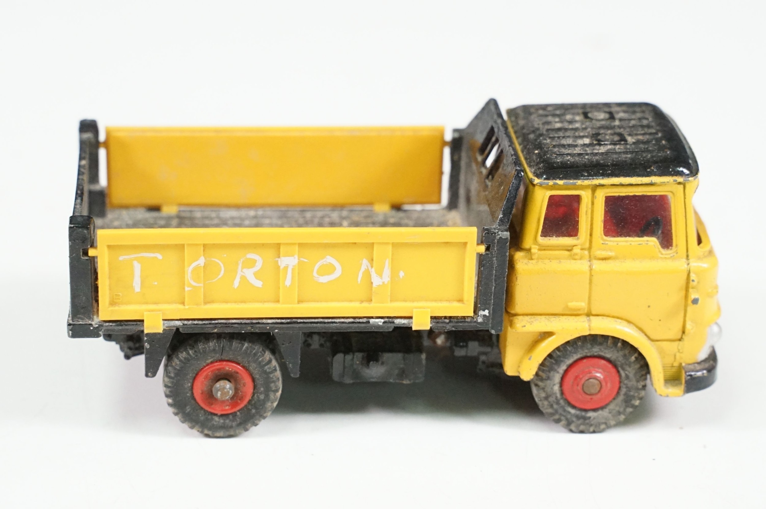Four boxed play worn Dinky diecast models to include 273 RAC Patrol Mini Van, 274 AA Mini Van, 120 Jaguar E Type and 435 Bedford TK Tipper, all showing paint and play wear, boxes with missing end flaps and wear