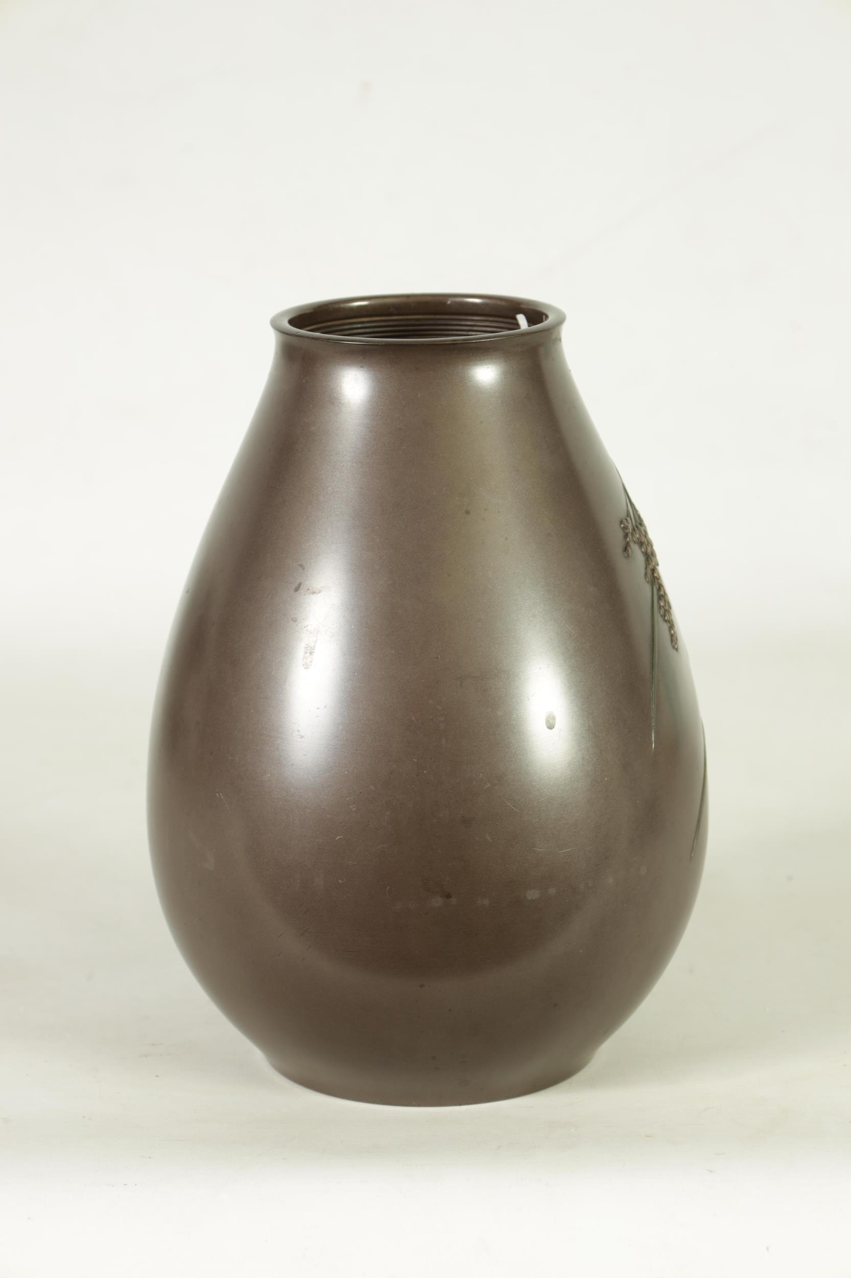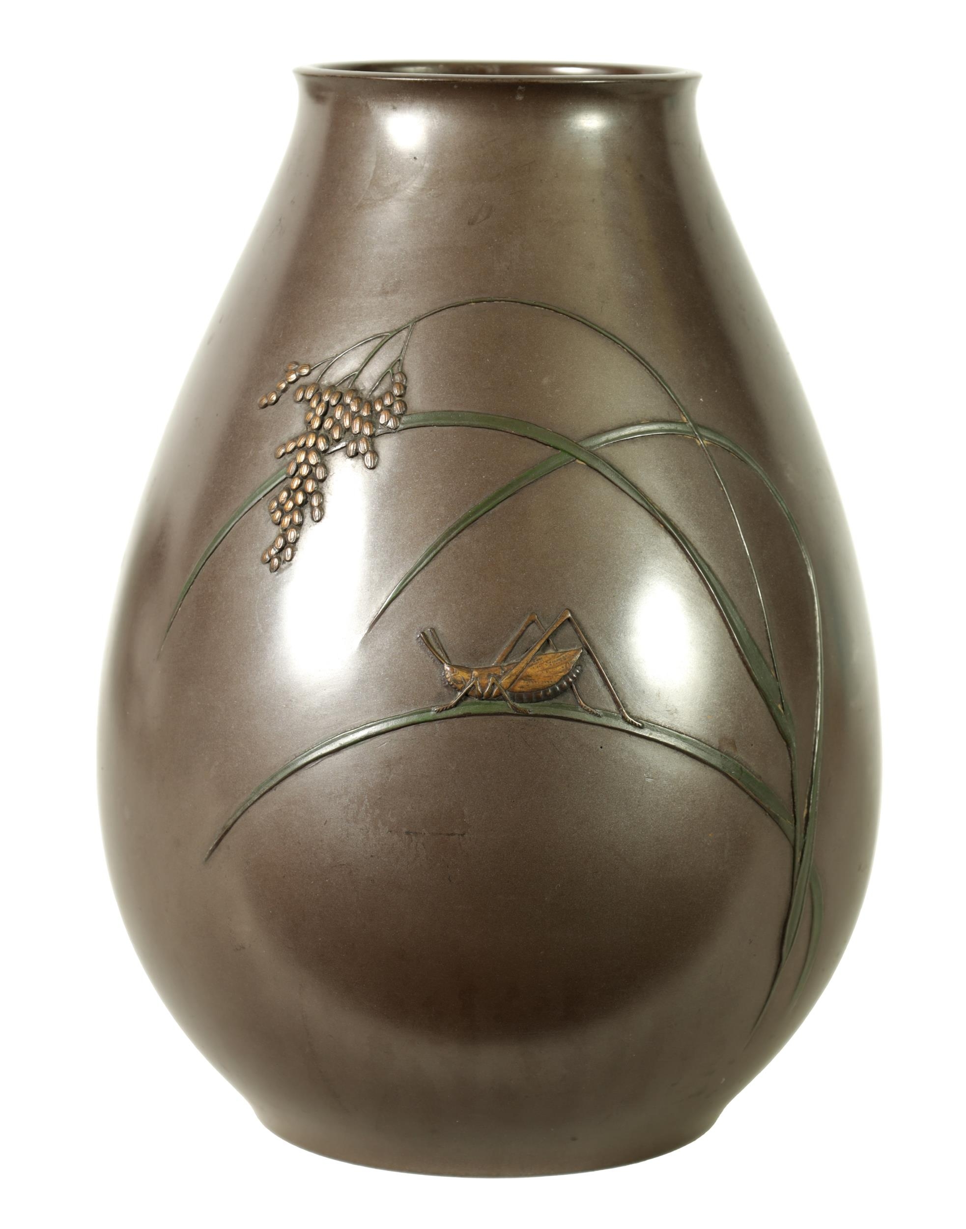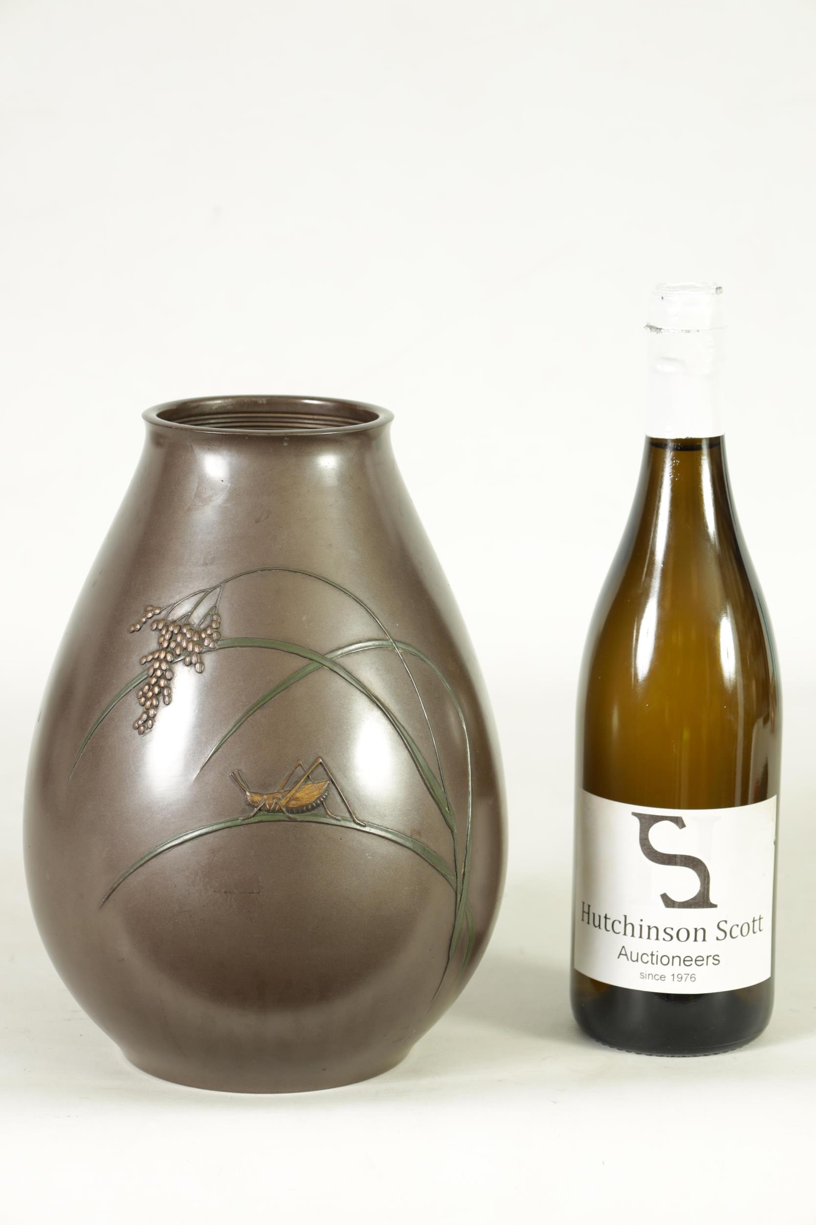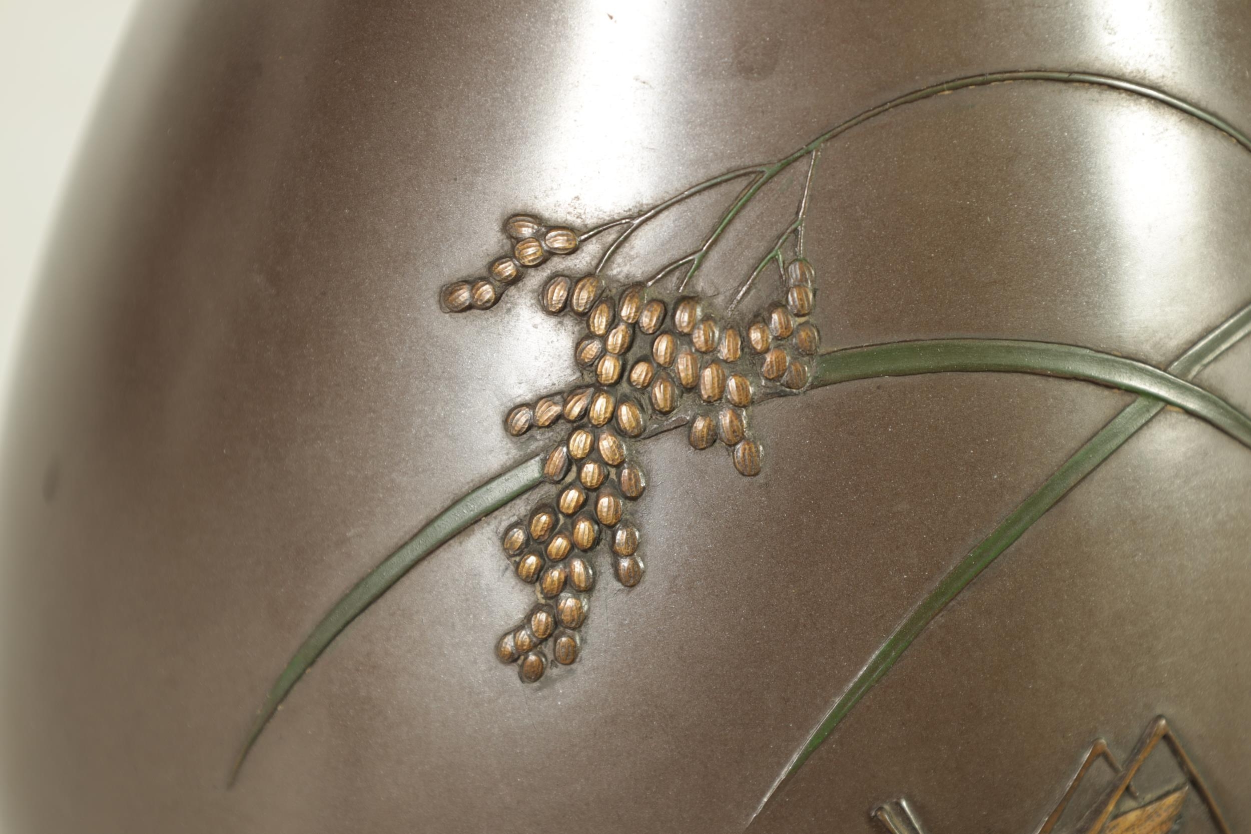 A JAPANESE MEIJI PERIOD BRONZE AND MIXED METAL OVOID VASE with flowering grass and locust decoration - signed to the side. (25cm high )