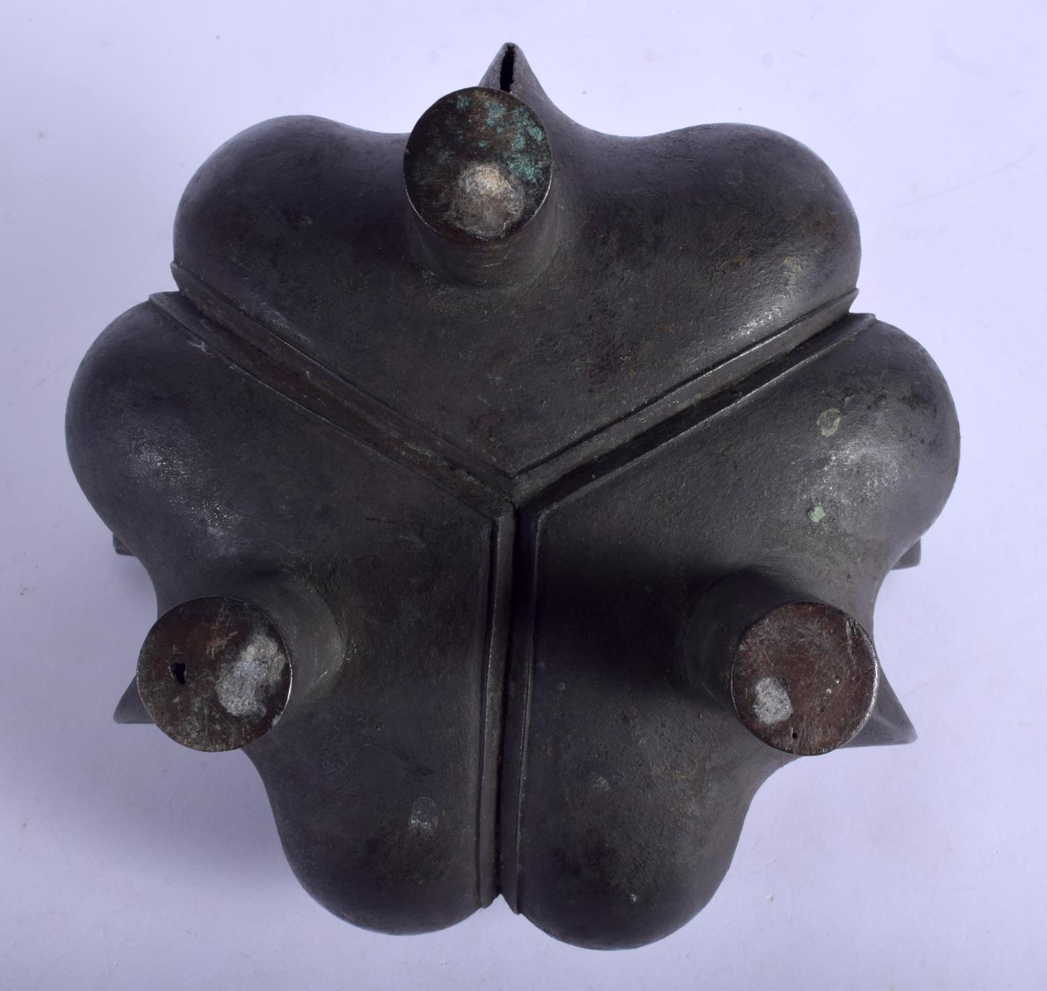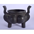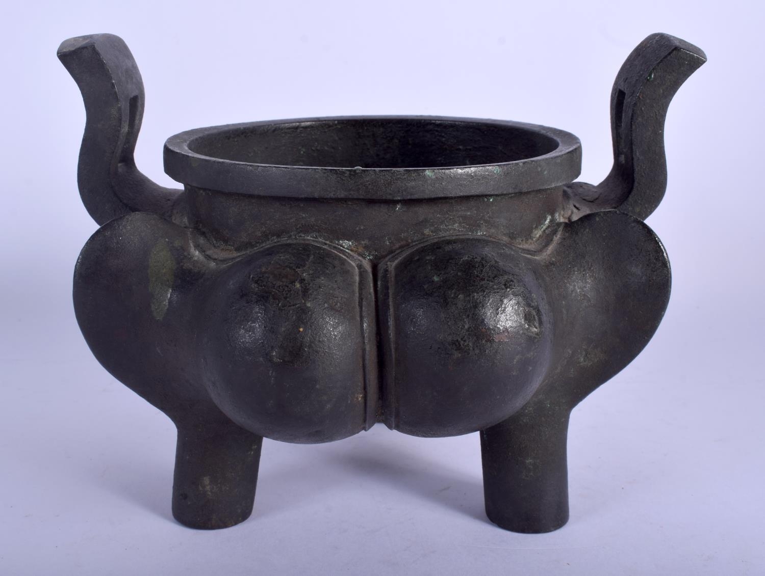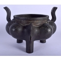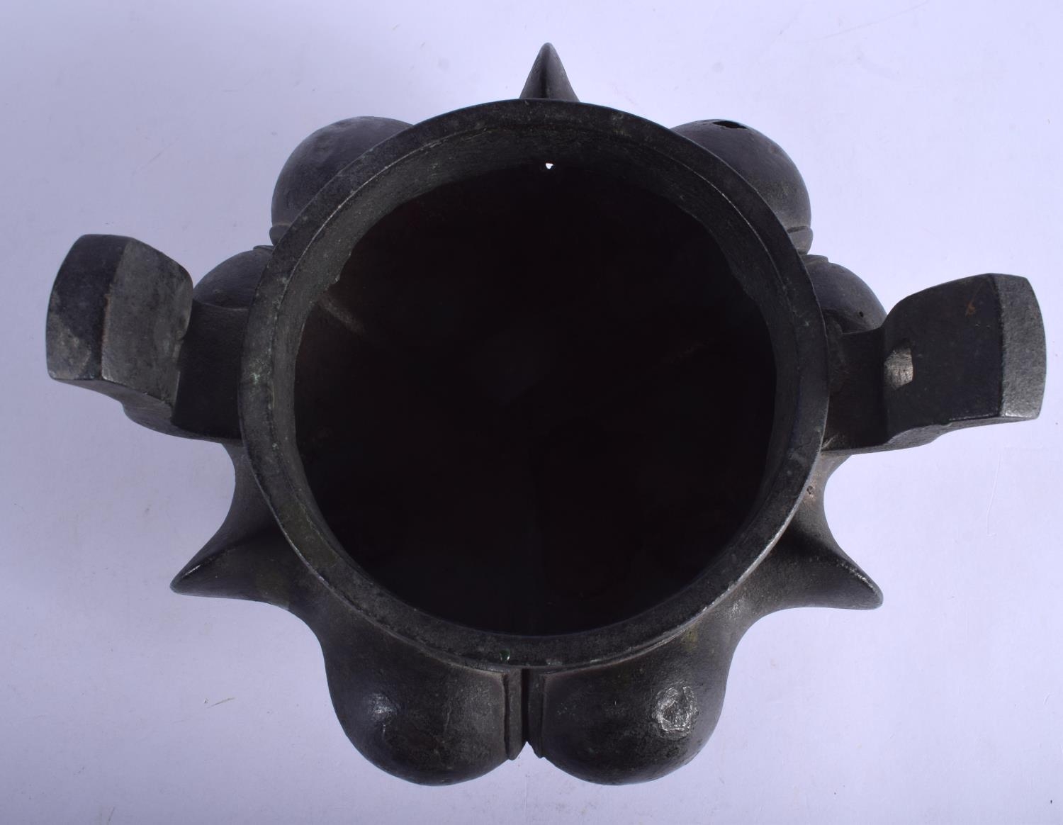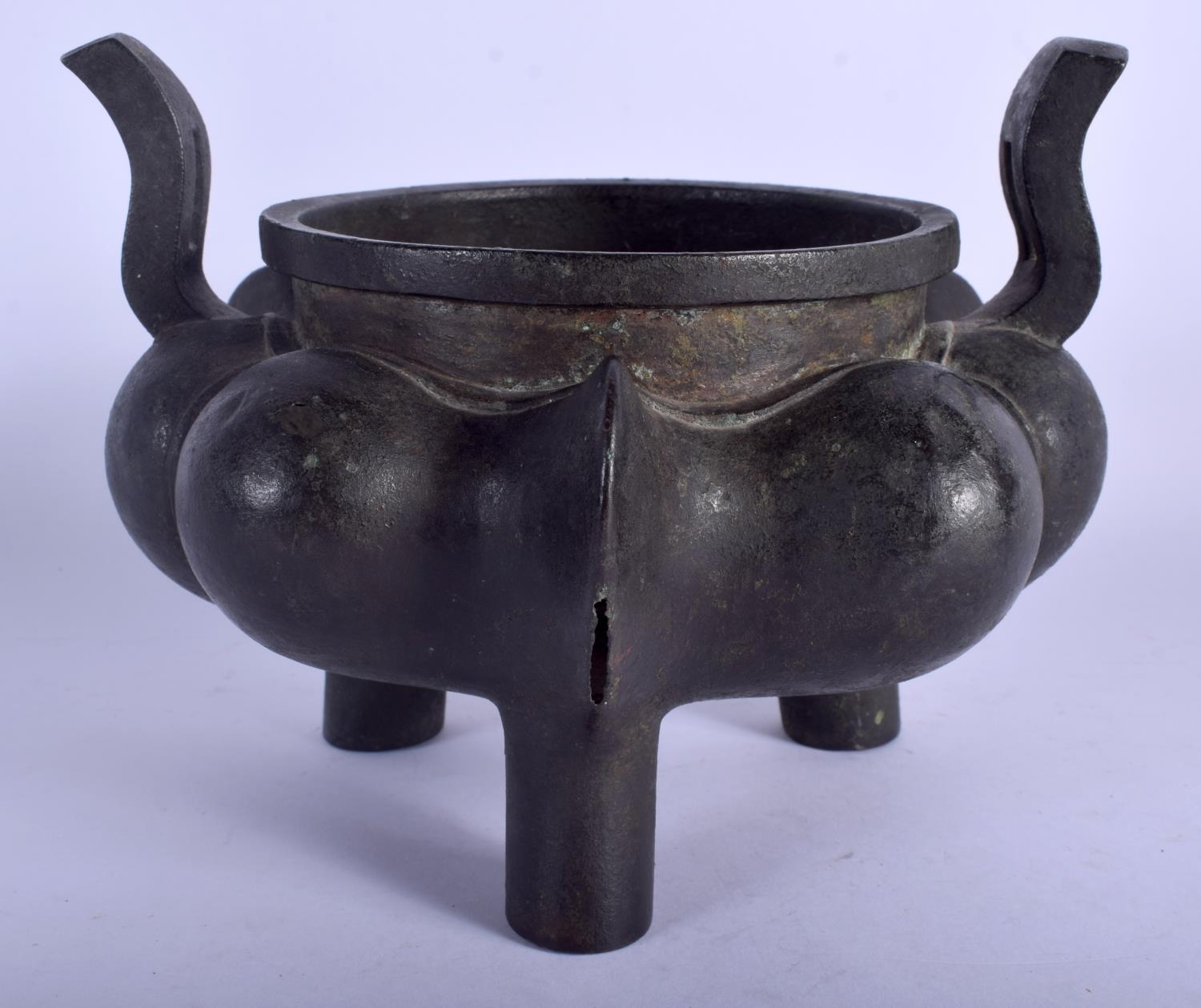 AN 18TH/19TH CENTURY CHINESE LOBED BRONZE CENSER Ming style, with high looping handles. 1863 grams. 18 cm wide, internal width 11.5 cm.