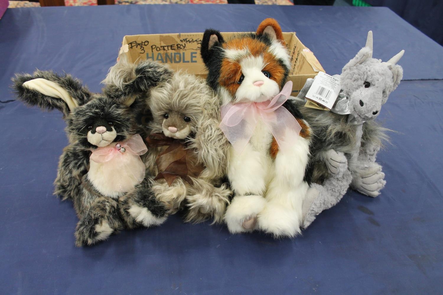 Charlie Bears to include CB235338O Shadow Night, 36cm tall, CB222265B La Di Dah, 35cm tall, CB124995 Penny, 33cm tall and CB124979 Coco, 27cm tall, each with tags, all would benefit from cleaning due to tobacco odour. (4)
