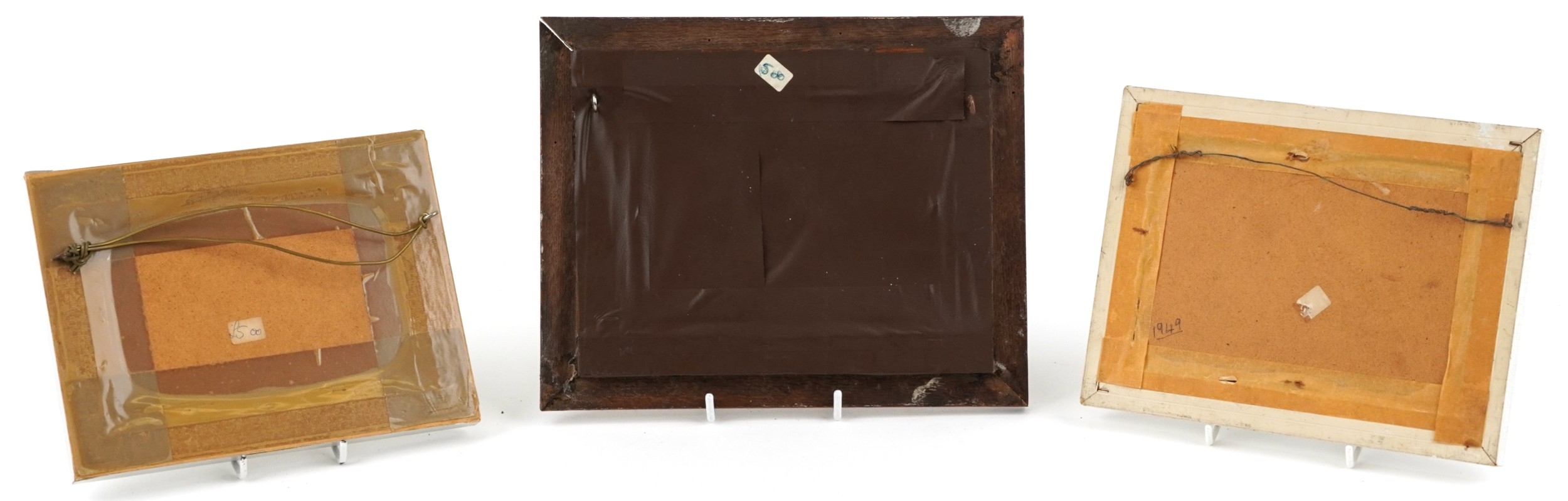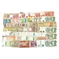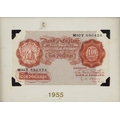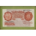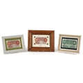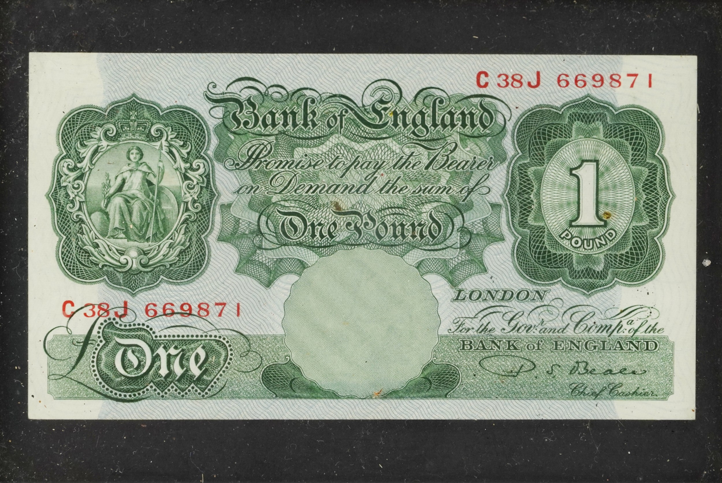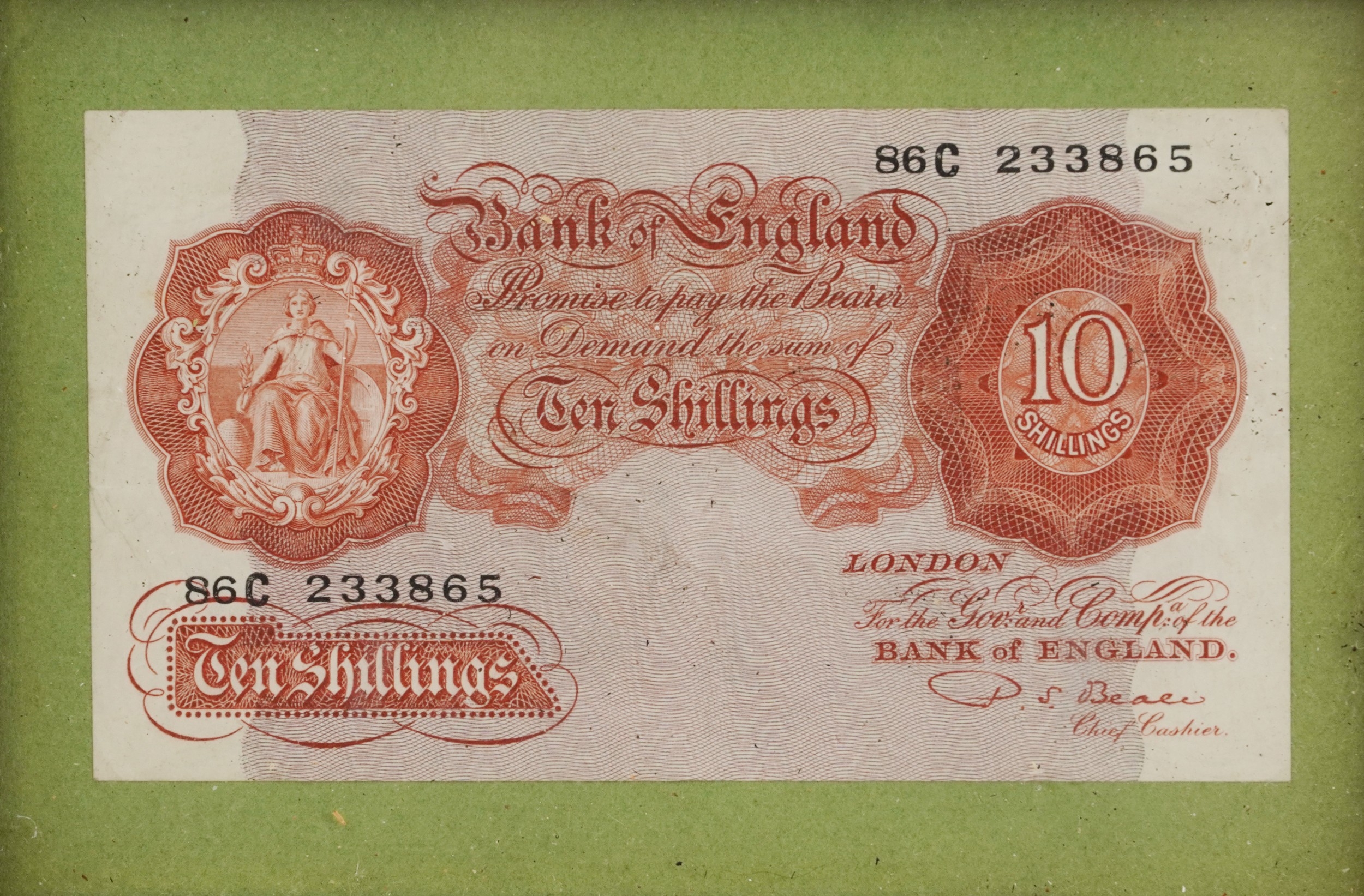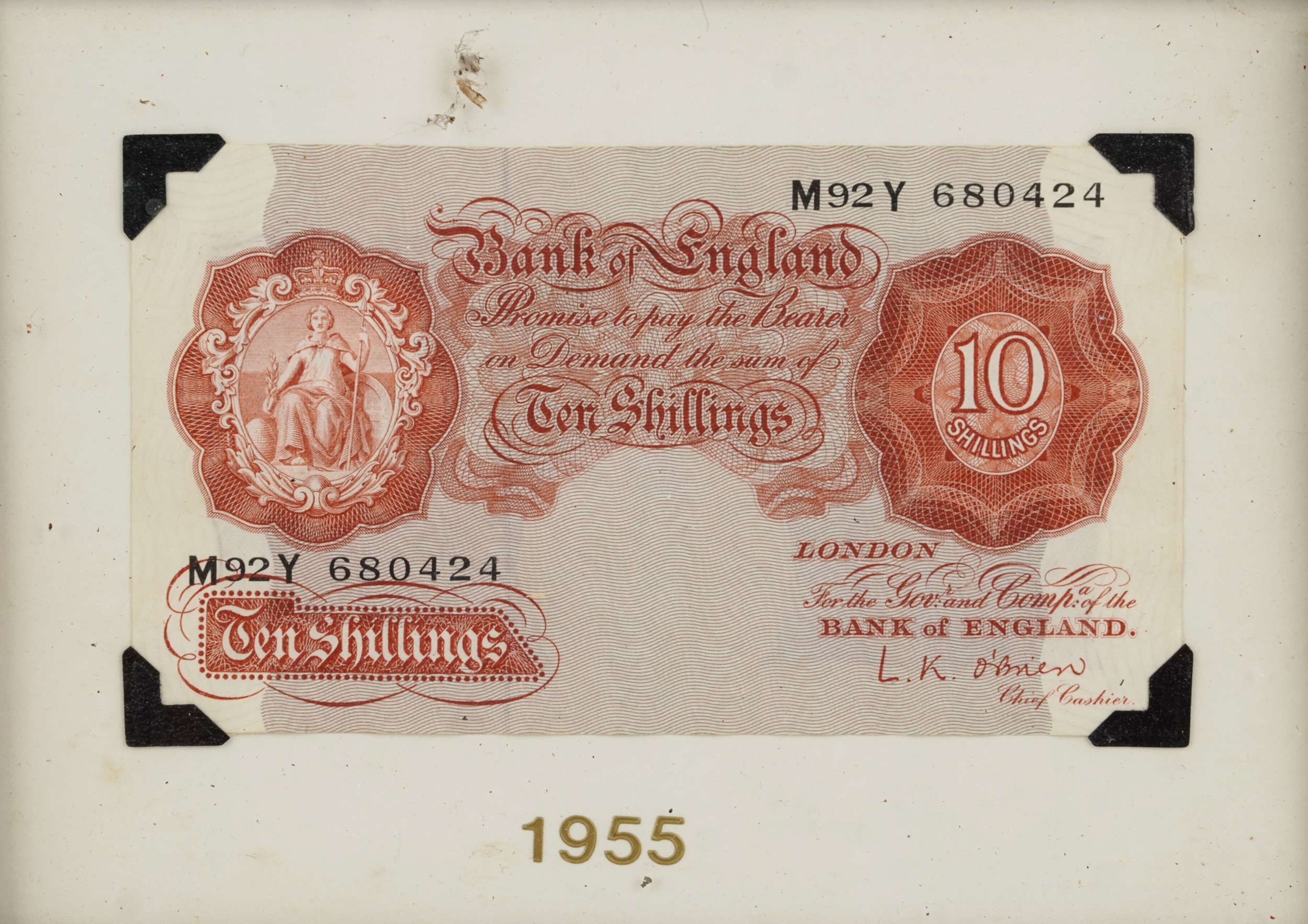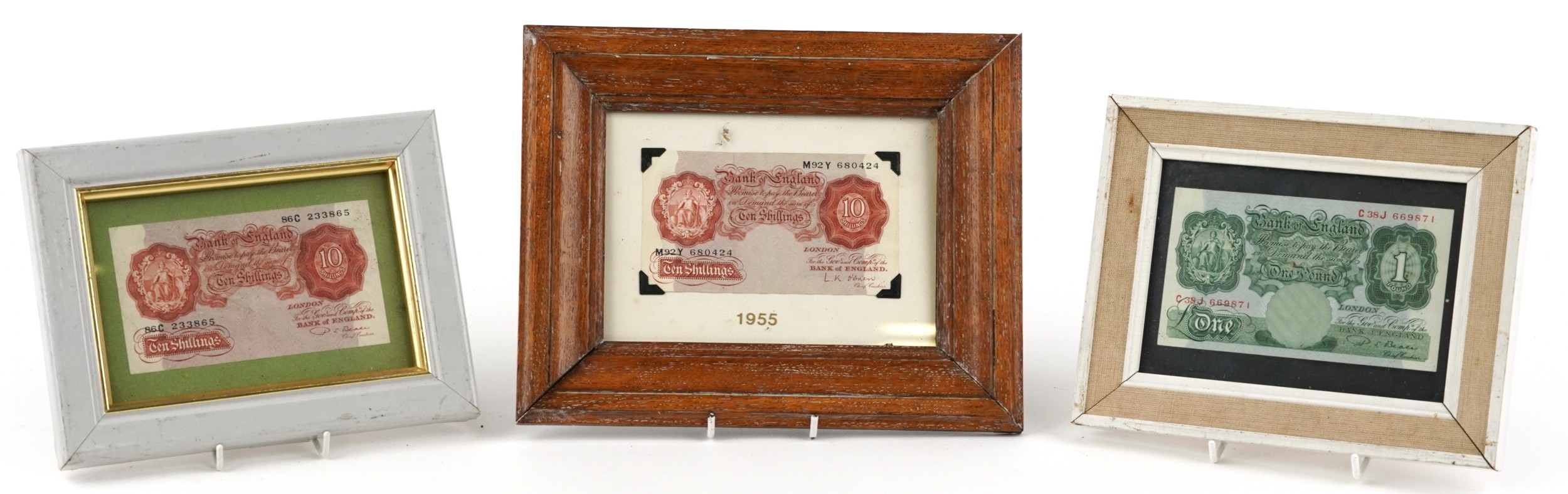 Three Bank of England seated Britannia 1950s to include 2 red-brown ten shillings notes and a one pound note, prefixes and serial numbers M92Y 680424 Chief Cashier L. K. O'Brien and 86C 233865 Chief Cashier P. S. Beale, the one pound note prefix and and serial number C38J 669871 Chief Cashier P. S. Beale, all housed in wooden frames.