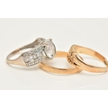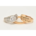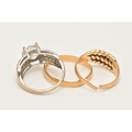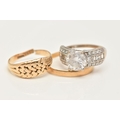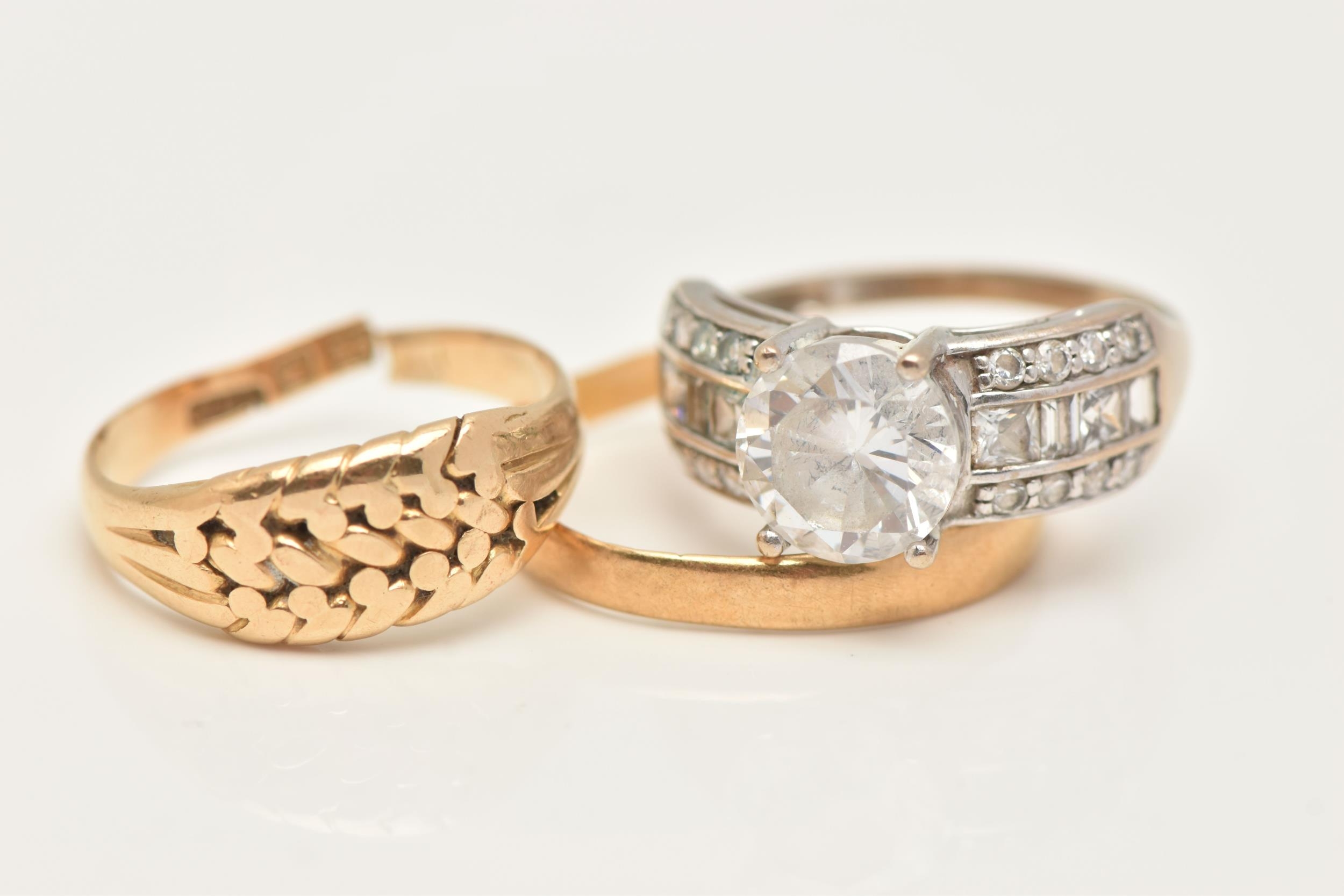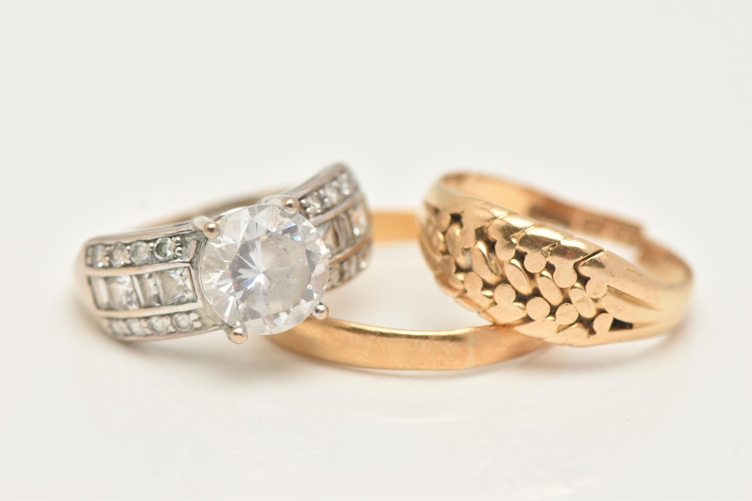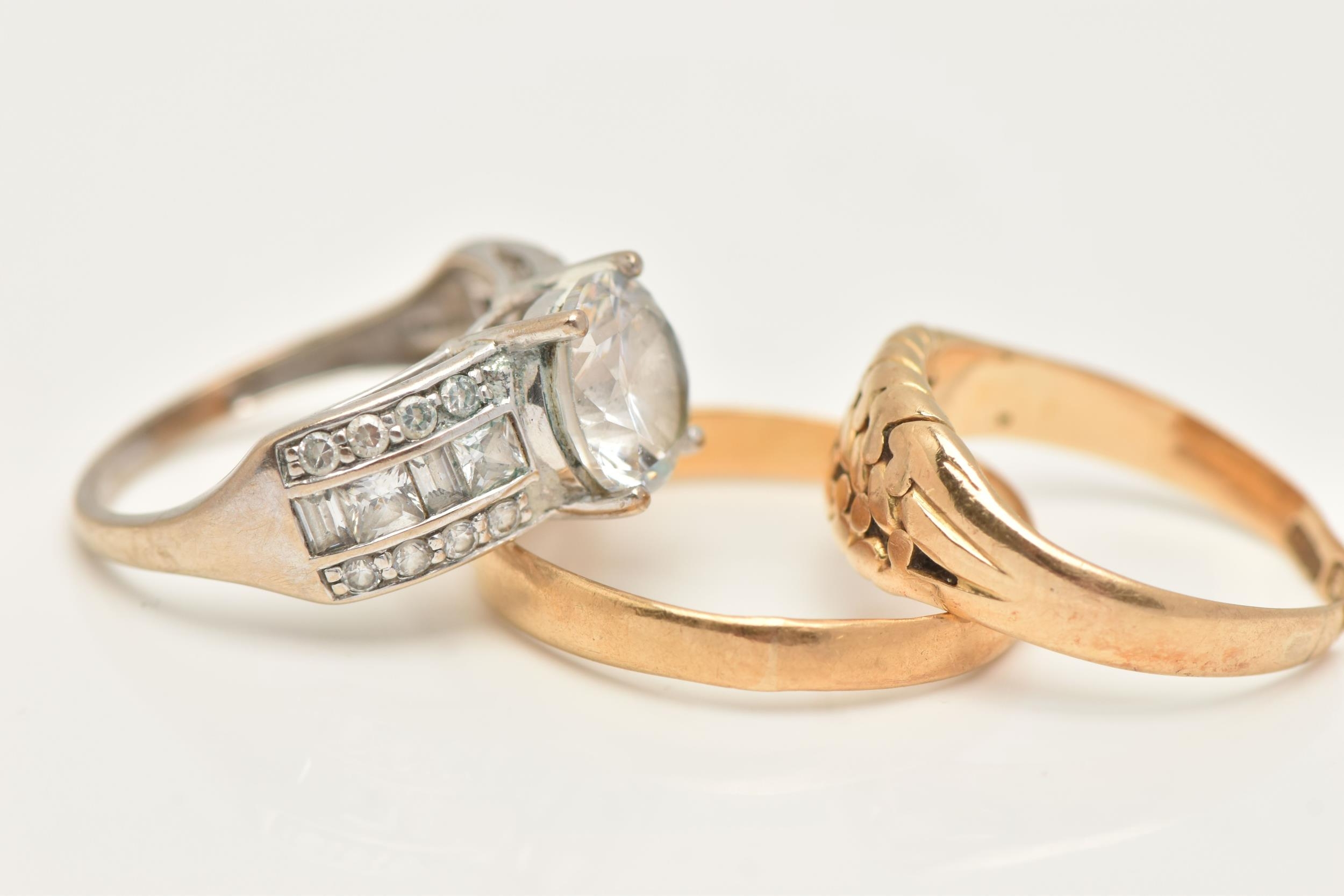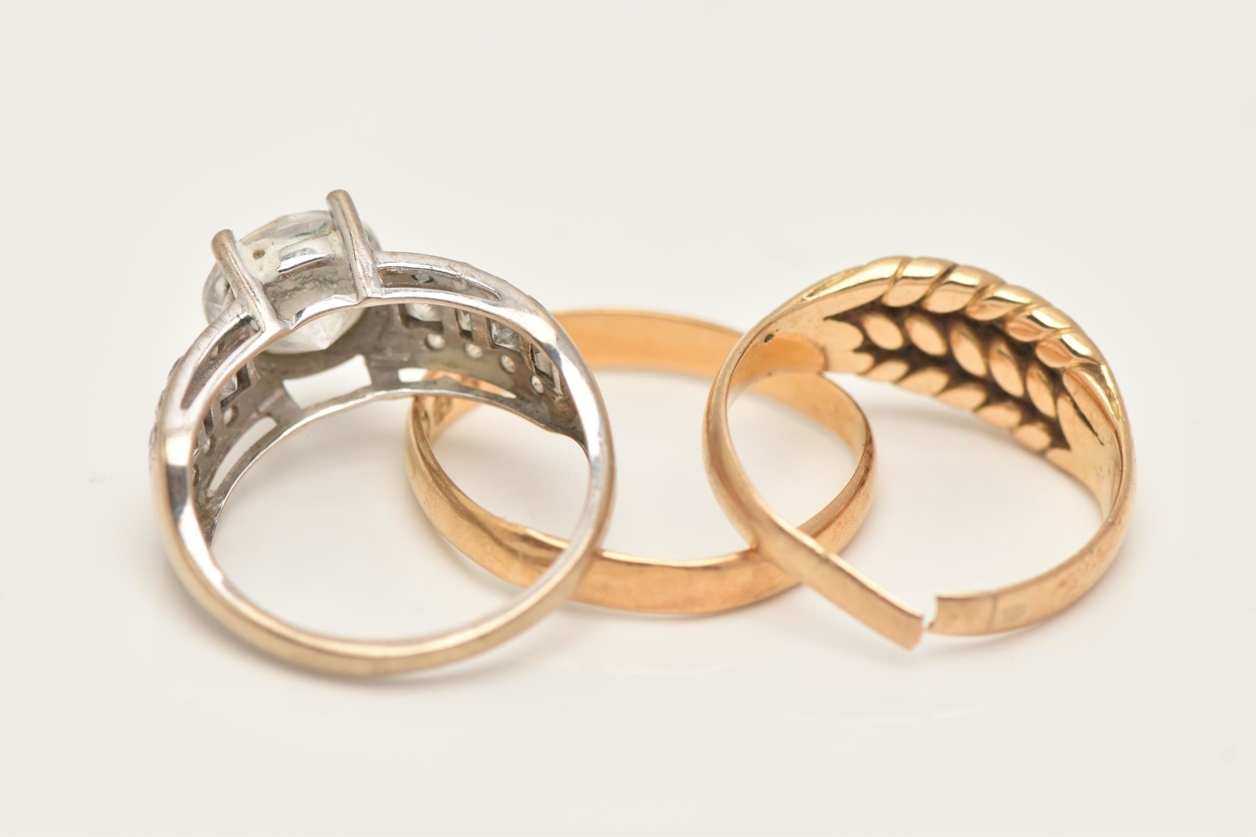 THREE RINGS, to include an AF 18ct gold worn woven ring, hallmarked 18ct split shank, approximate gross weight 3.5 grams, a 22ct gold polished band, hallmarked 22ct Sheffield, misshapen, approximate gross weight 1.9 grams, and a white metal cubic zirconia ring, stamped 375 CZ, ring size J, approximate gross weight 3.3 grams (condition report: both yellow gold rings require attention)