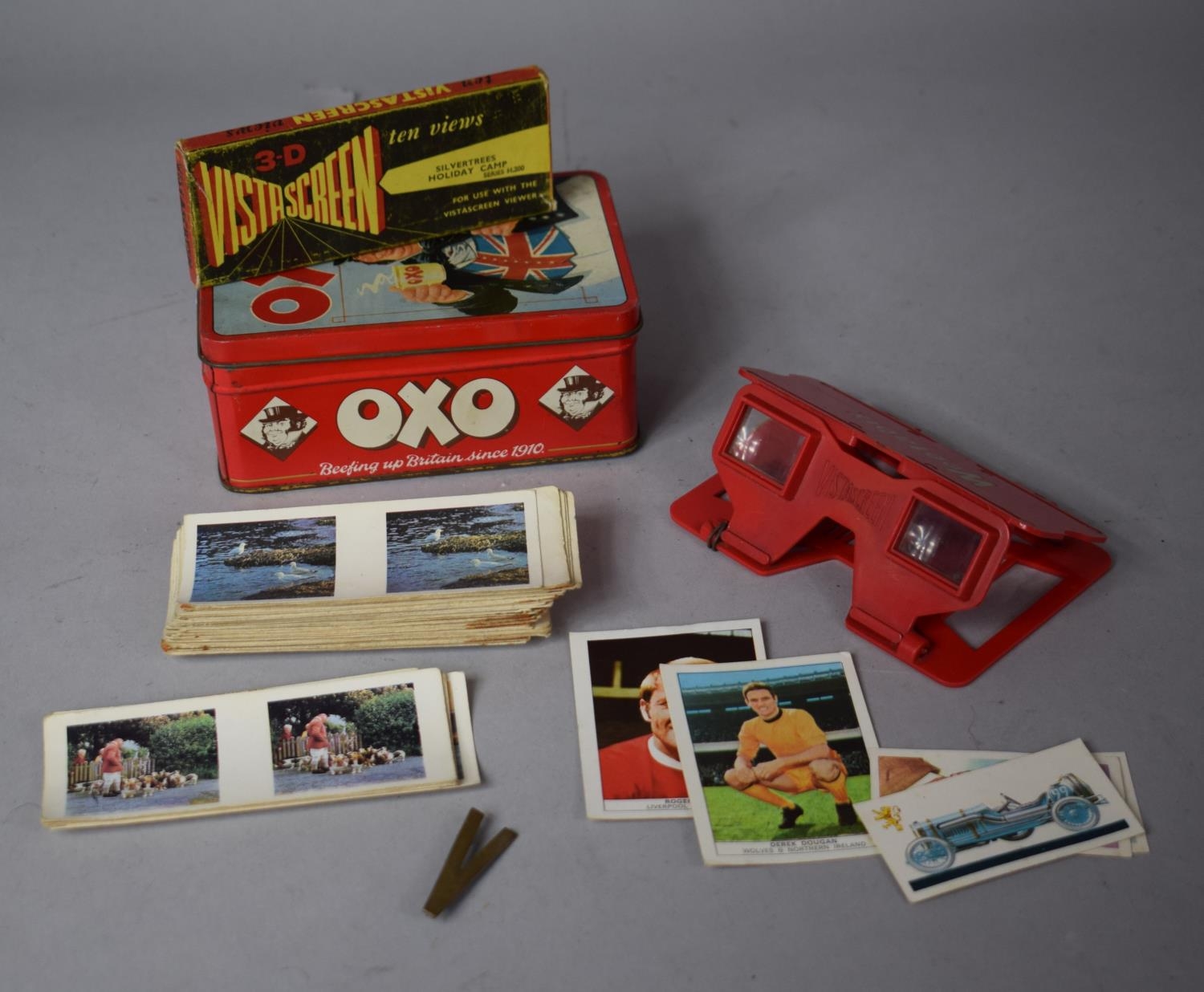 A Reproduction Oxo Tin Containing Weetabix Stereoscopic Viewer and Cards Including Silver Trees Holiday Camp, Football Cards etc