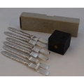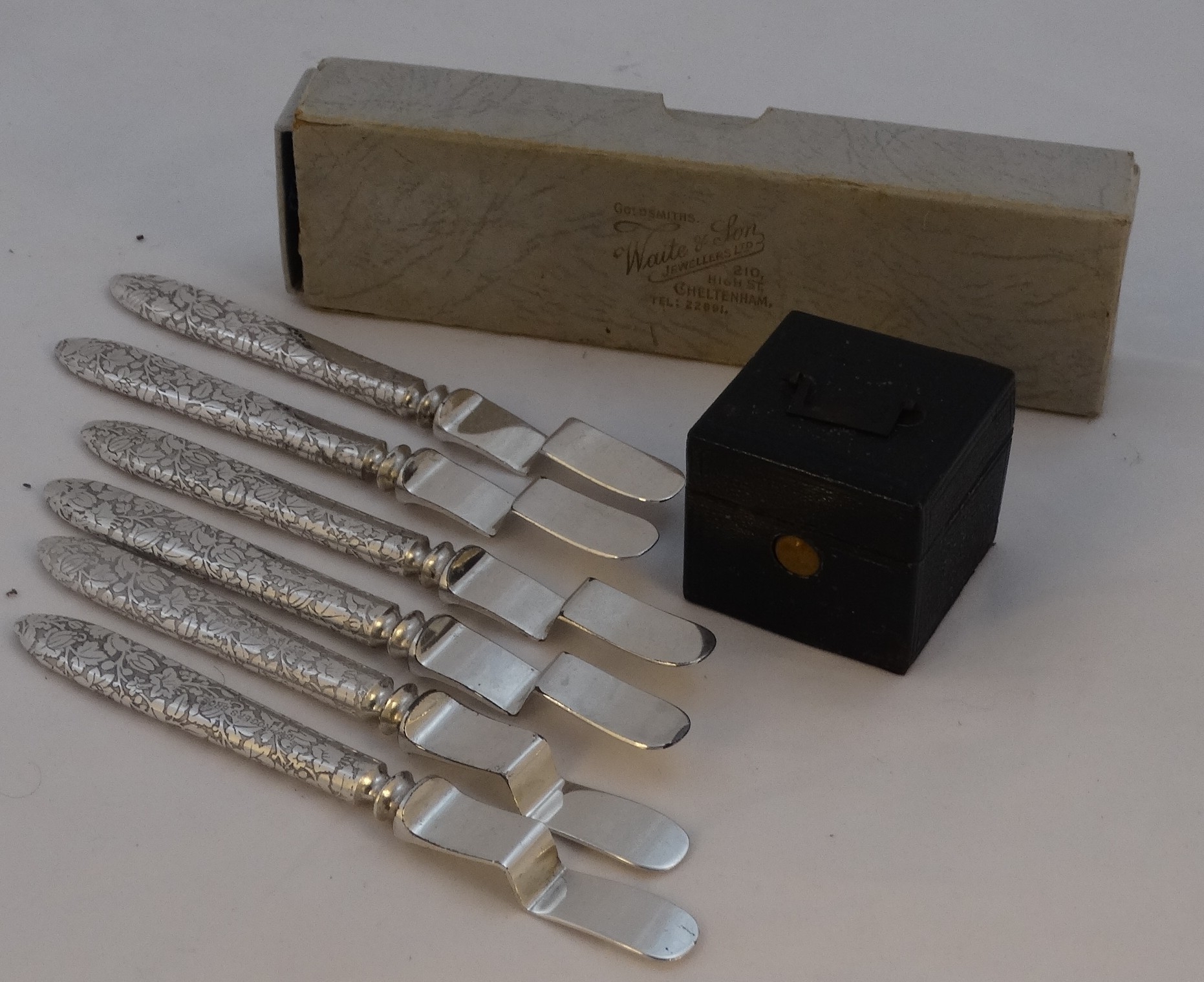 A Victorian travelling inkwell - square black leather clad with a bail handle to the cover, 4cm wide, together with a set of six unusual silver plated 'hot plate lifters'. (2)