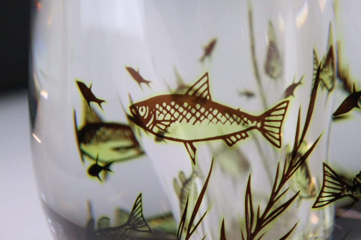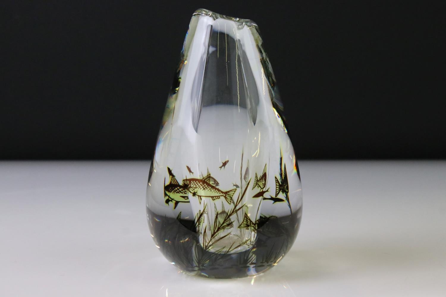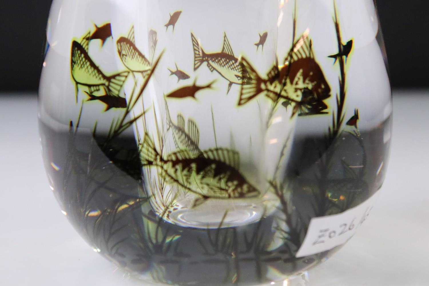 Orrefors clear glass vase by Edvard Hald with fish swimming amongst weed, signed and numbered 545M, 17cm high