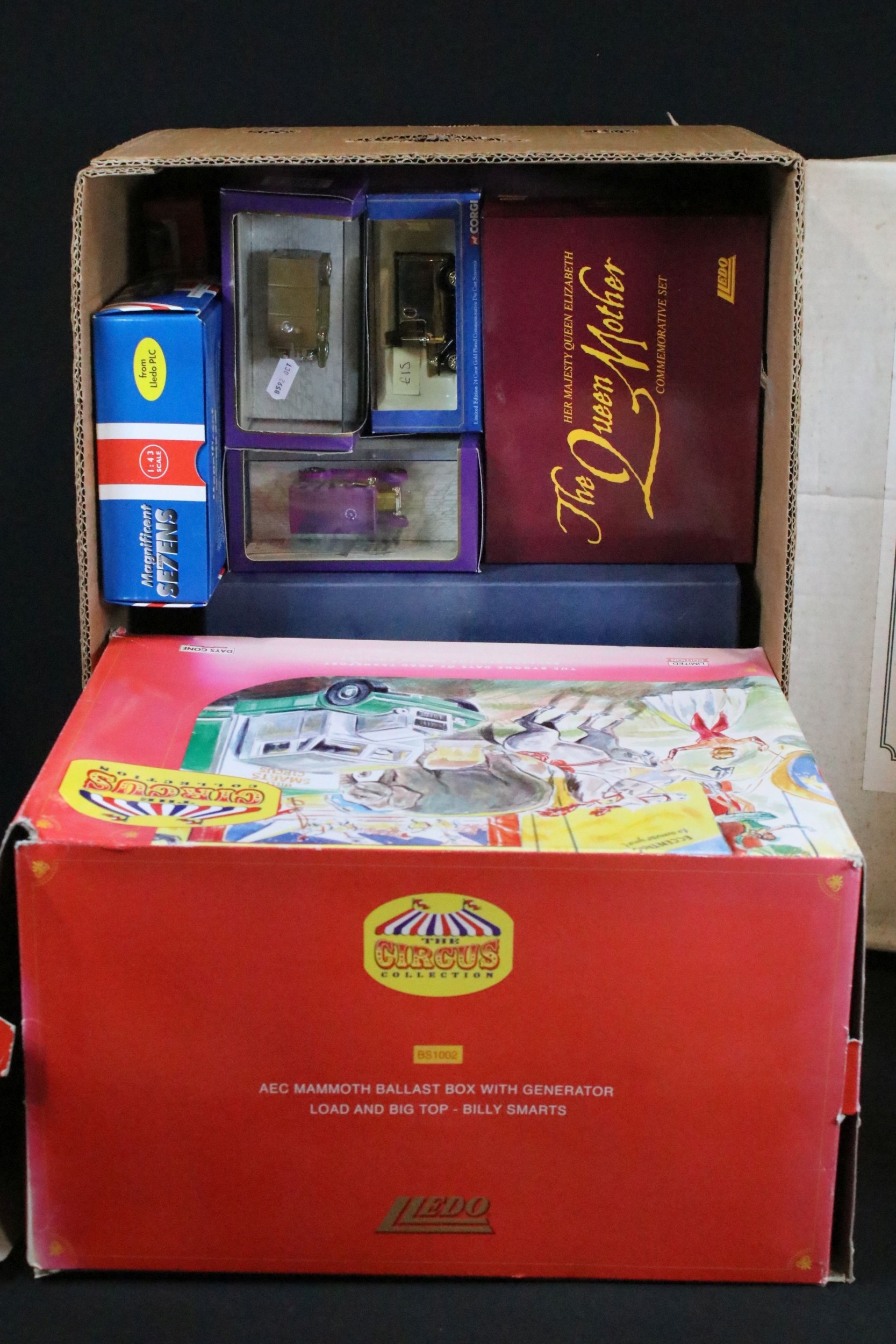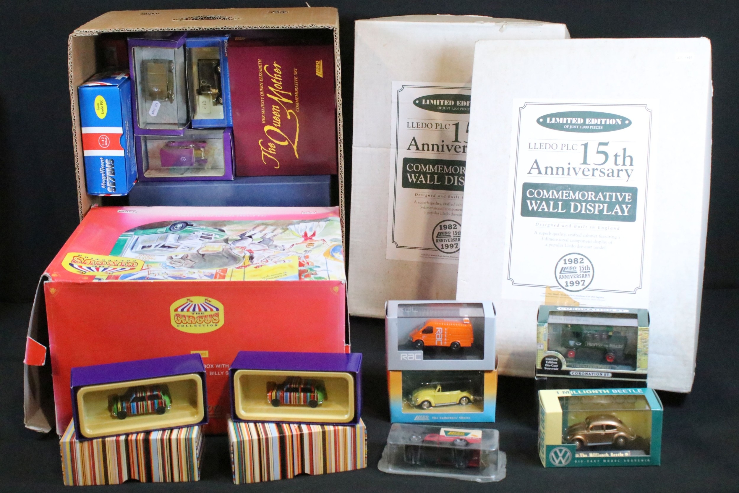 19 Boxed diecast models to include 2 x Lledo Paul Smith True Brit models, Lledo Days Gone Vanguards 1 Millionth Beetle, The Raleigh Limited Edition Set, Guinness 1999 Collection, etc, together with a boxed Lledo The Circus Collection BS1002 Billy Smarts and 2 x boxed Lledo ltd edn 15th Anniversary Commemorative Wall Display's (2 Boxes)