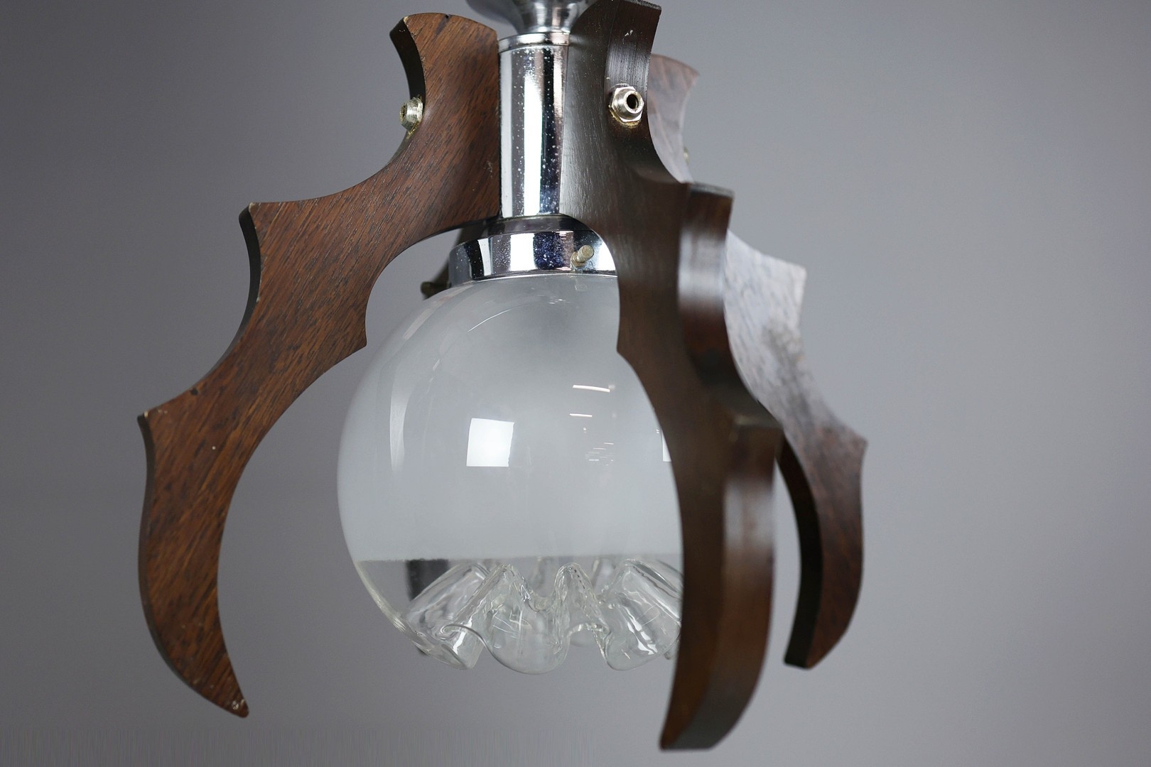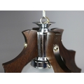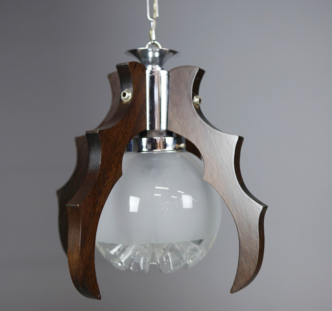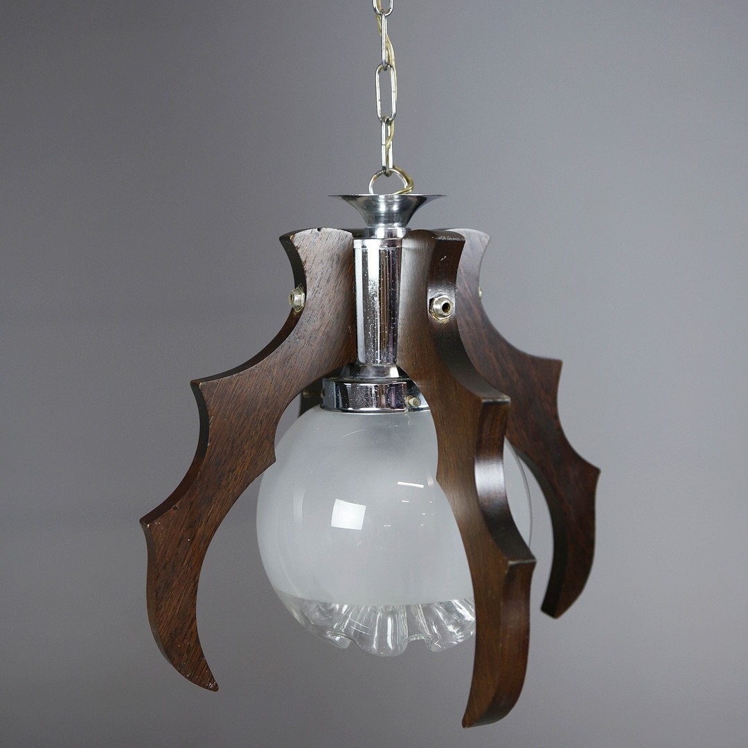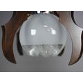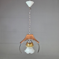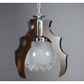 1970s ITALIAN MEZZEGA PENDANT LIGHT IN CHROME AND SHAPED WOOD WITH GLASS SHADE. 30cm H x 35cm W with adjustable height chain drop.