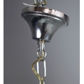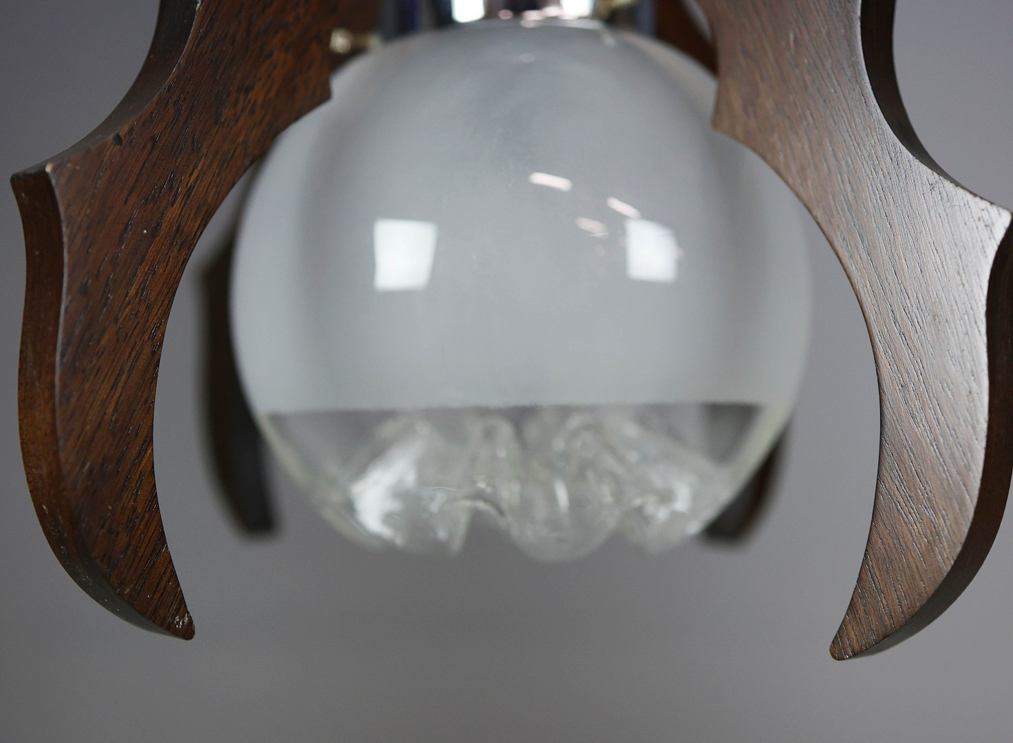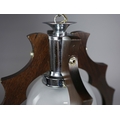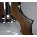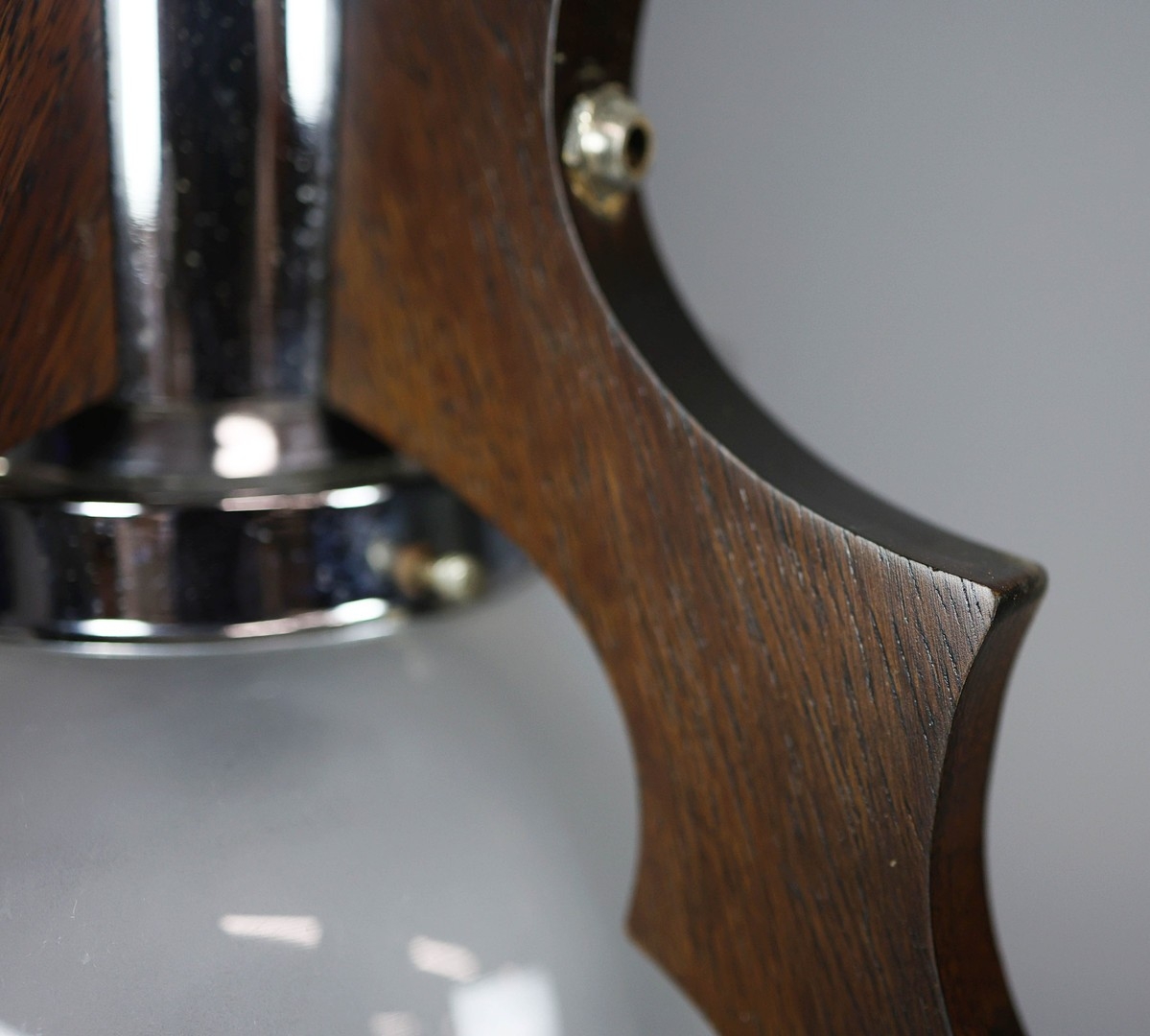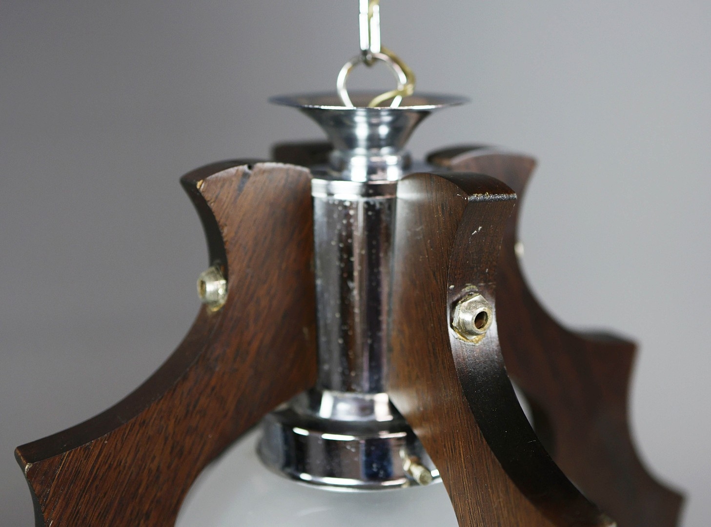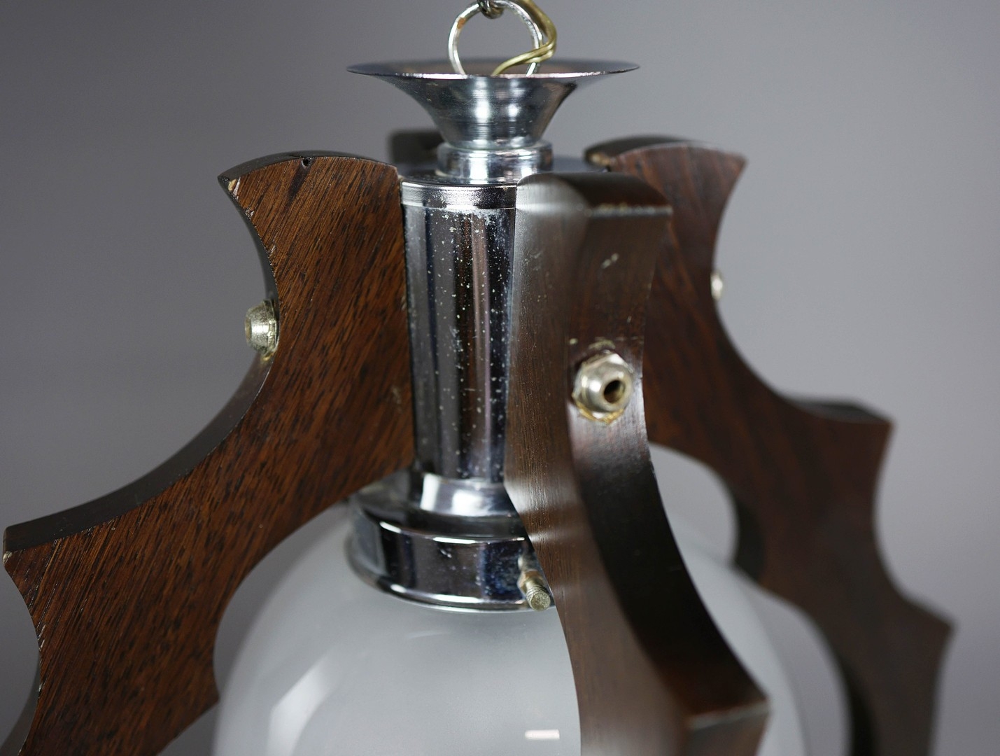 1970s ITALIAN MEZZEGA PENDANT LIGHT IN CHROME AND SHAPED WOOD WITH GLASS SHADE. 30cm H x 35cm W with adjustable height chain drop.