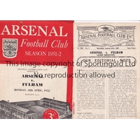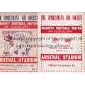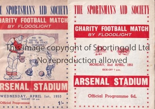 NEUTRAL MATCHES AT ARSENAL FC Two programmes for the Charity Football matches both played at Arsenal Stadium, including the first and third annual match between the Champion Boxers v Leading Jockeys 2/4/1951, minor creases, team changes and scores entered. and 1/4/1953, creased, rusty staple, detached cover page and paper loss to back cover page, both with minor wear and tears to edges. Poor to generally good