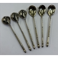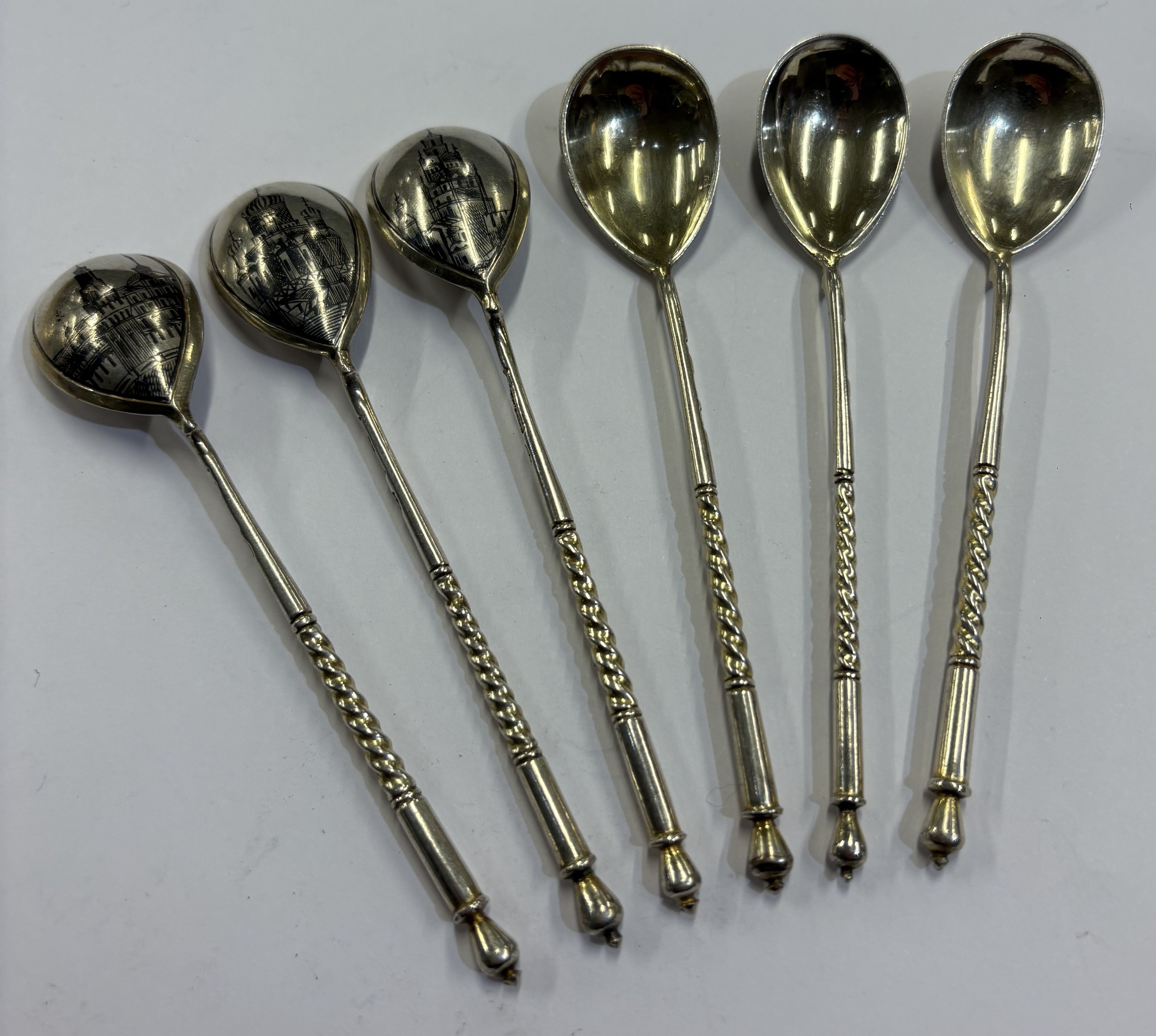 A rare set of six 19th Century Russian silver and niello spoons with temple decoration to reverse. Approx. 71 grams. Est. £250 - £300.