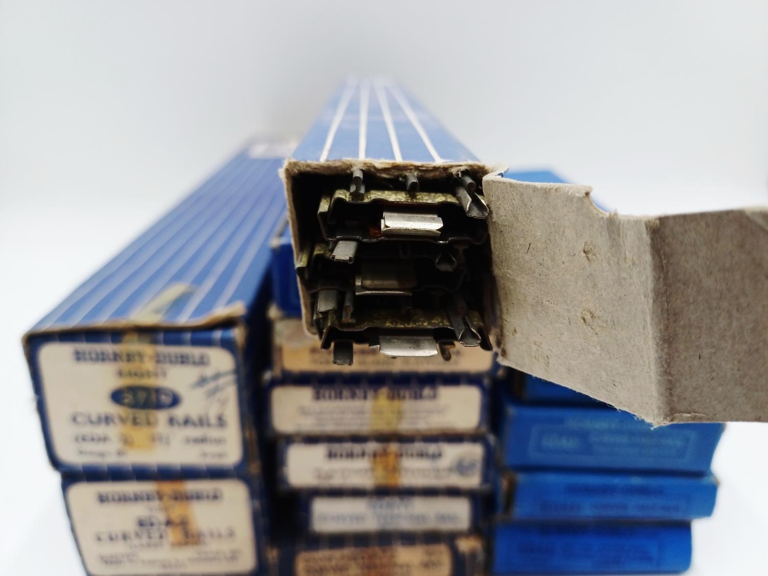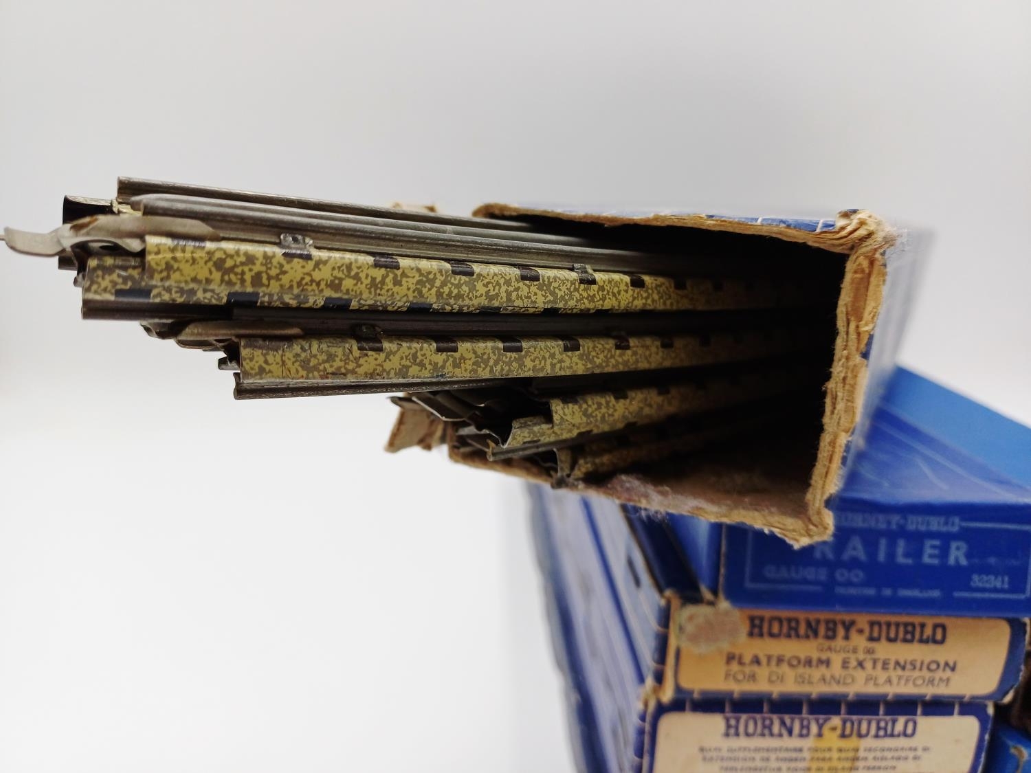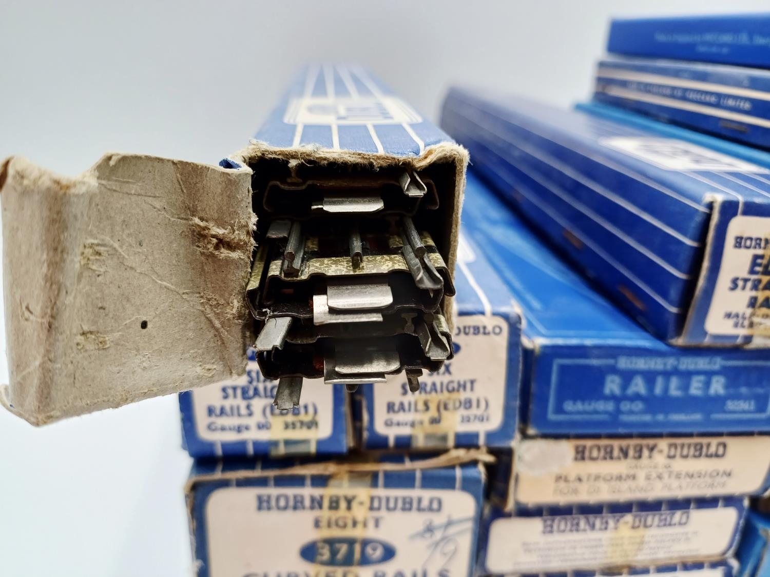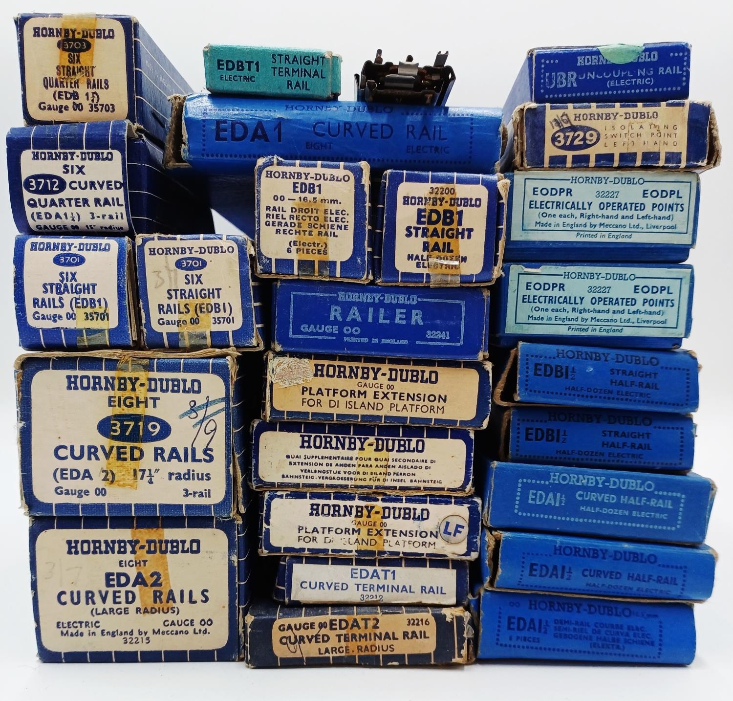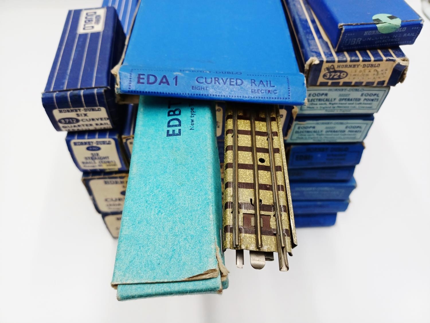 Approx. twenty four boxed Hornby Dublo 00 gauge model railway accessories to include 3712 curved quarter rail, EODPR electrically operated points, 3701 six straight rails, platform extension, 3729 isolating switch point (lefthand) etc.