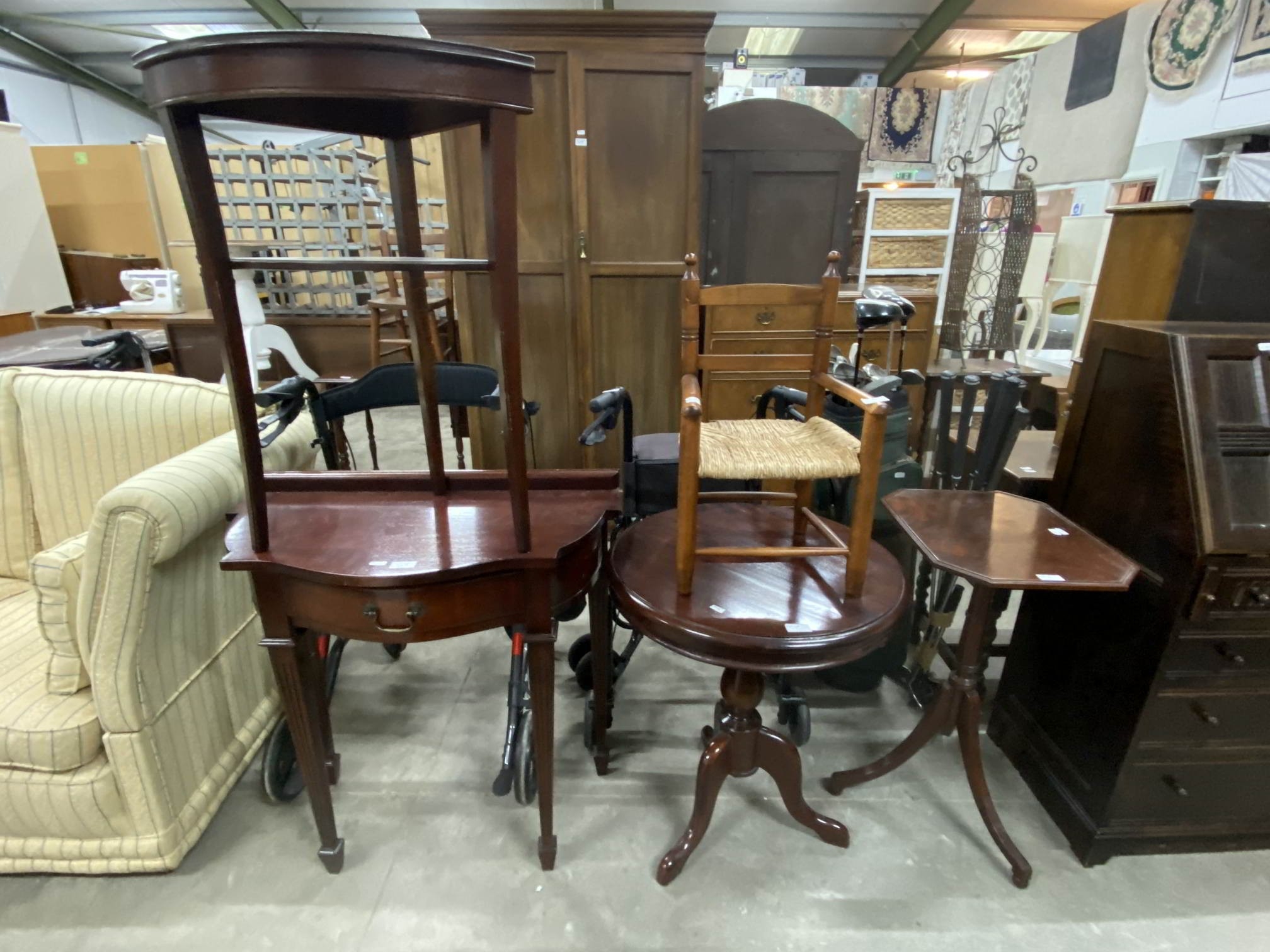 Mahogany hall table 80H 75W 38D, 2 mahogany pedestal lamp tables 68H 58cm diameter and 71H 44W 37D etc