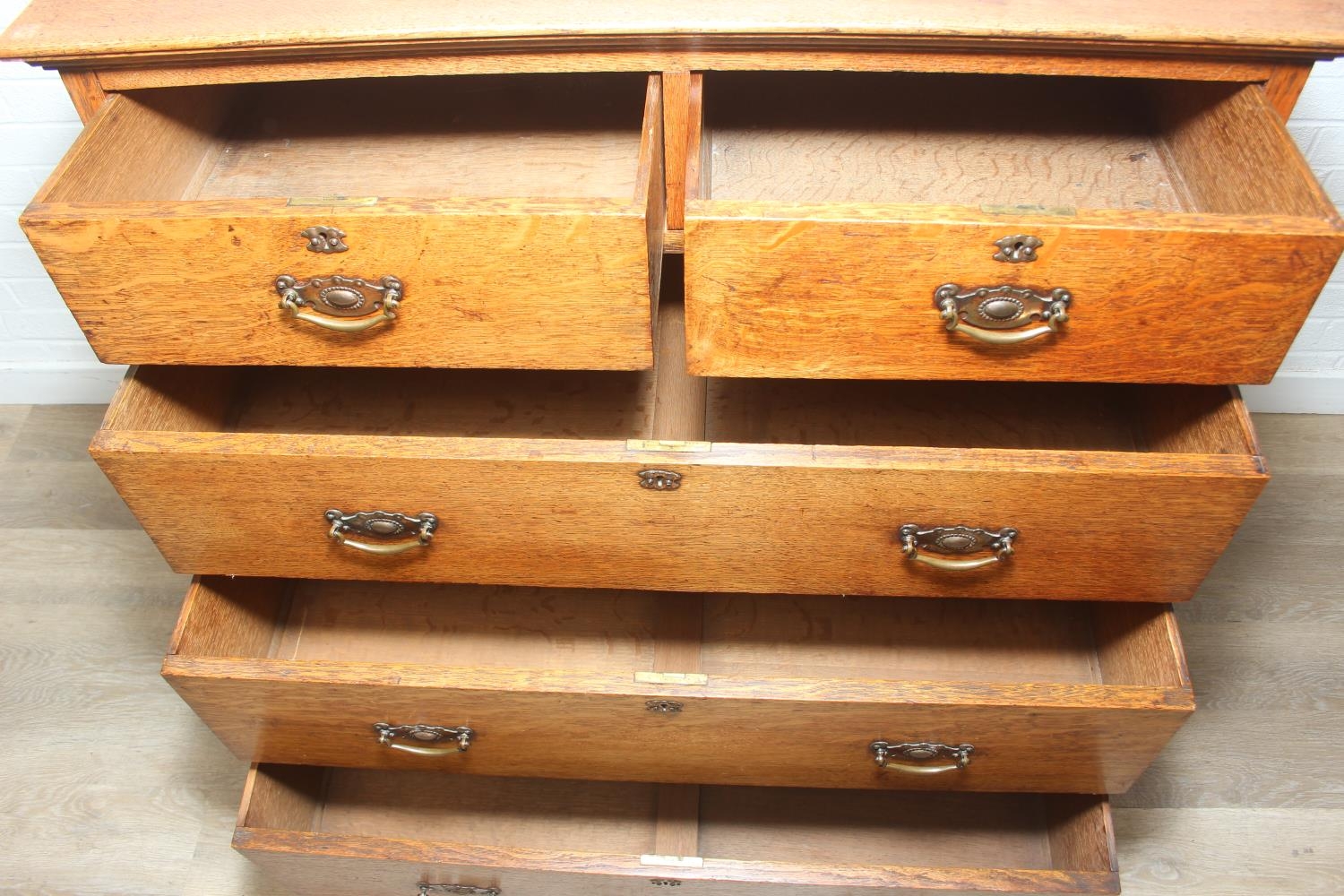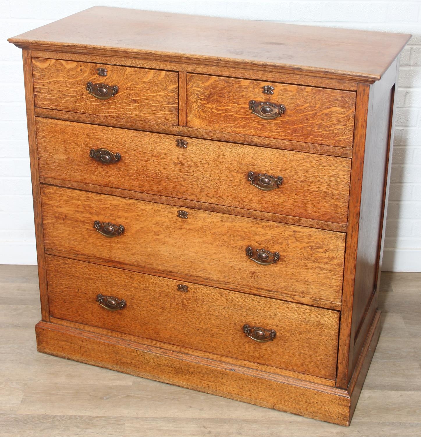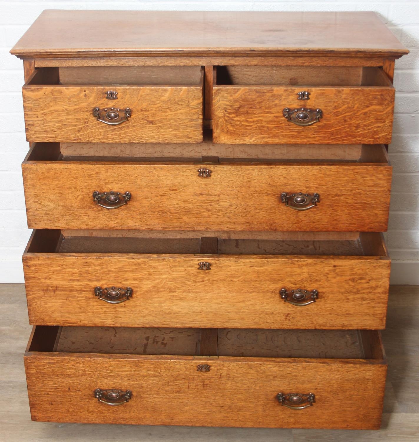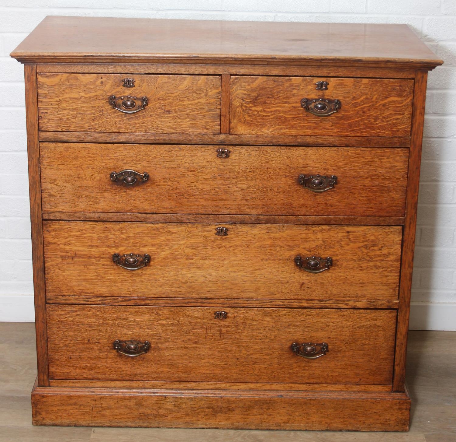Antique oak two over three chest of drawers with decorative brass handles, 106cm x 52cm x 105cm
