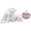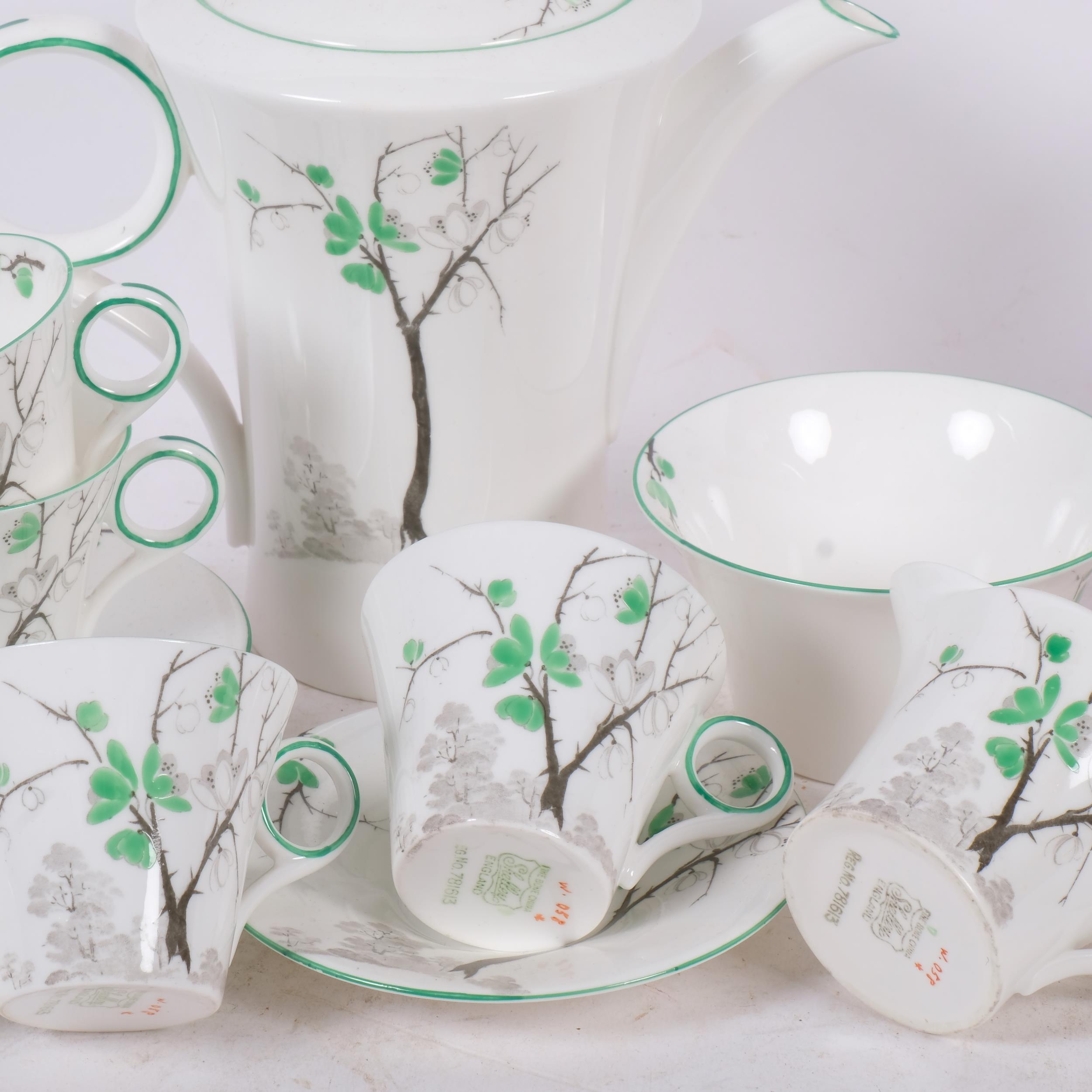 Art Deco Shelly Regent Gorse Green pattern coffee service for 5 people, registered no. 781613, together with a Bohemian overlay glass sweetmeat jar and cover