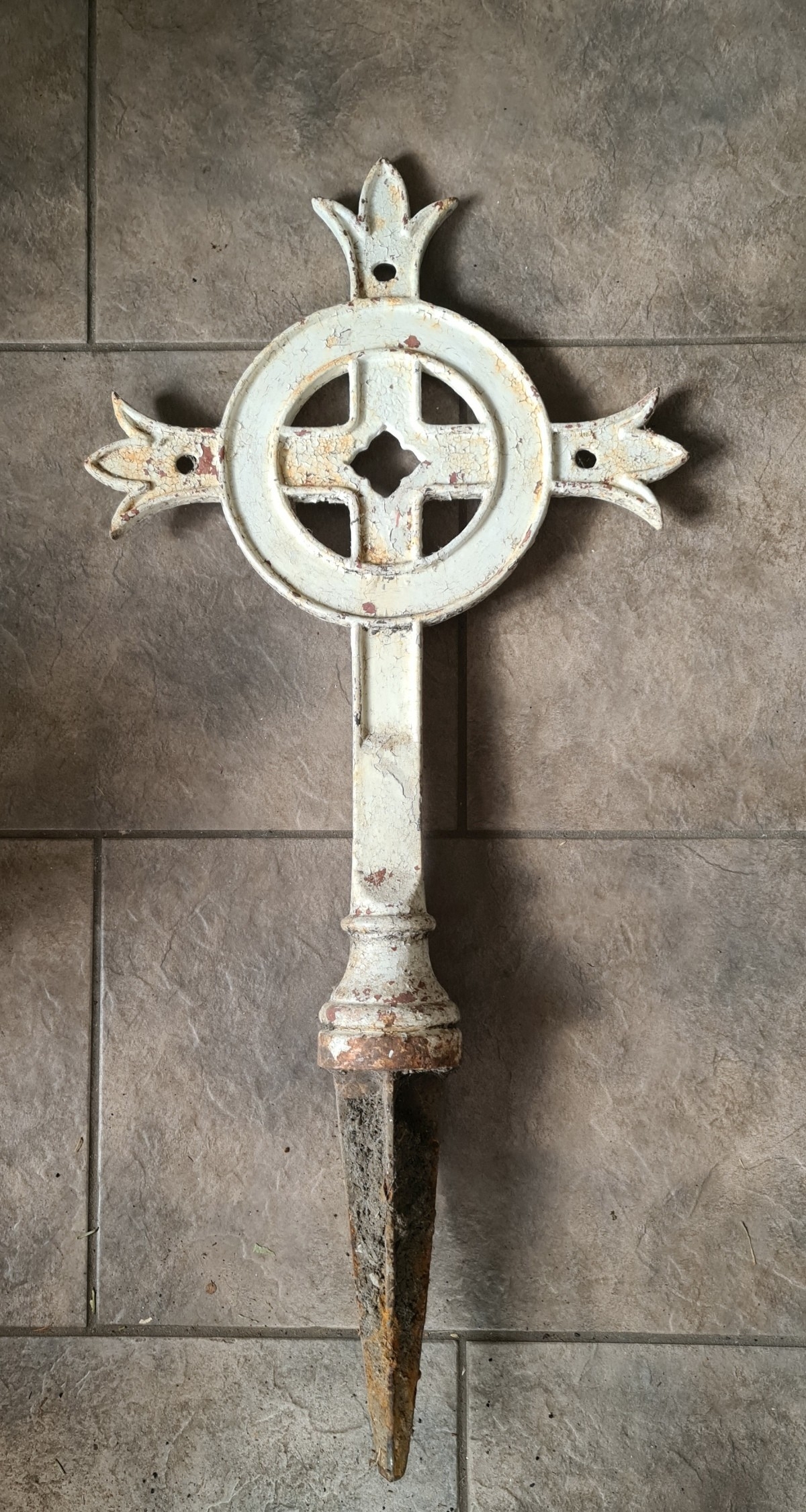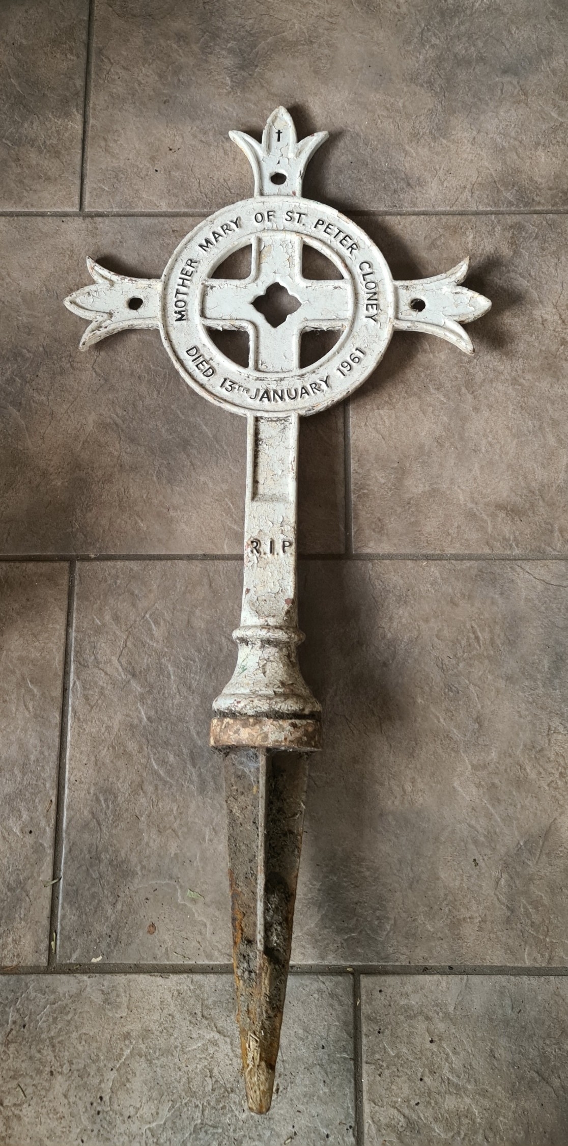 Cast Iron Memorial Cross Painted White Dated 13th January 1961 Dedicated to Mother Mary of St Peter Cloney R I P Measures 41 inches tall by 19 inches wide. Shipping is available. Please ask for a quote before bidding. Where possible we combine shipping costs. Remember, if you are the highest bidder above reserve on this Lot you have bought the item and are legally responsible for the item. Viewing is recommended in either person or via video link. Contact us to arrange.
