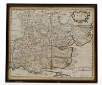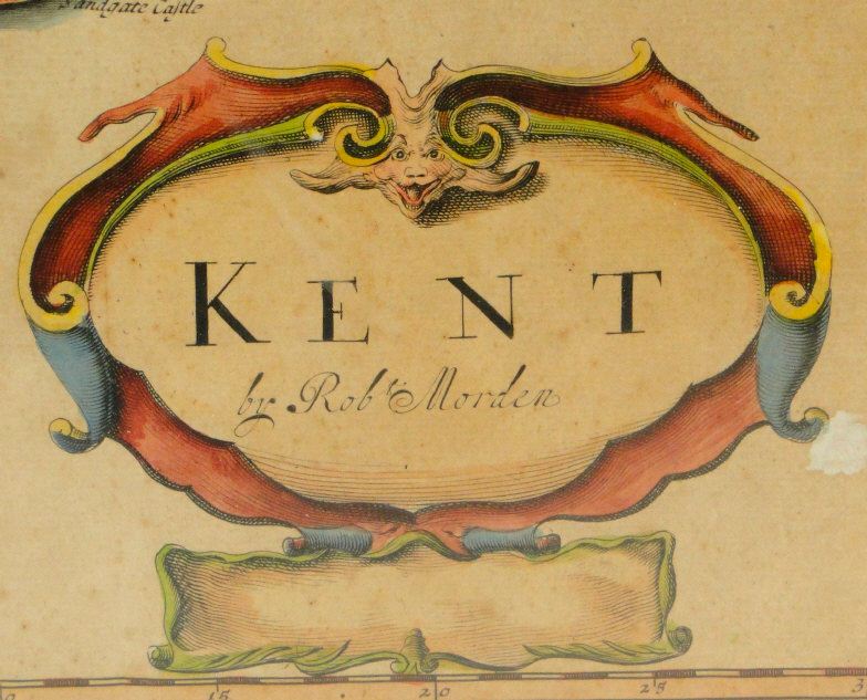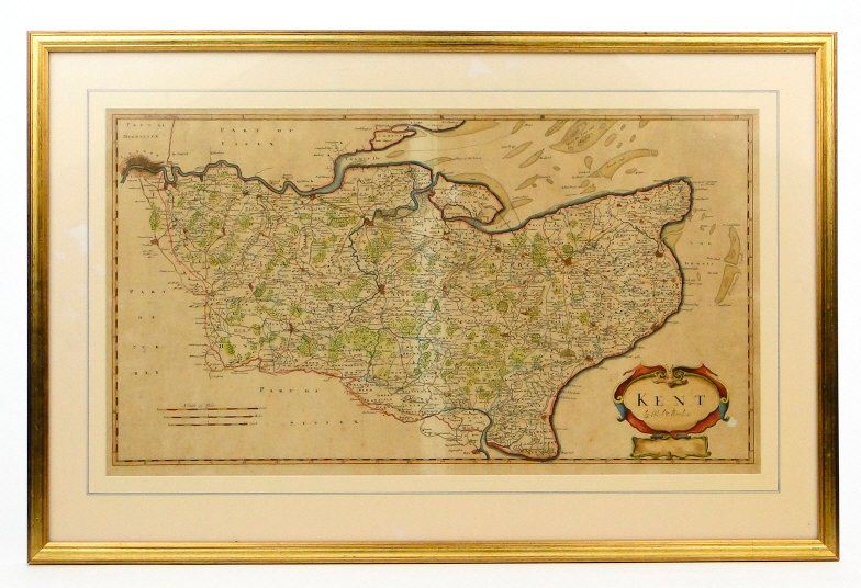 18th Century hand coloured map of Kent by Robert Mordan, mounted and framed, 36cm x 63cm