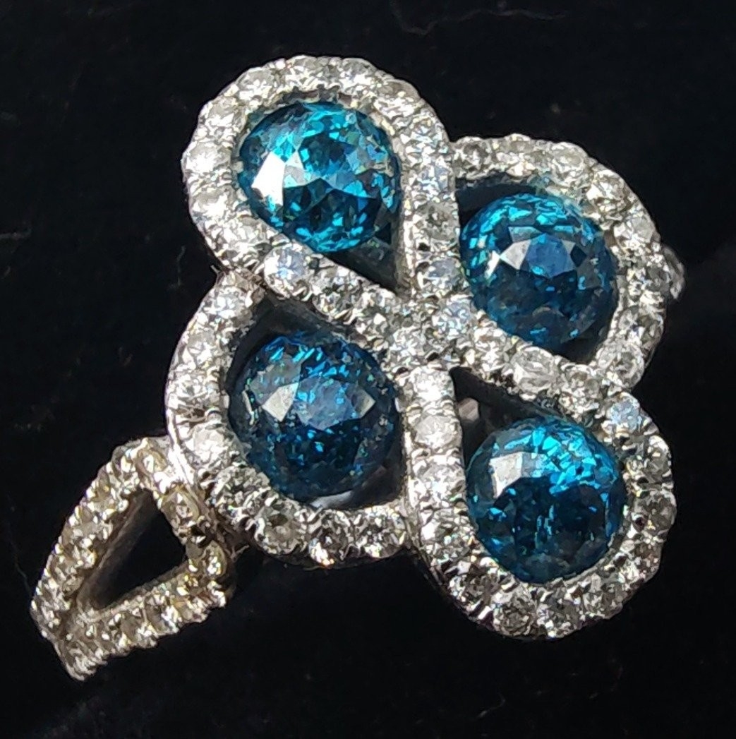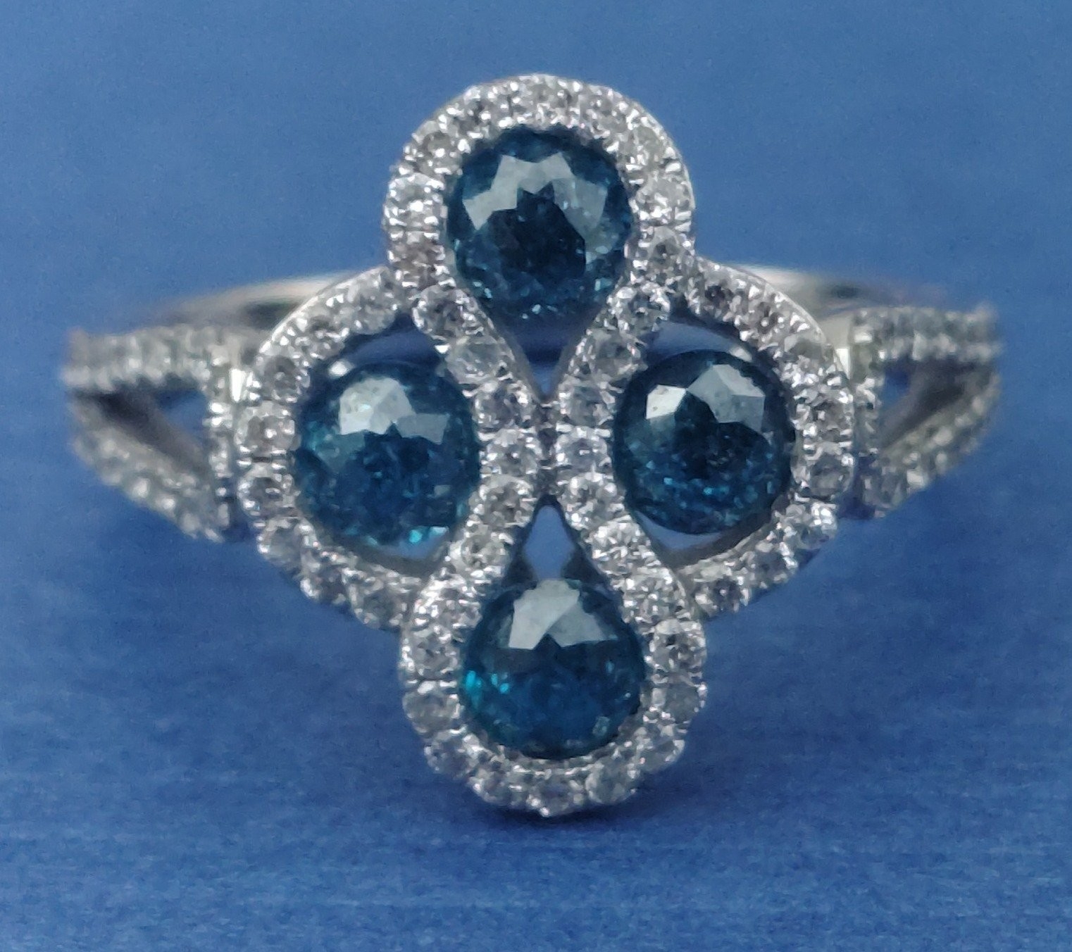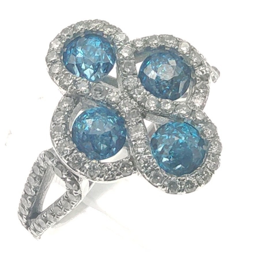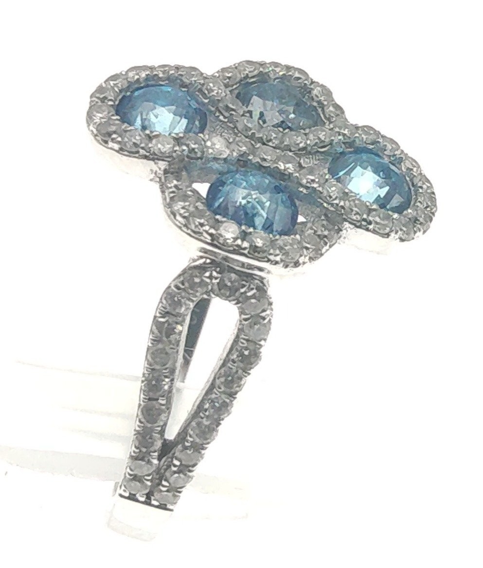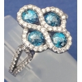 A four stone BLUE DIAMOND ring set in 14K mount with multiple small diamonds. Each blue Diamond approx 0.20 carat x4. Ring size N/O
