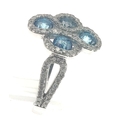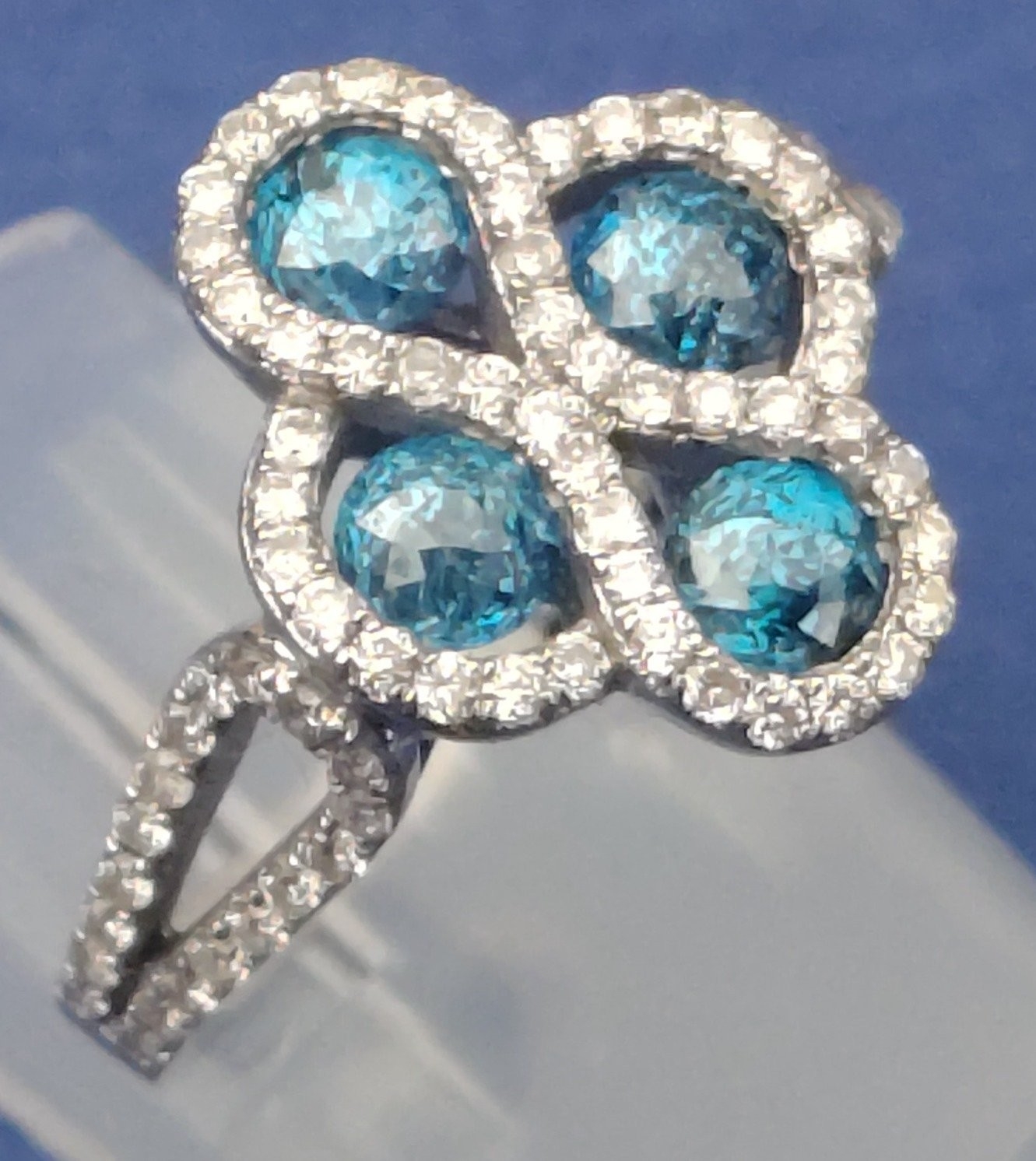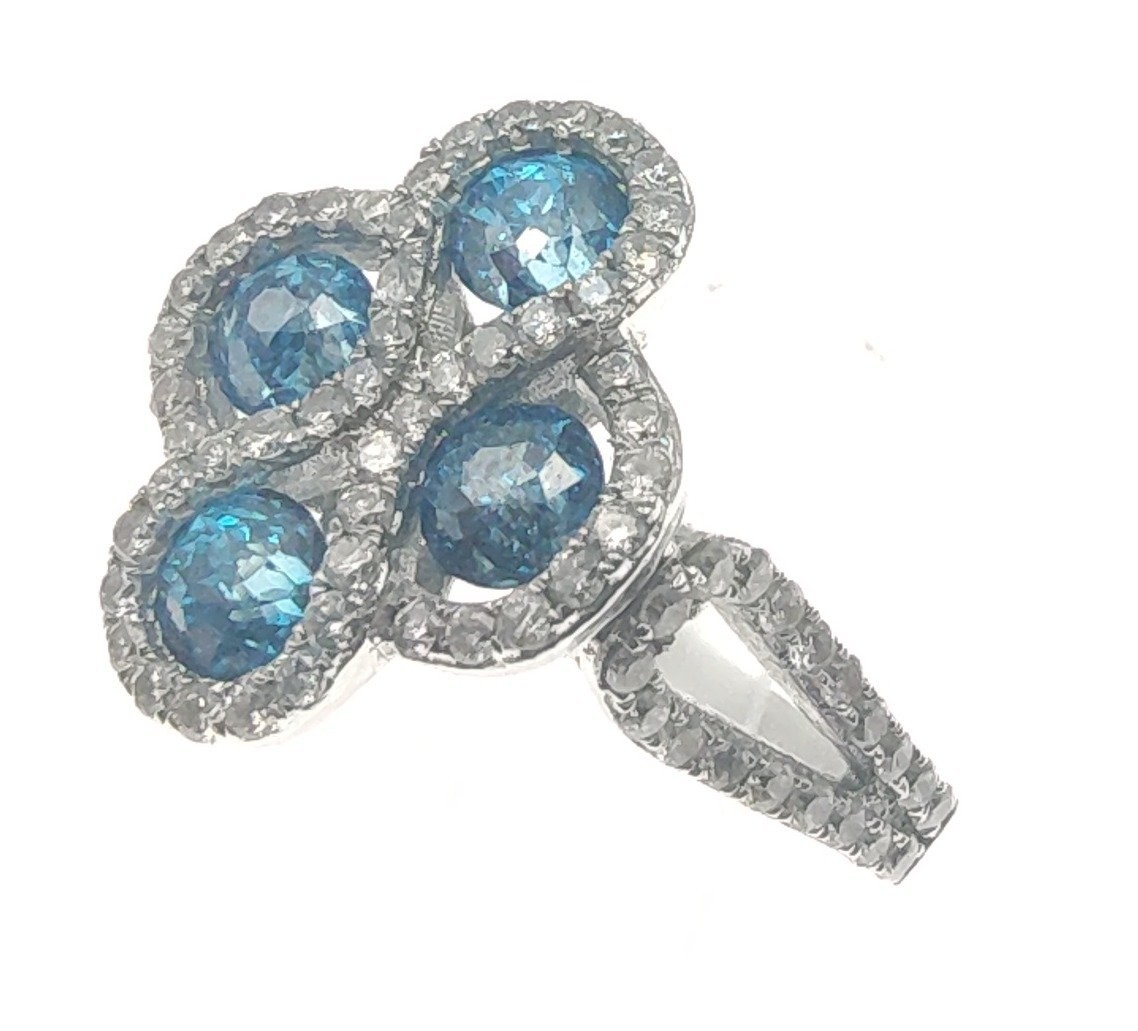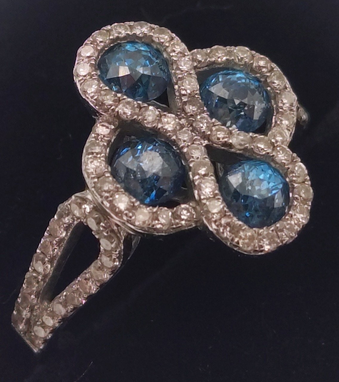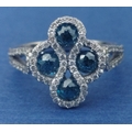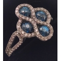A four stone BLUE DIAMOND ring set in 14K mount with multiple small diamonds. Each blue Diamond approx 0.20 carat x4. Ring size N/O