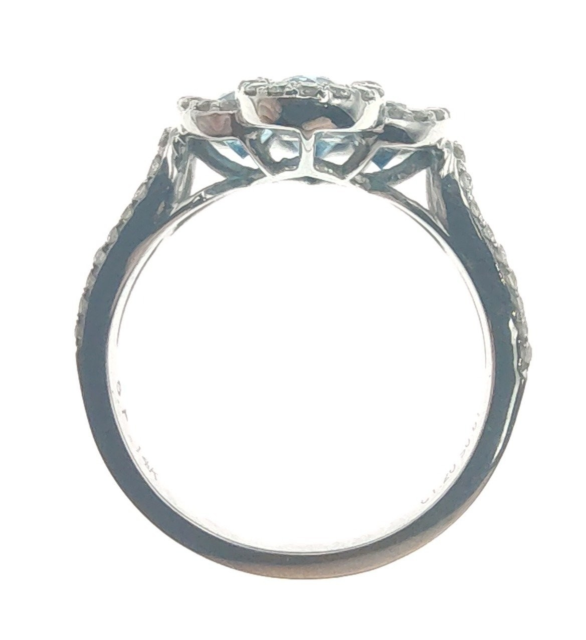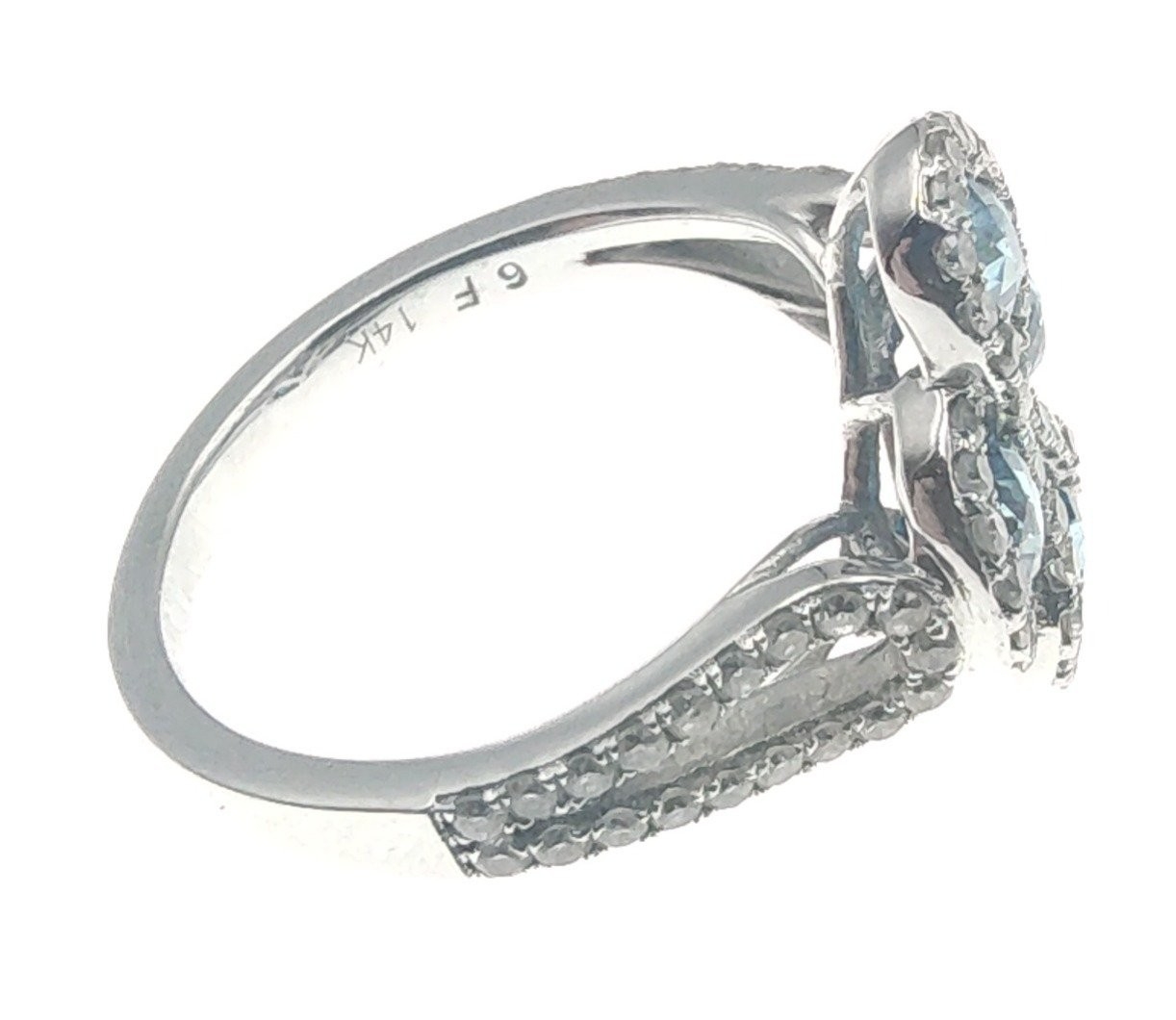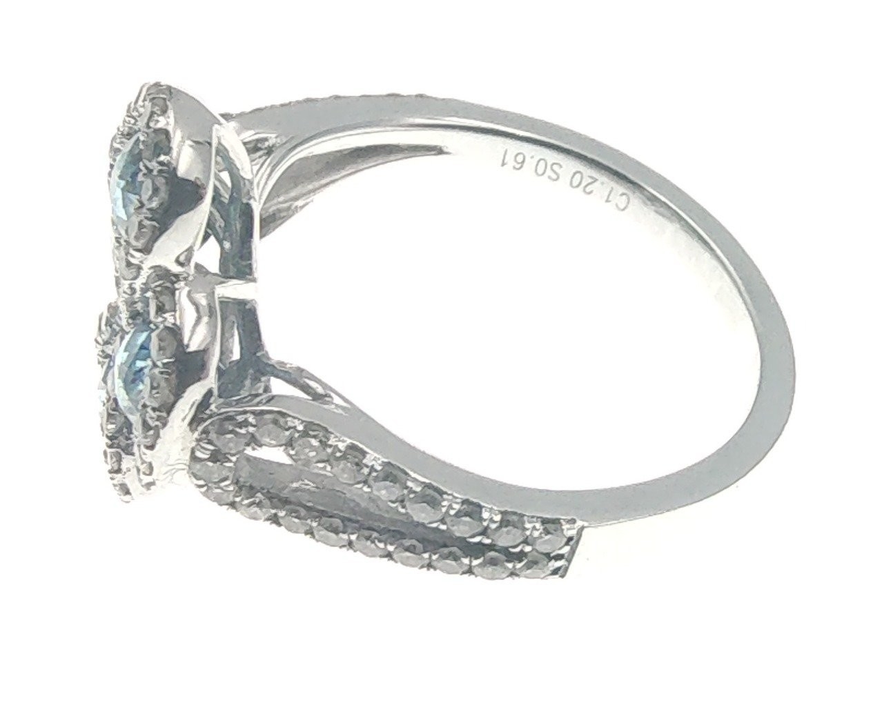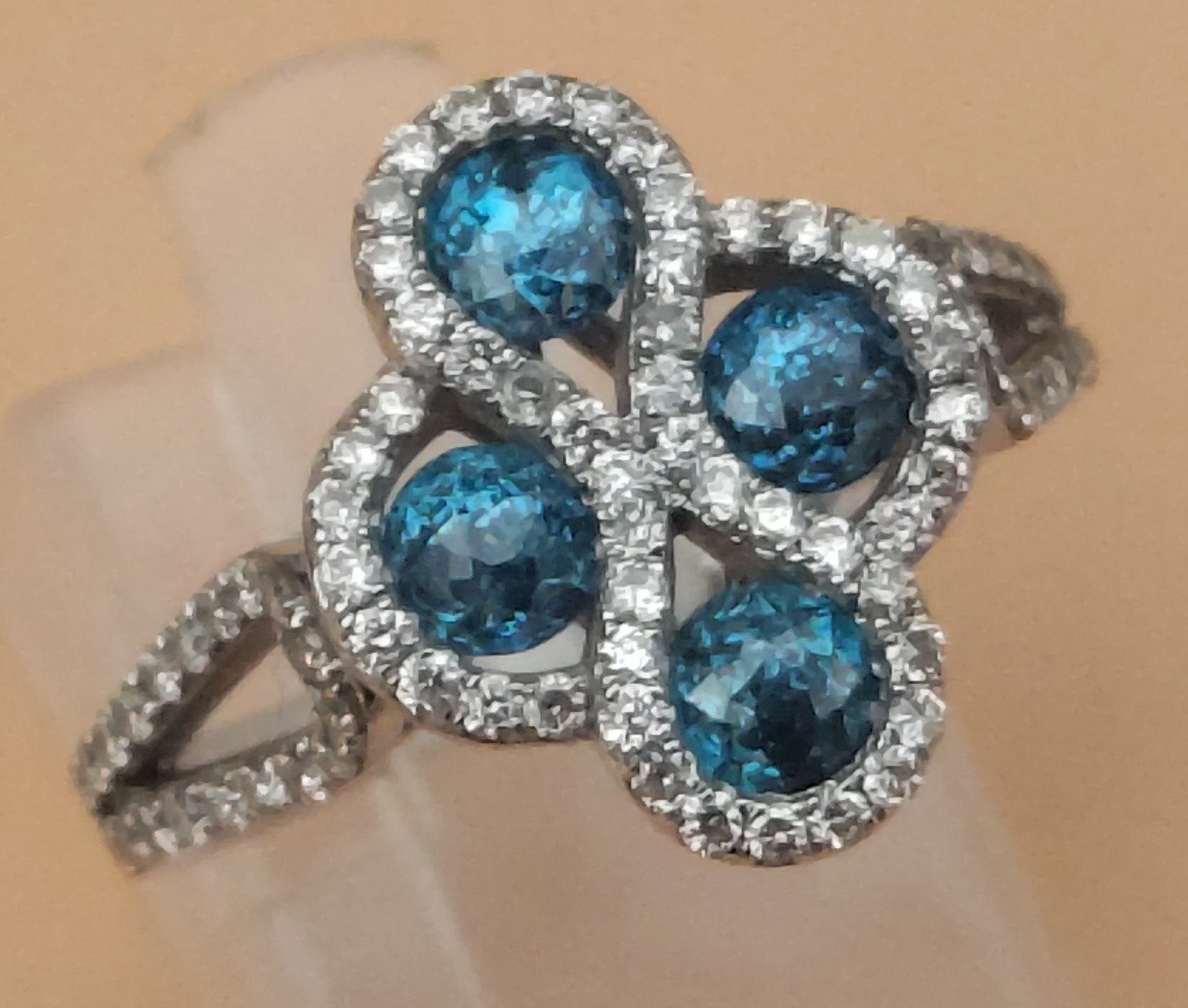 A four stone BLUE DIAMOND ring set in 14K mount with multiple small diamonds. Each blue Diamond approx 0.20 carat x4. Ring size N/O